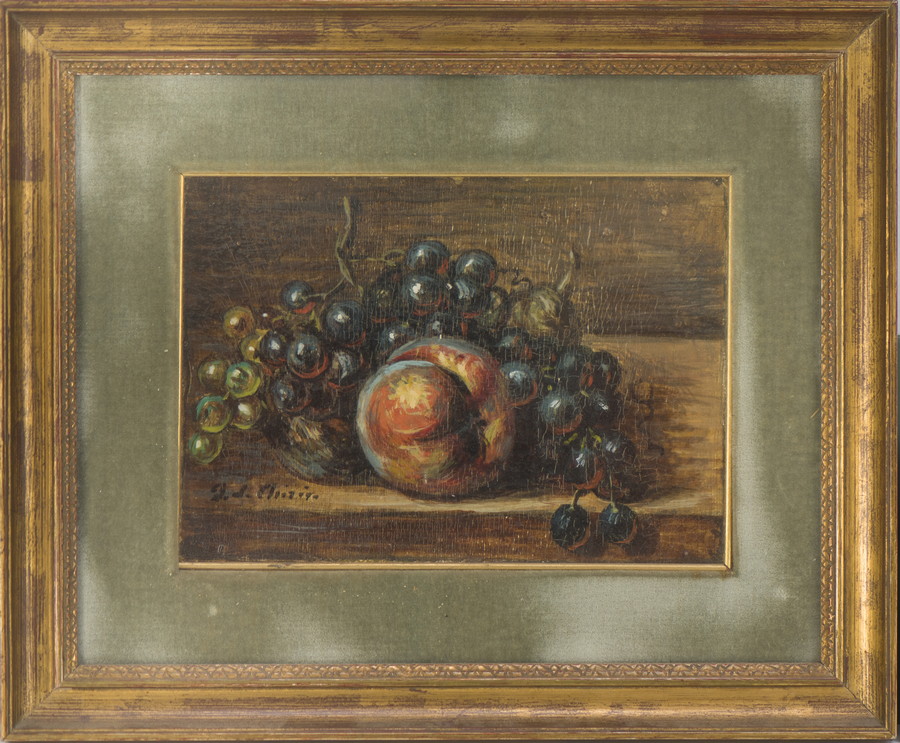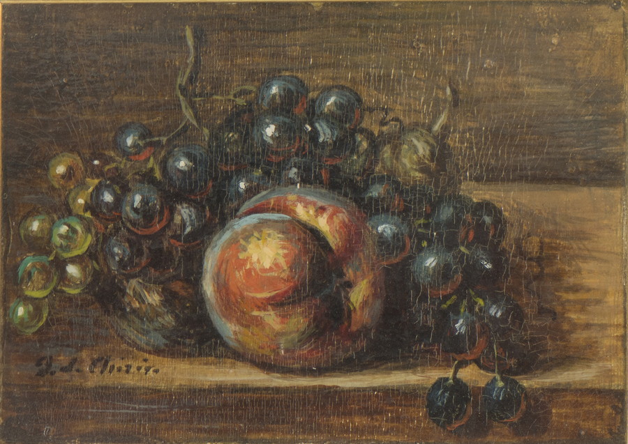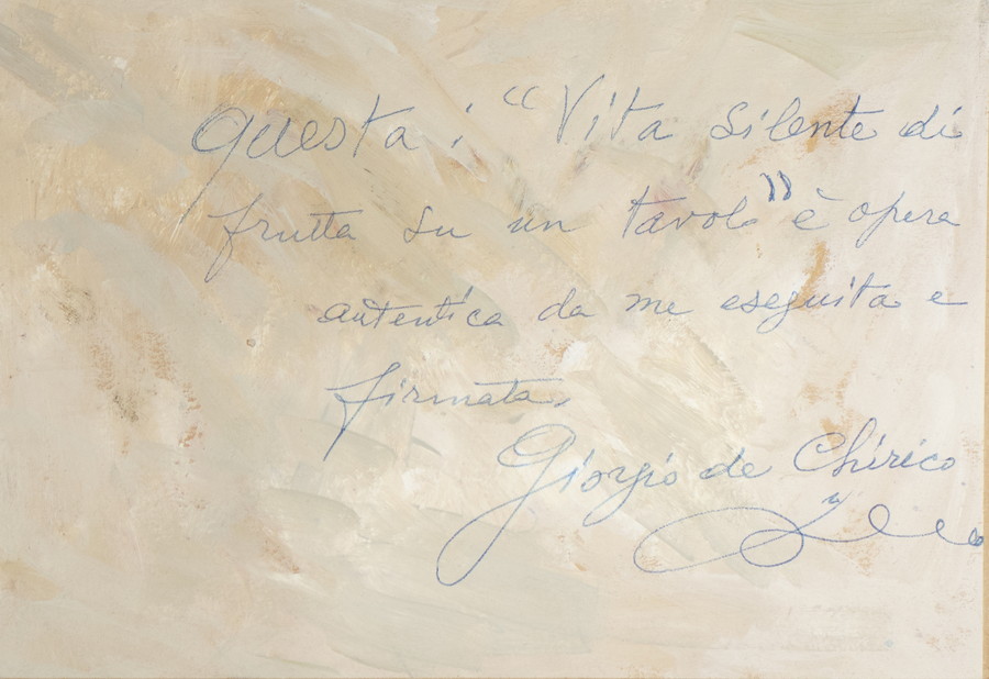 DE CHIRICO GIORGIO (1888 - 1978) VITA SILENTE DI FRUTTA SU UN TAVOLO (META' ANNI '50). Olio su cartoncino. Cm 30,00 x 20,00. firma
