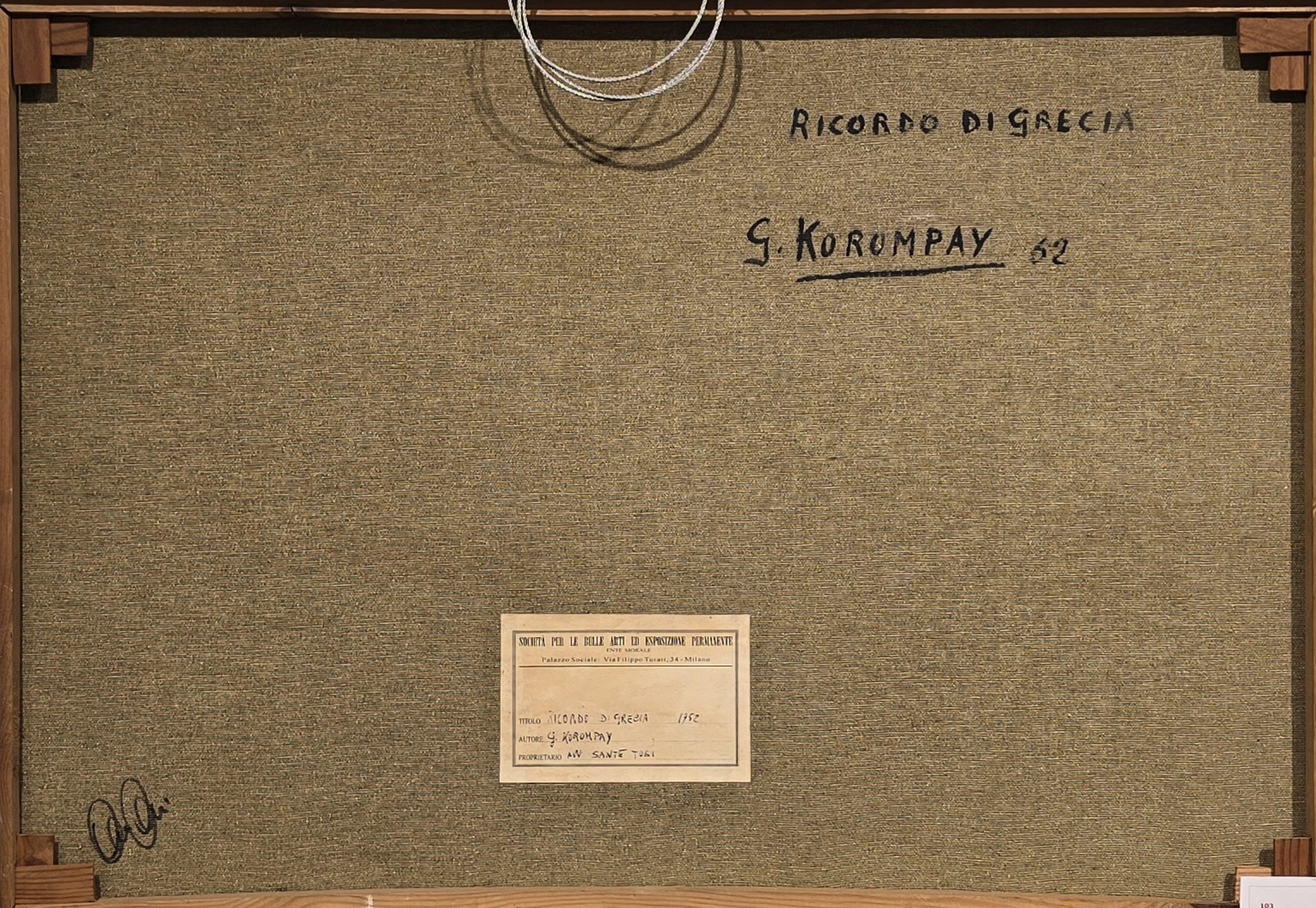 GIOVANNI KORONPAY, 50 X 70 cm, olio su tela , titolo “ ricordo di Grecia “ , anno 1962 , firmato sul fronte in basso a destra, al retro titolo firma e anno, etichetta " Società per le belle arti ed esposizione permanente, Ente morale Palazzo Sociale Milano