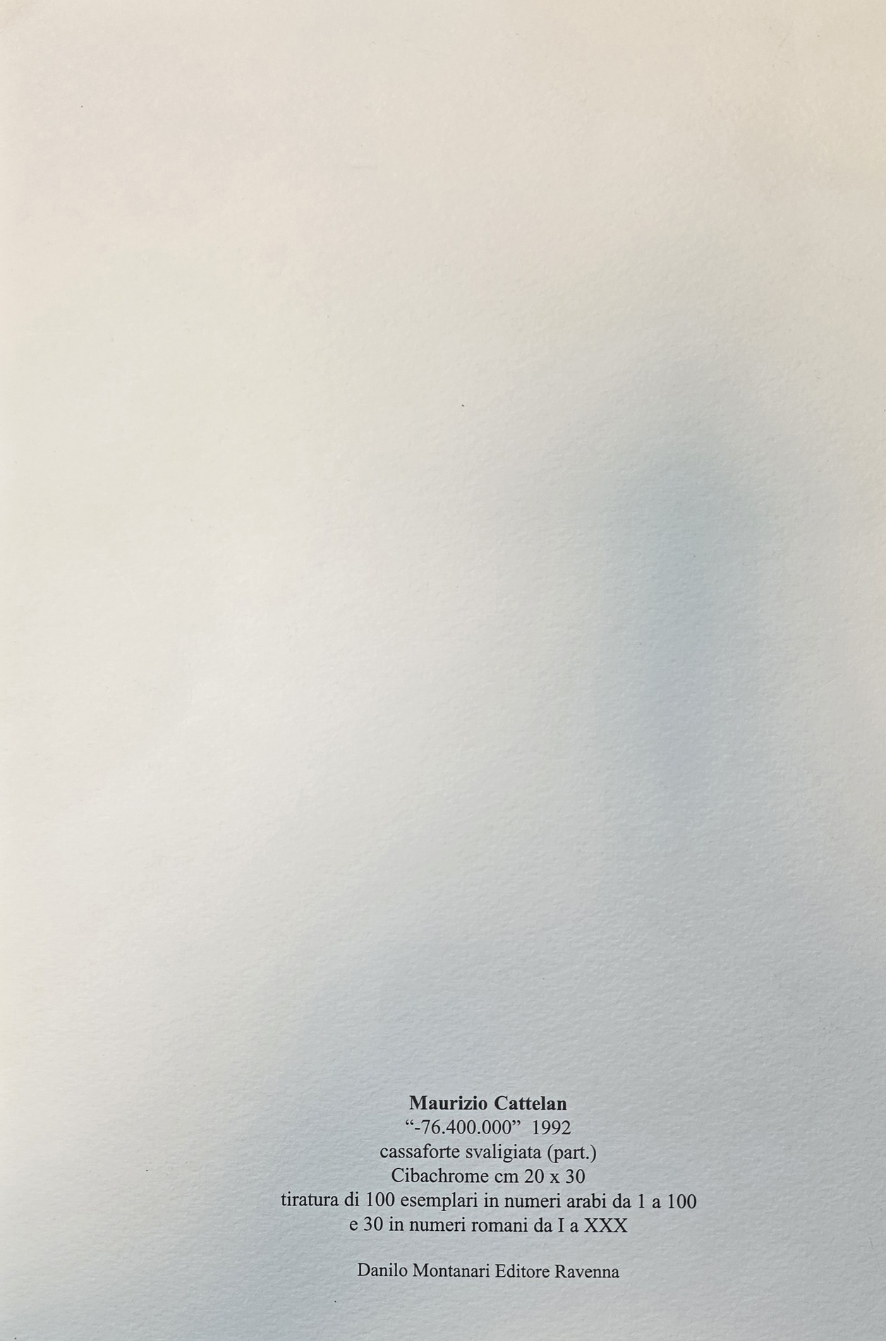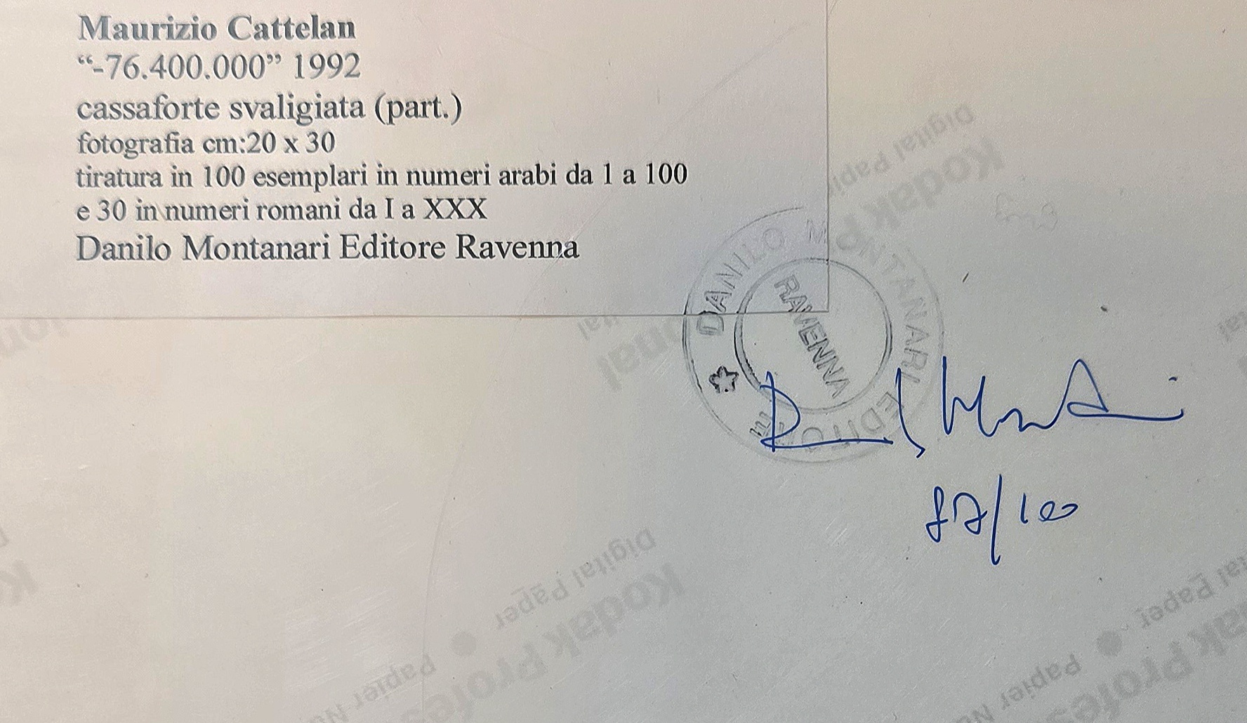 Tiratura di 100 esemplari in numeri arabi da 1 a 100 e 30 in numeri romani da I a XXX.