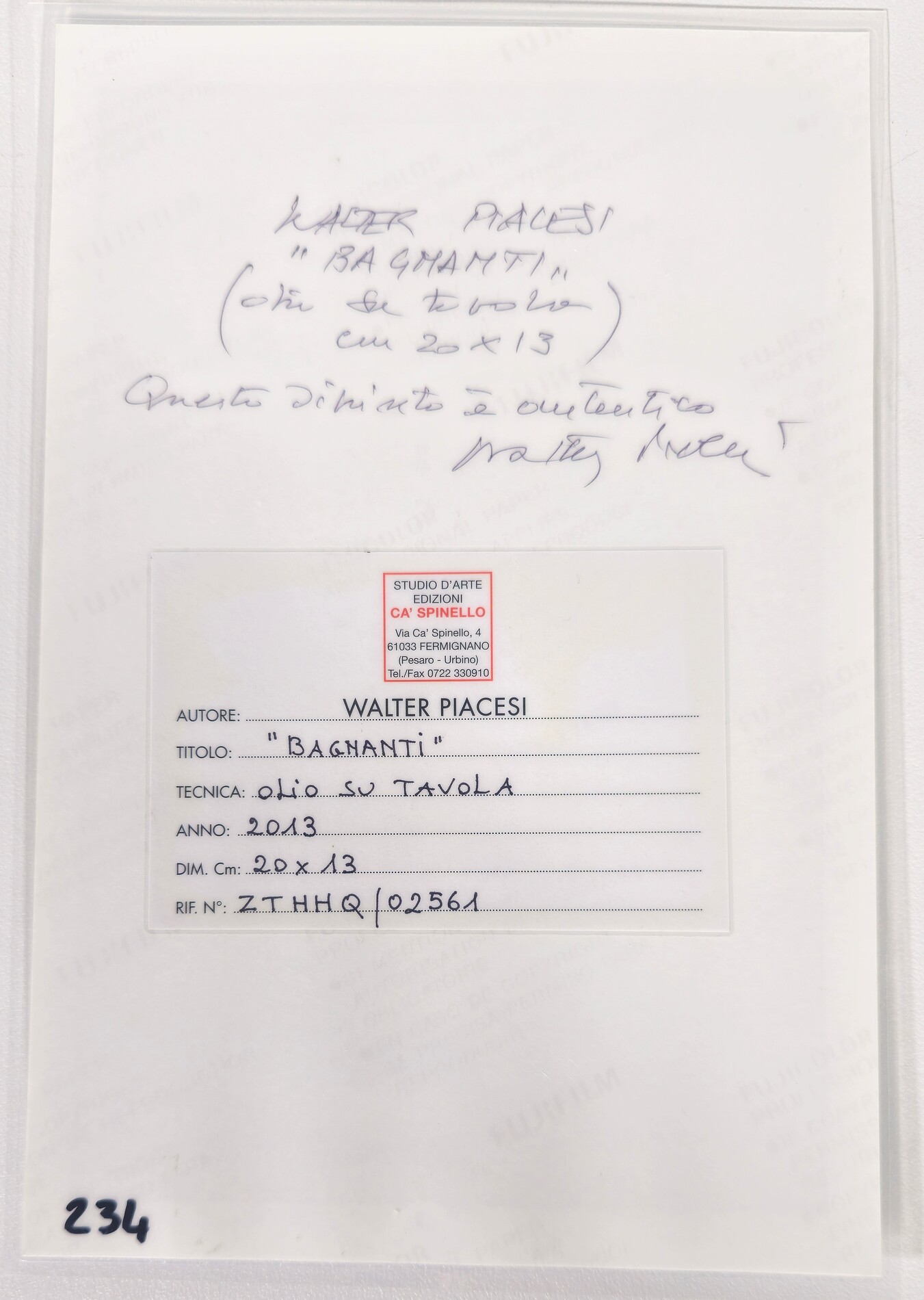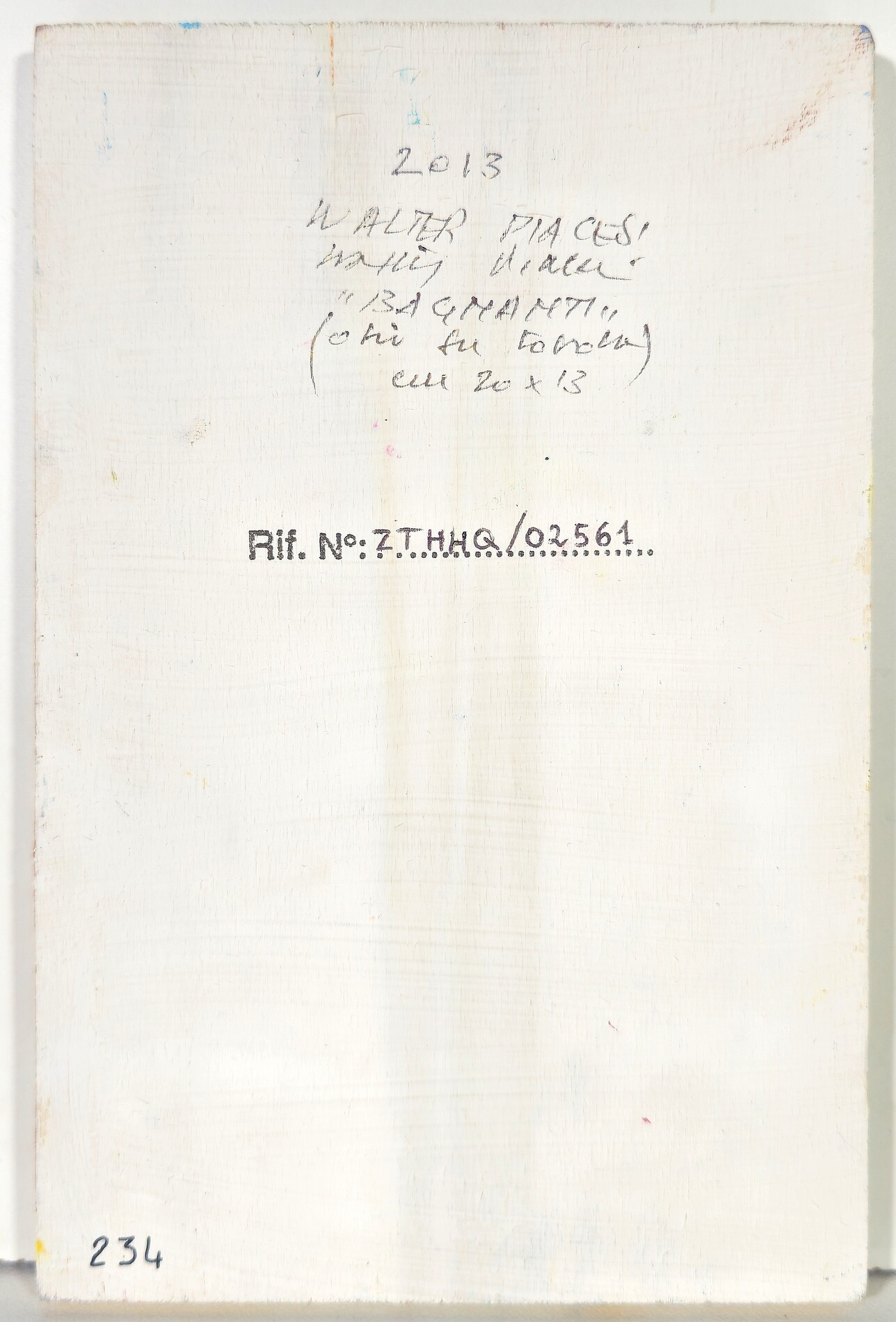Firma, titolo, tecnica, dimensioni, anno e numero di archivio al retro dell'opera