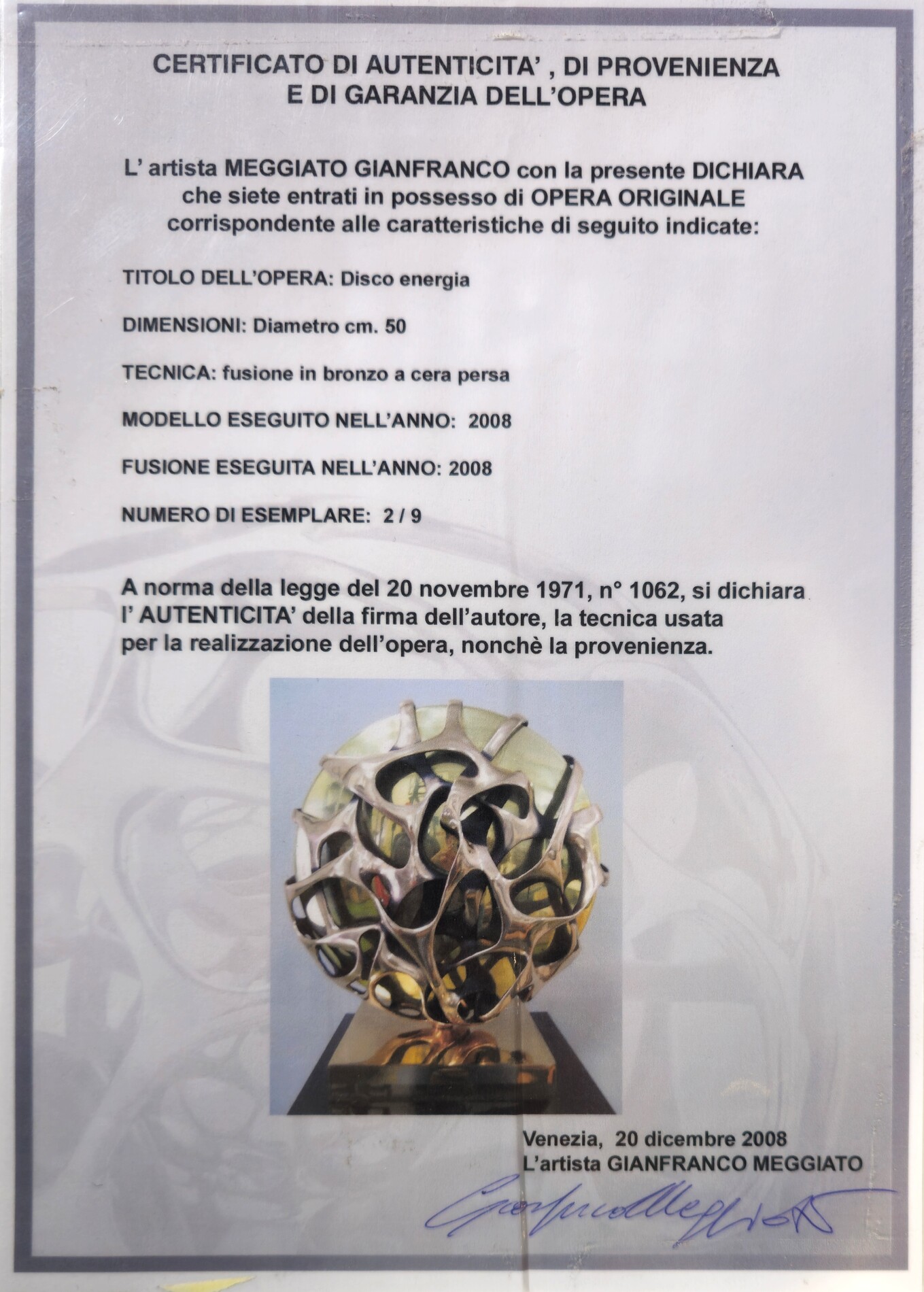 GIANFRANCO MEGGIATO, Diametro 50 cm, Dimensioni totali 57 x 50 x 20 cm, ”Disco Energia". Scultura: fusione in bronzo a cera persa. Anno 2008 Esemplare Numero 2 di 9. Certificato di autenticità a cura dell'artista. Firma e numerazione alla base
