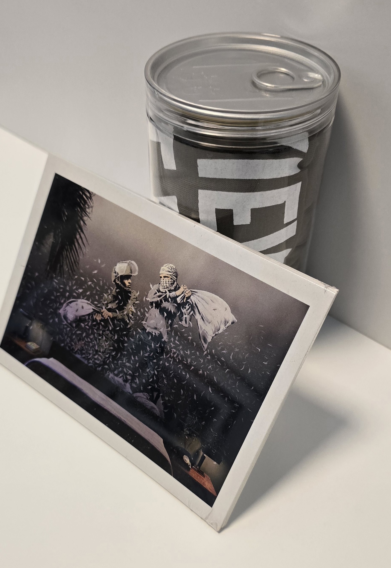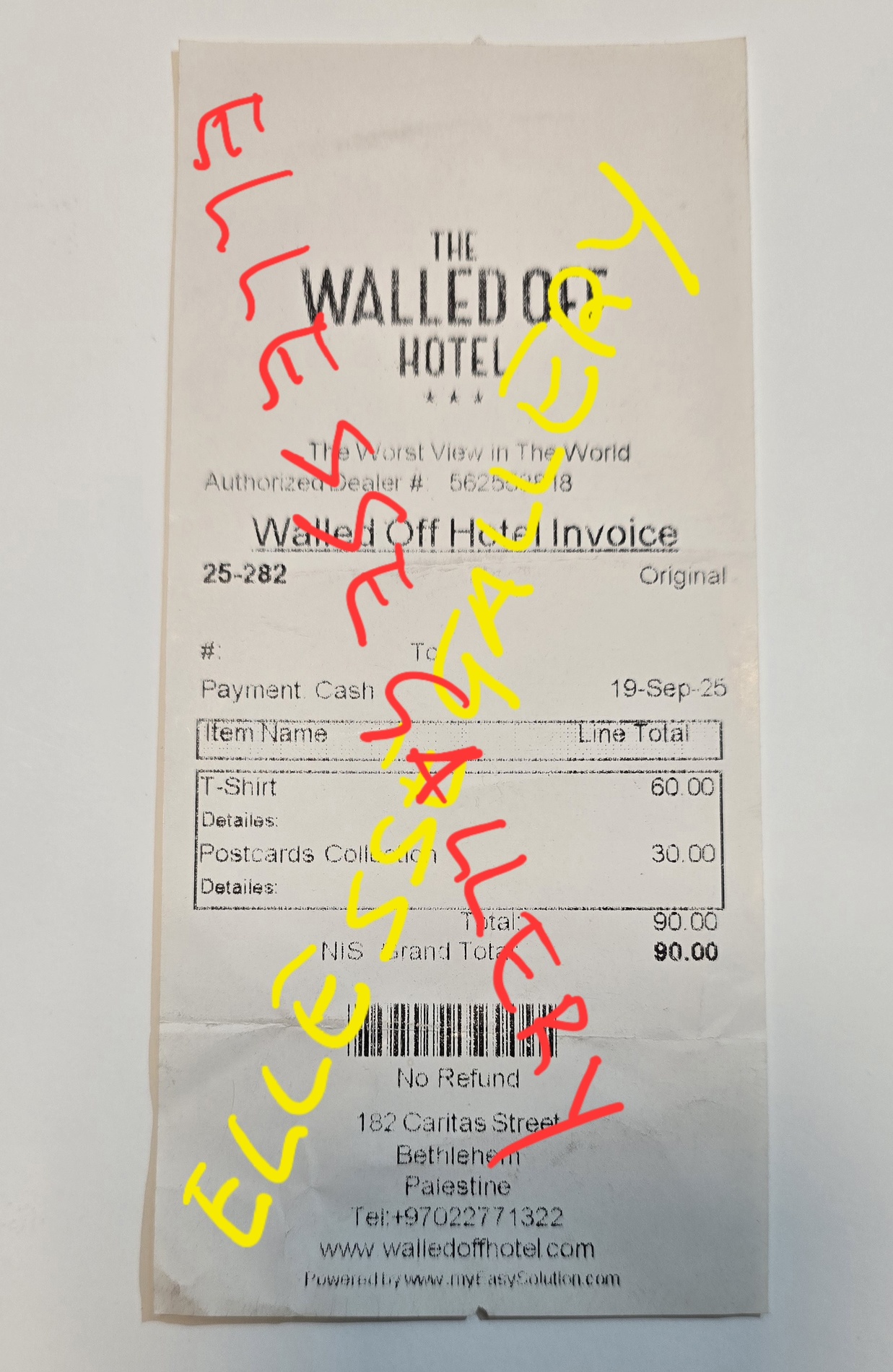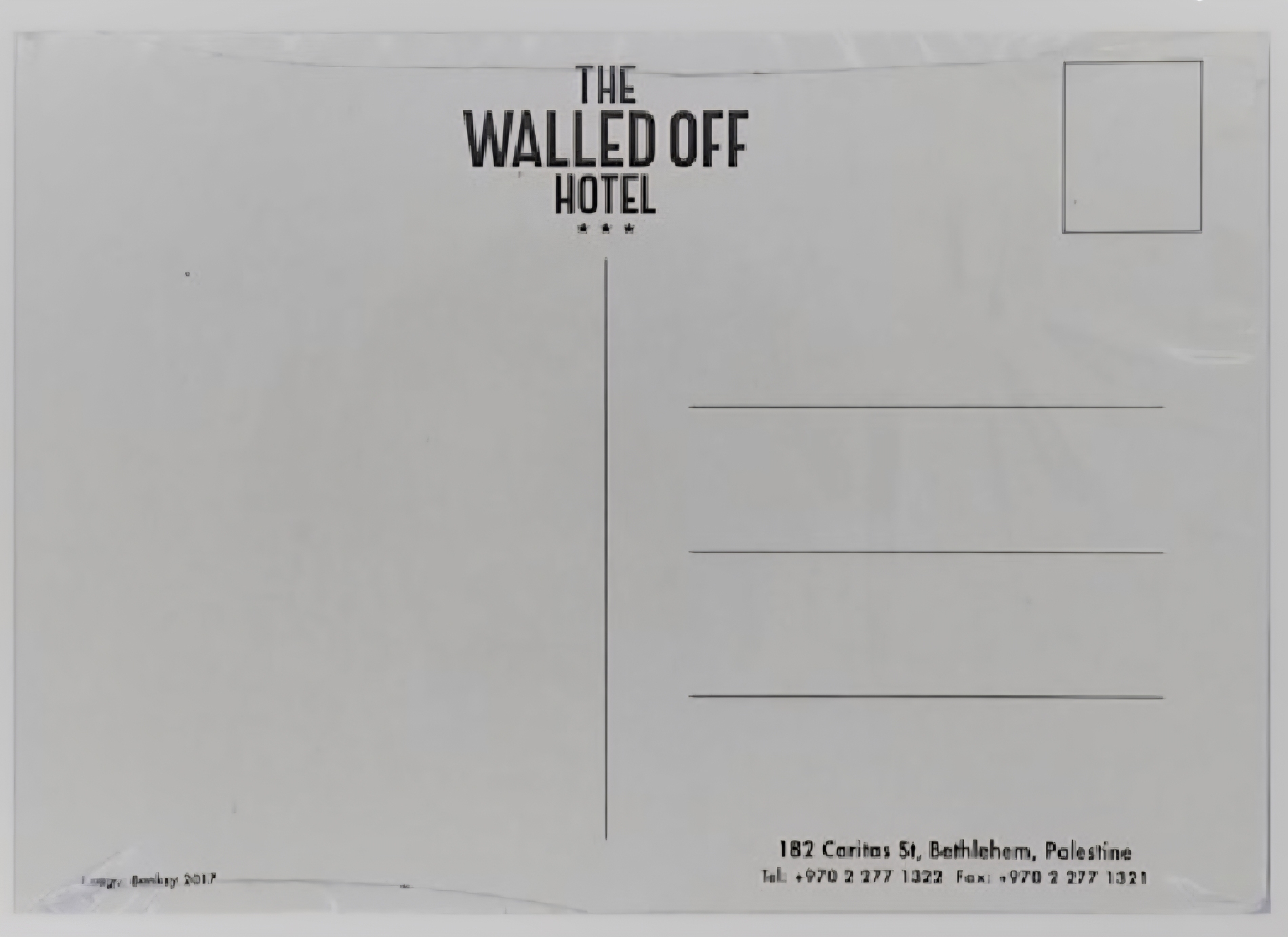 lotto composto da un set di 12 cartoline + una T-shirt , acquistate presso il Walled off Hotel di Betlemme creato dall'artista .