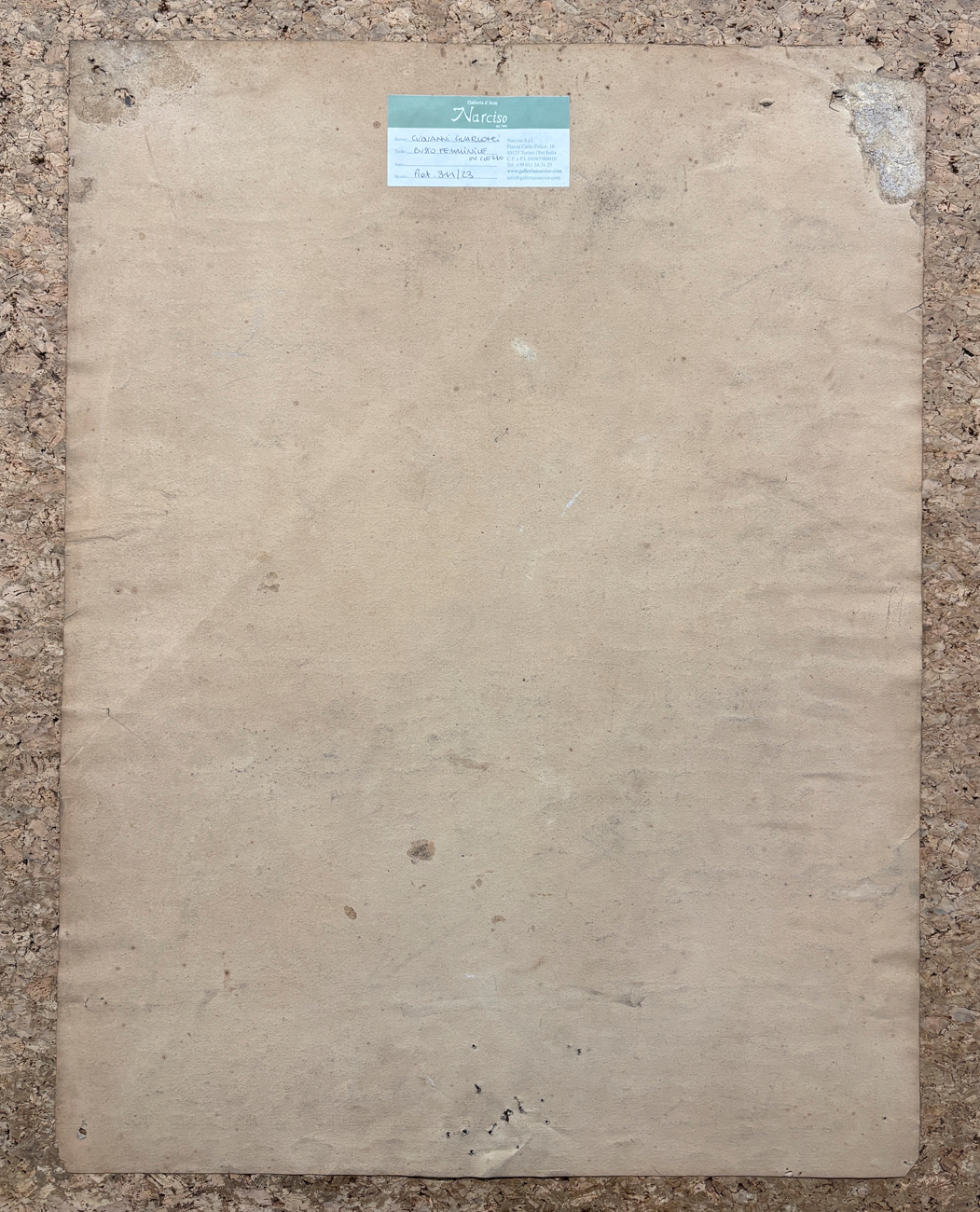 Etichetta della Galleria d'Arte Narciso (TO), con caratteristiche tecniche dell'opera e numero di repertorio, al retro