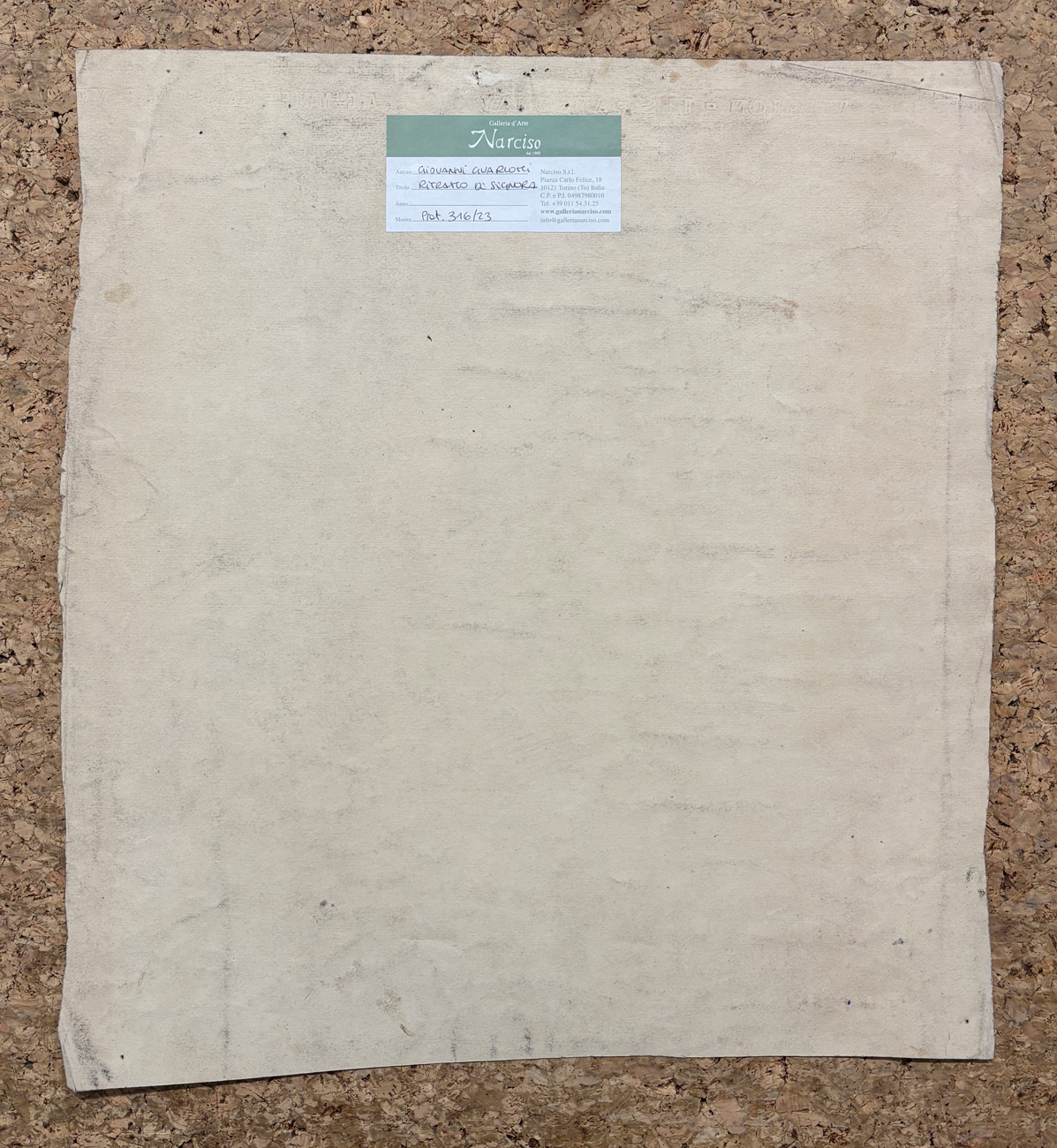 Etichetta della Galleria d'Arte Narciso (TO), con caratteristiche tecniche dell'opera e numero di repertorio, al retro