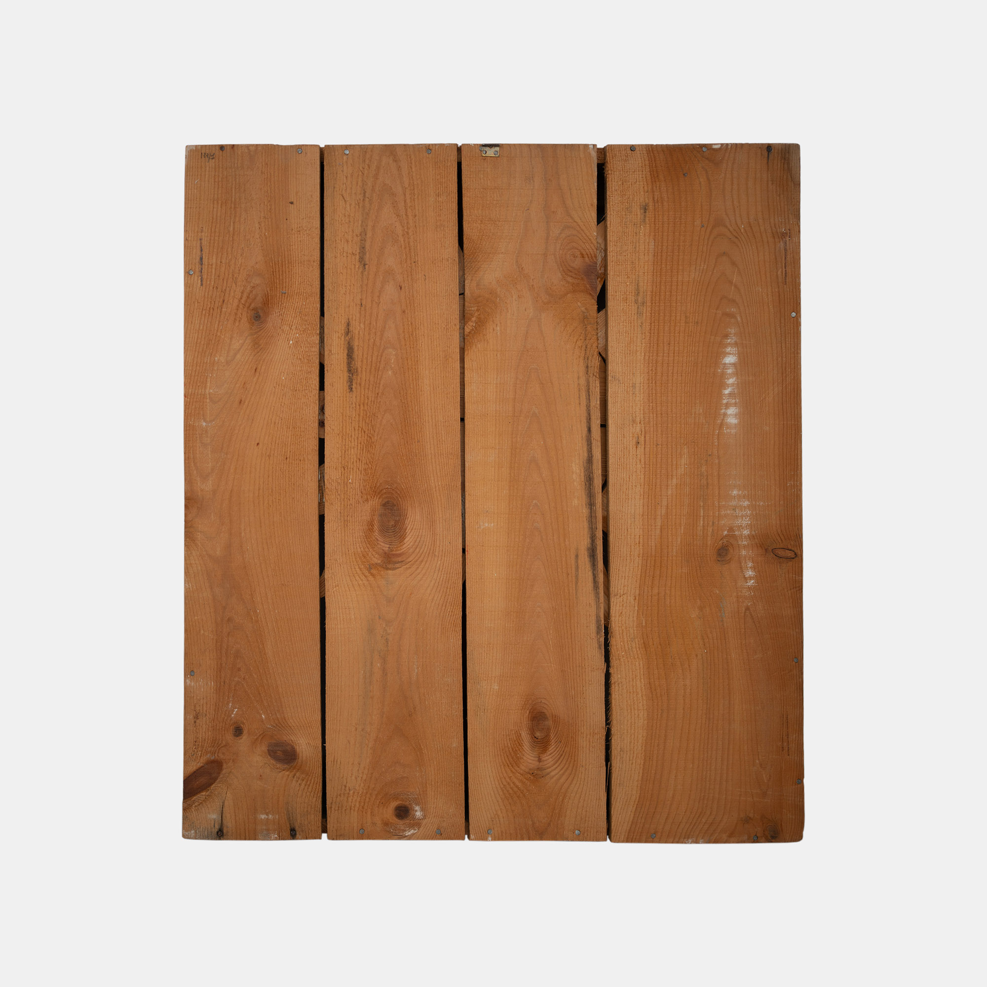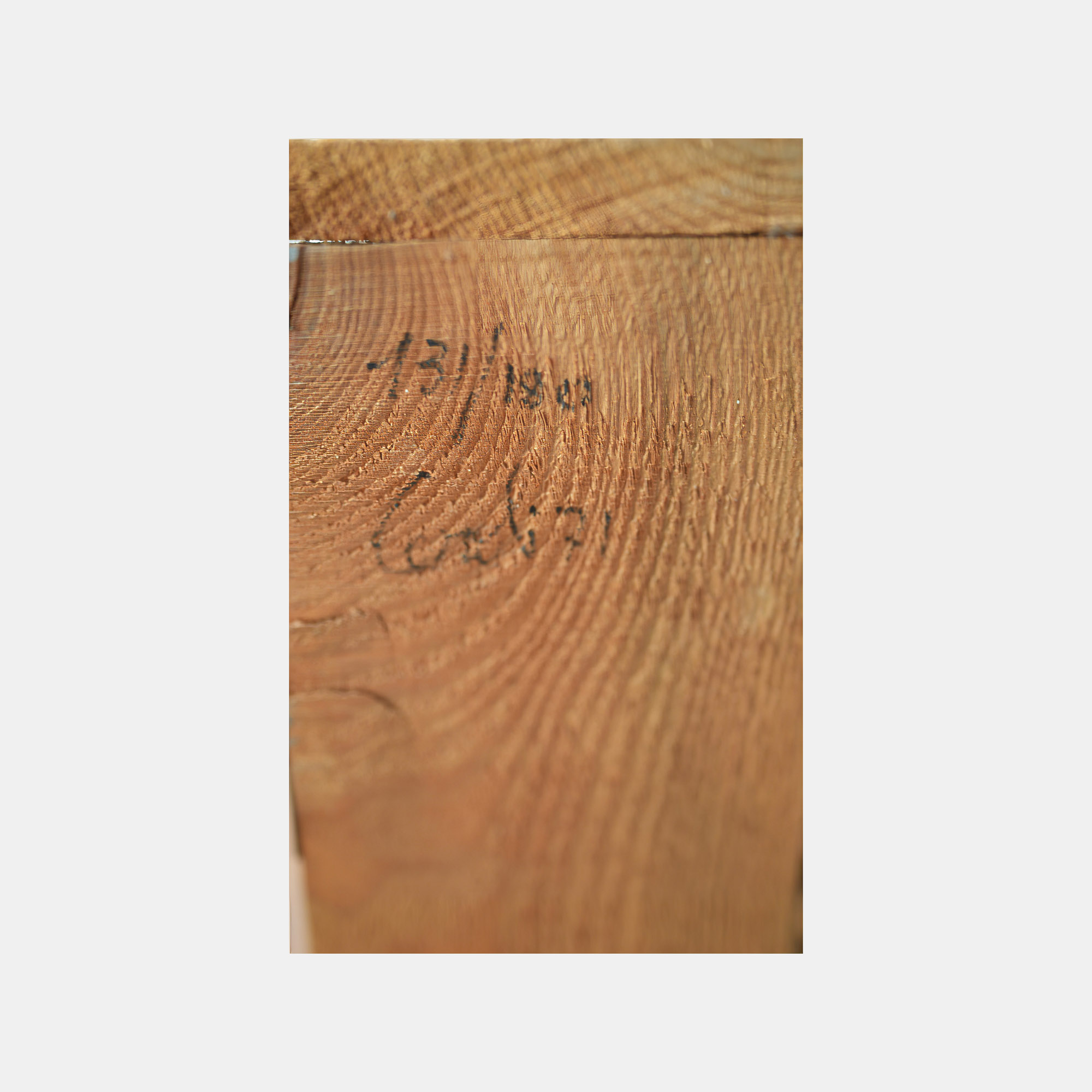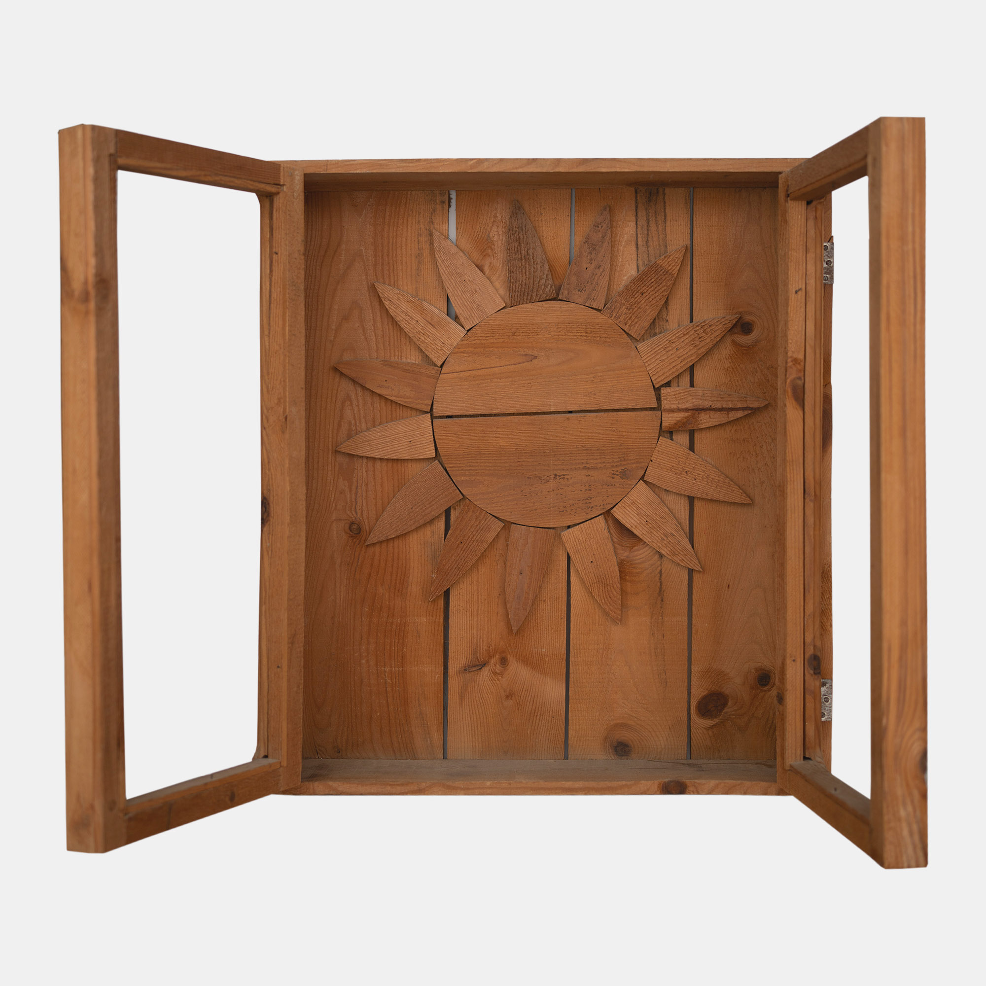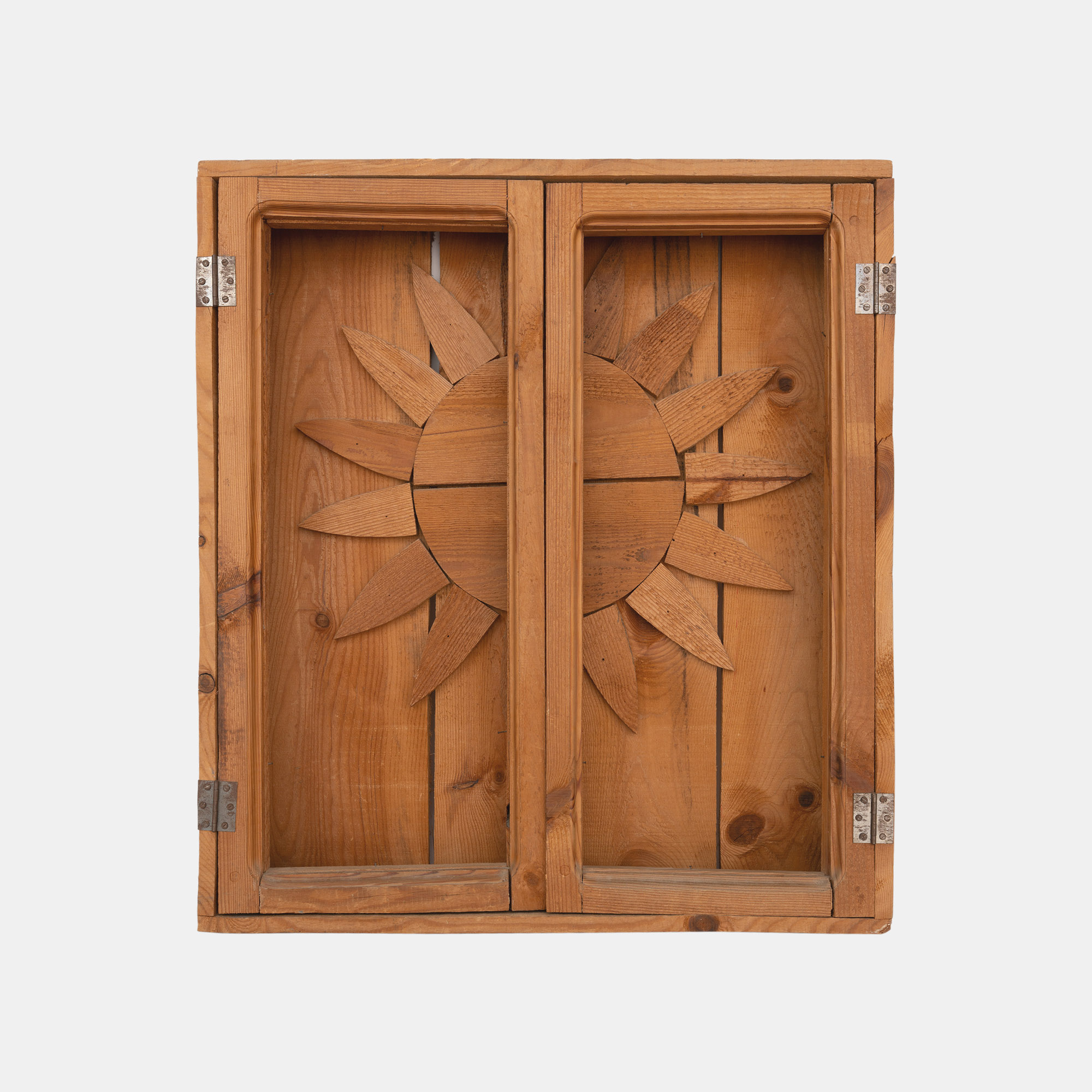 L’opera è realizzata in pino di Russia. Alla visione diretta, le tavole lignee presentano le caratteristiche proprie del materiale, con venature, irregolarità e naturali aperture della fibra, coerenti con la natura del legno e con la lavorazione dell’opera. Le ante risultano regolarmente funzionanti e non evidenziano particolari criticità strutturali. Si rilevano soltanto la presenza di polvere all’interno, un lieve deposito superficiale al verso e una contenuta ammaccatura in corrispondenza dell’angolo inferiore destro. Buono stato di conservazione.