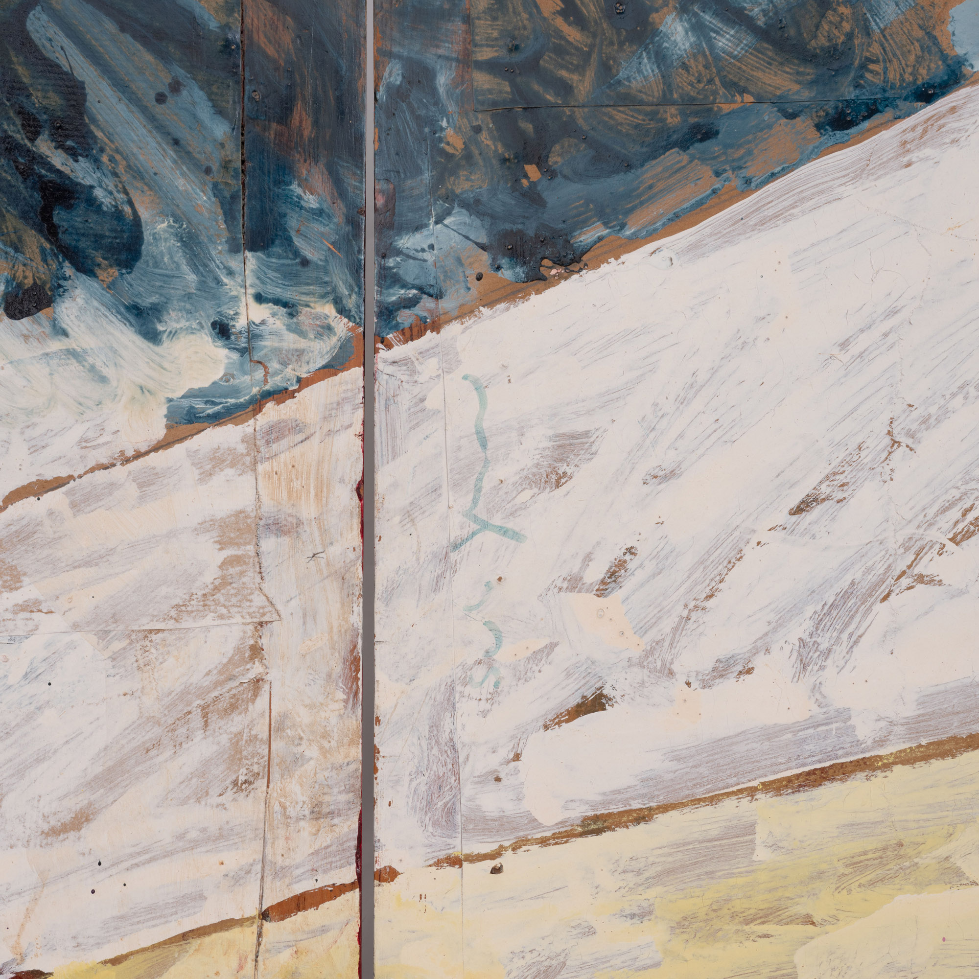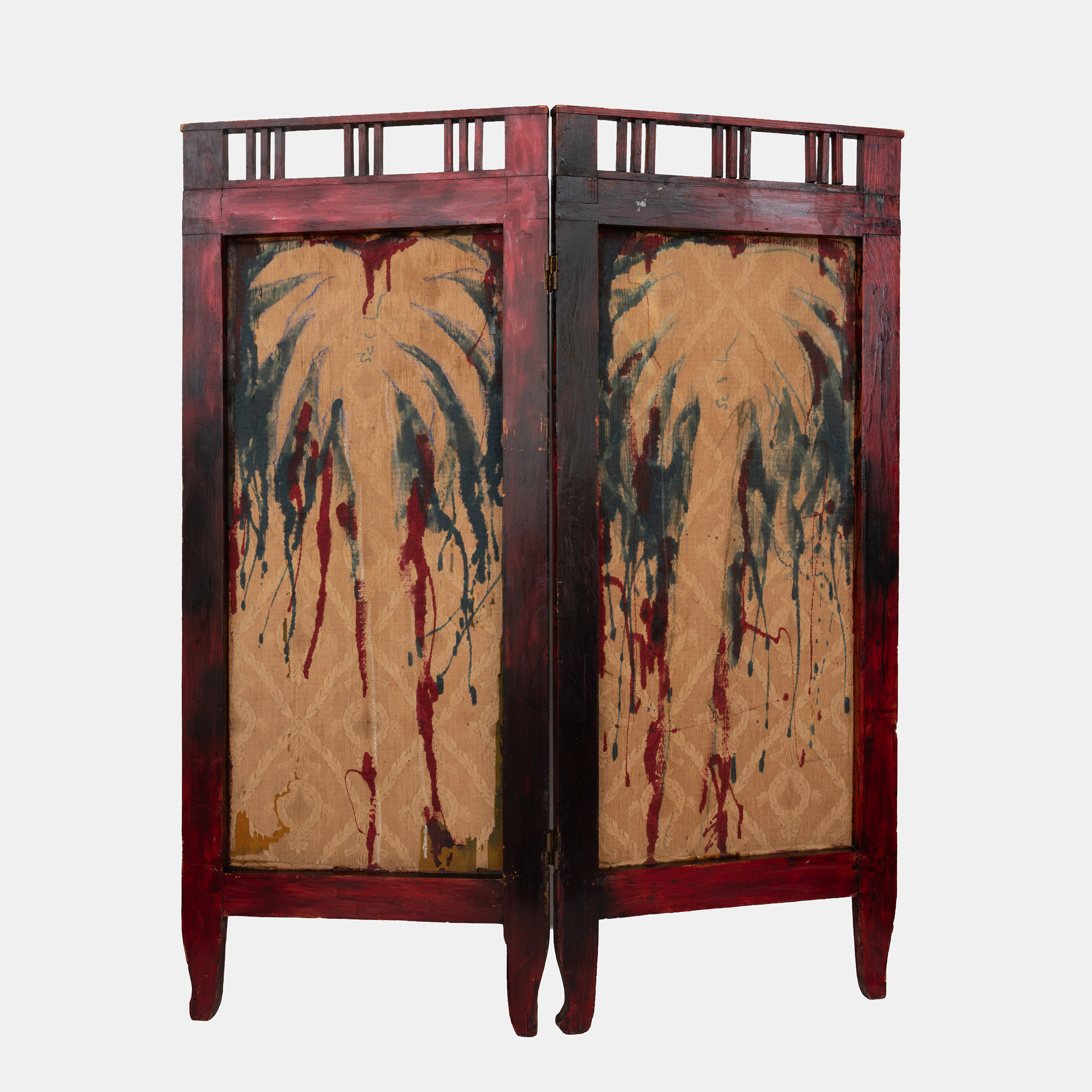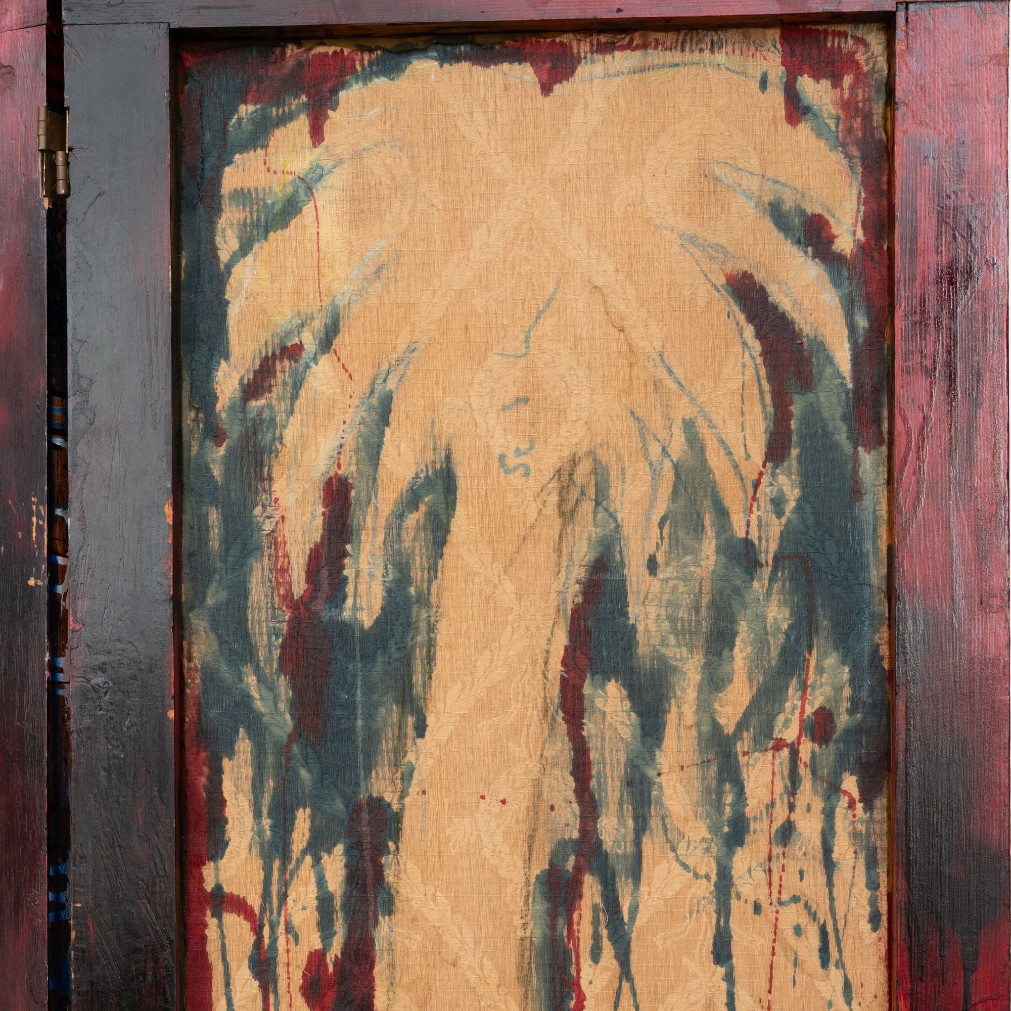 L'opera si compone di due ante, smalto su carta su tessuto damascato e legno sagomato.