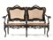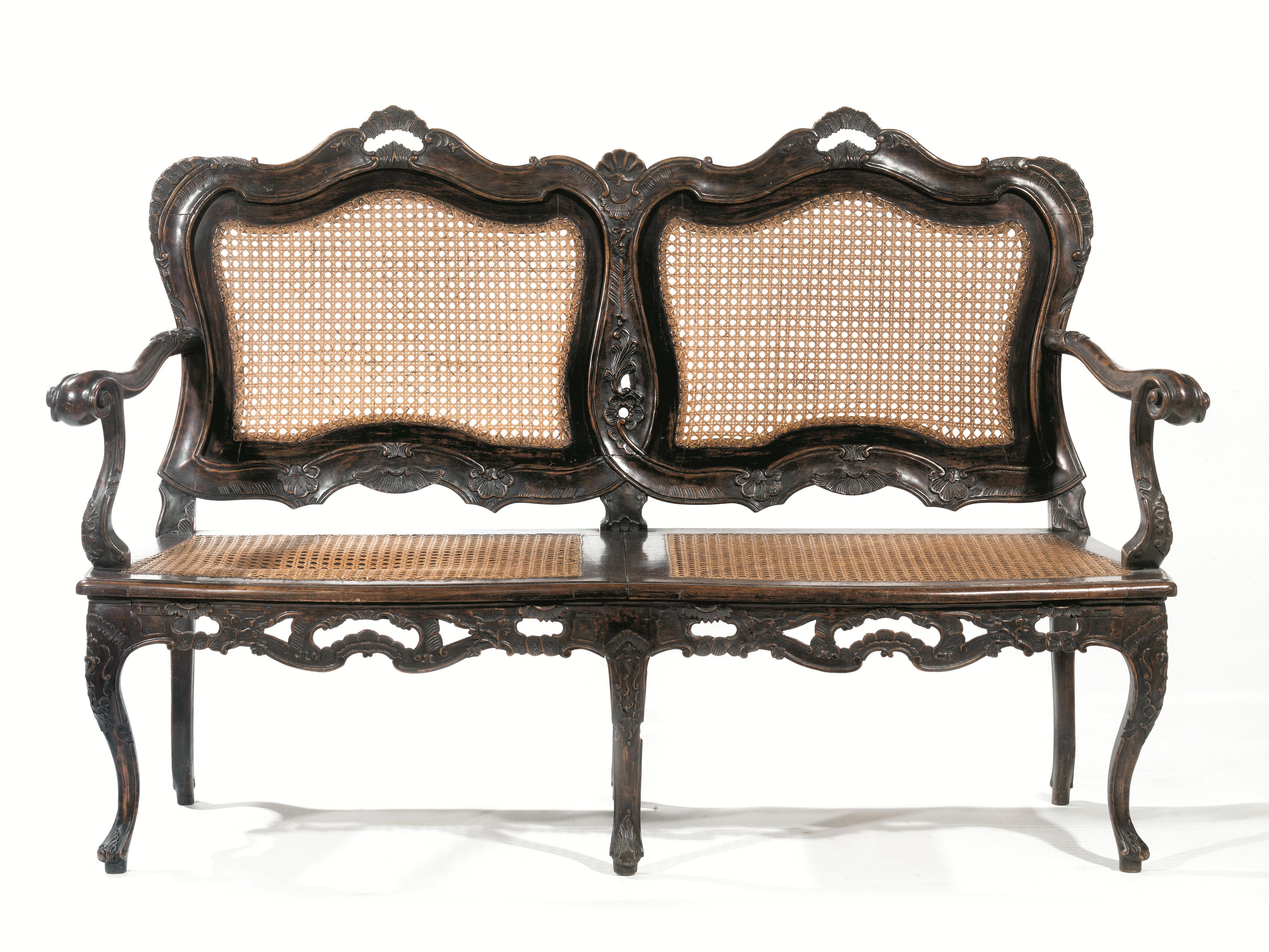 in noce intagliato a patina scura, spalliera sagomata centrata da conchiglie traforate di gusto rocaille, braccioli a giorno con estremità a ricciolo su sostegni mossi, pendaglina sagomata e traforata a volute, gambe mosse su piedi a ricciolo stilizzato, spalliera e sedili in cannetté, lungh. cm 143