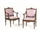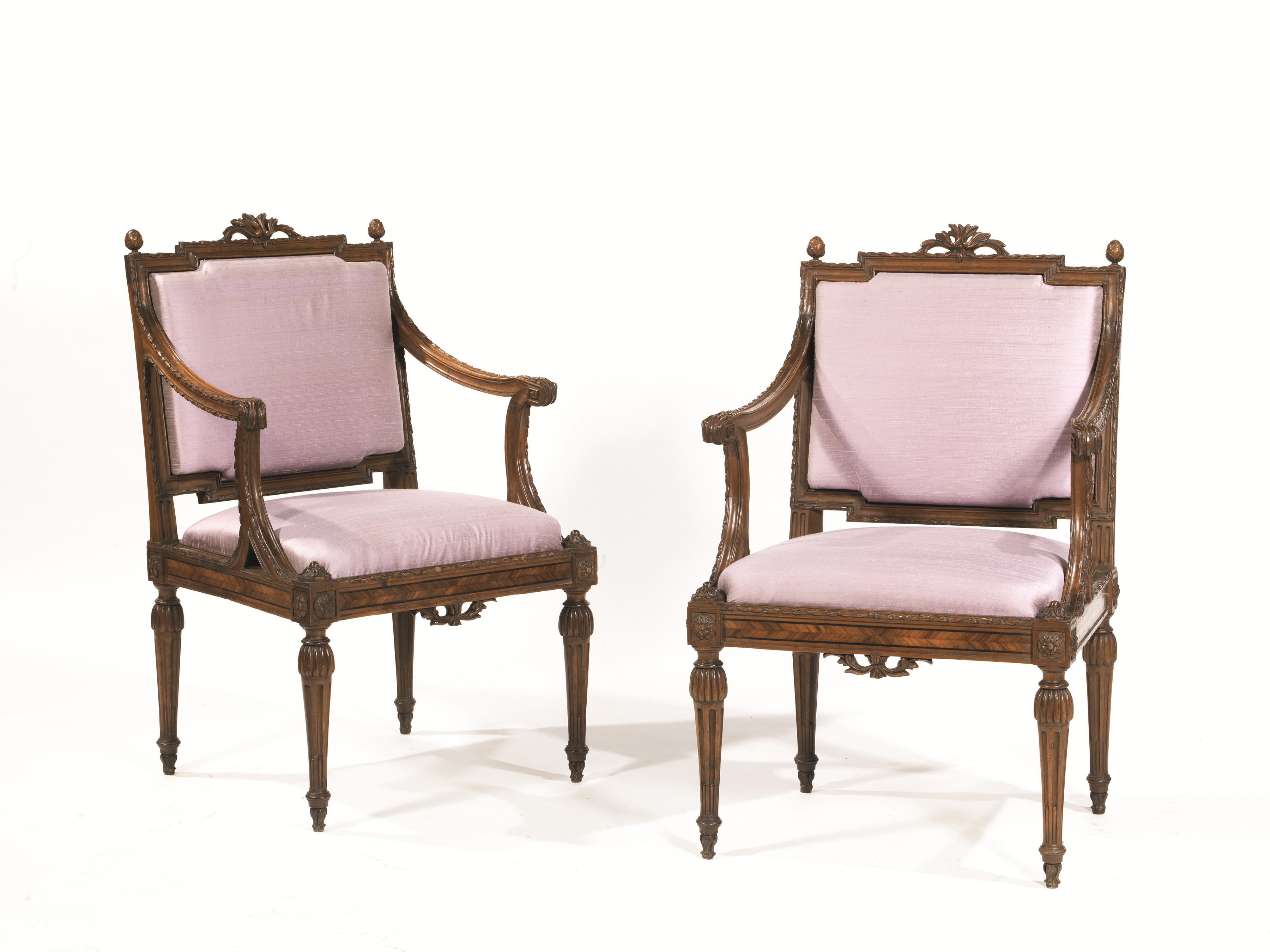 in noce intagliato, spalliera sagomata sormontata da voluta e con finali a pigna, braccioli desinenti a ricciolo su sostegni mossi, fascia lastronata, gambe troncopiramidali scannellate, ricoperte in seta lilla (2)