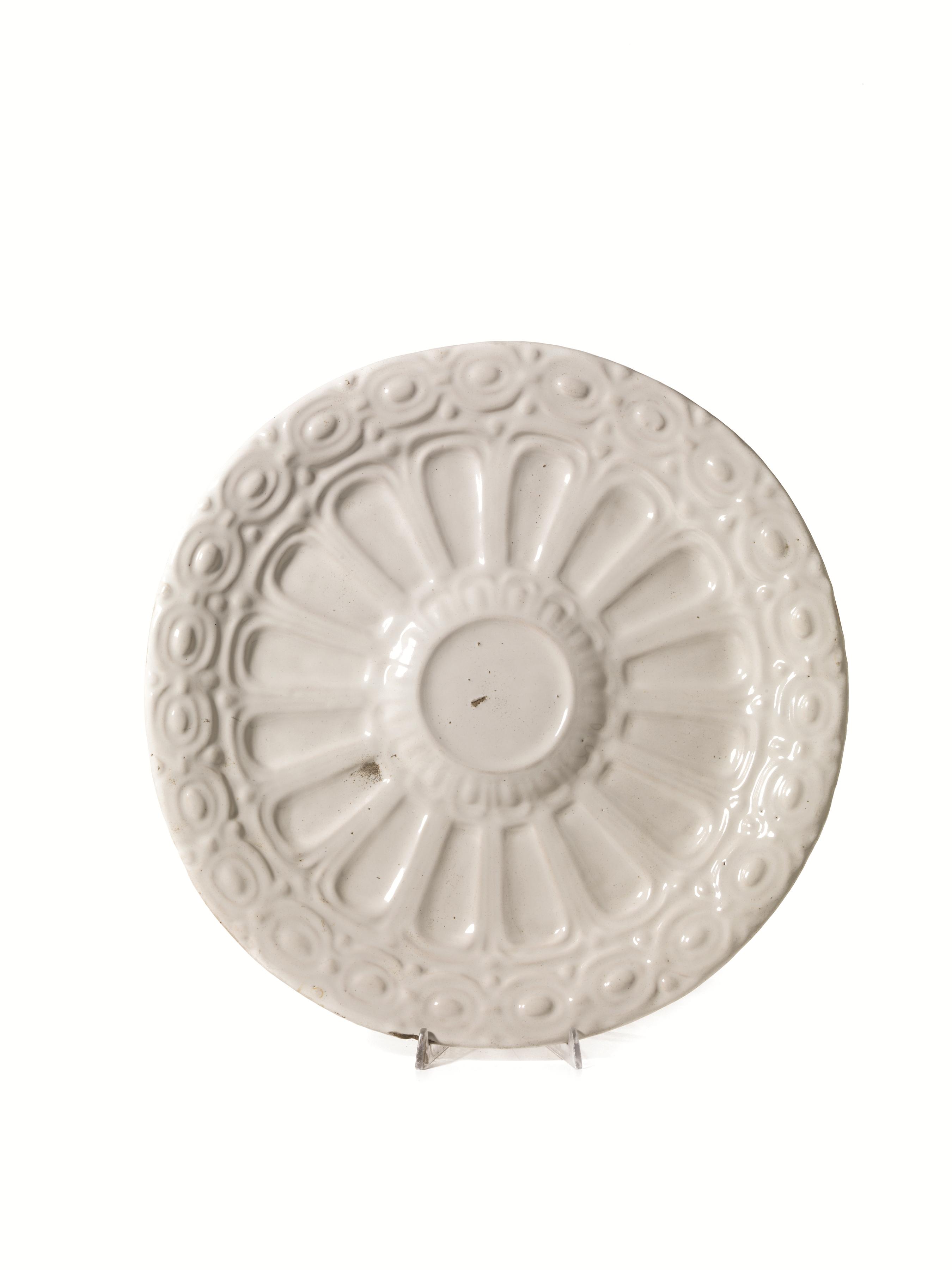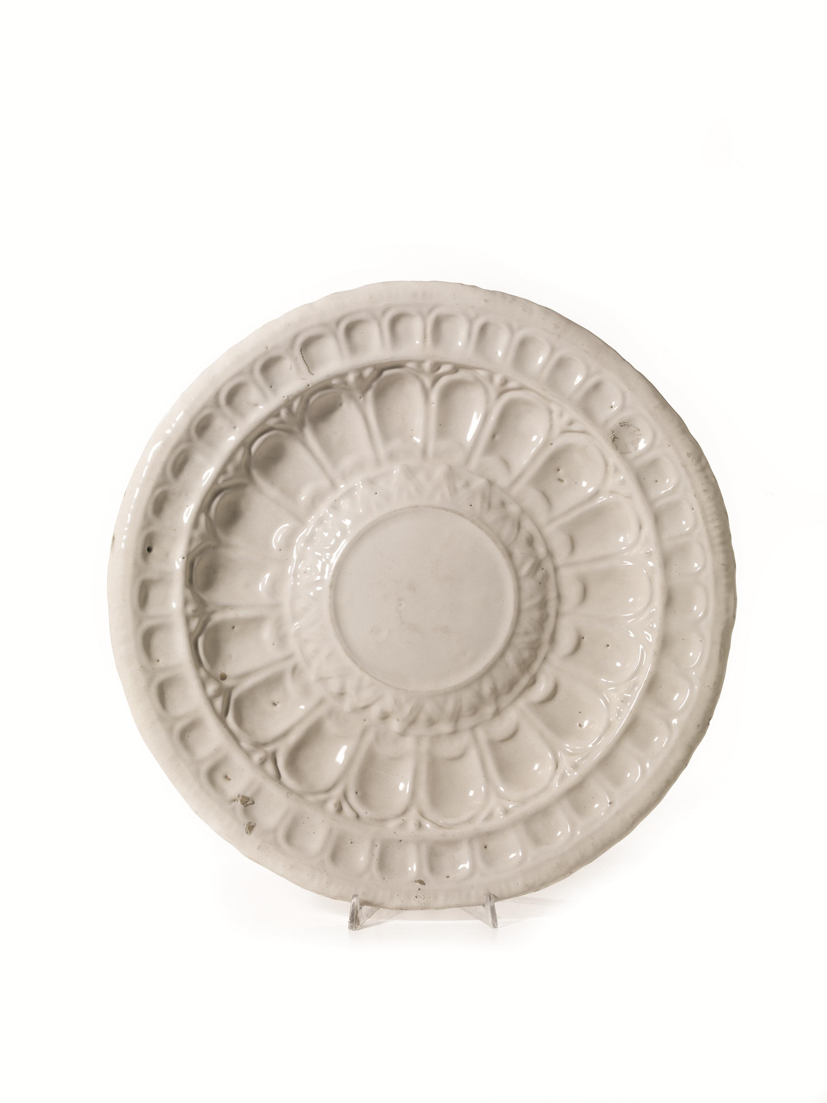 in maiolica ricoperta di smalto stannifero bianco, forme mutuate dai corrispondenti bacili in metallo, diam. cm 47,5 e 47