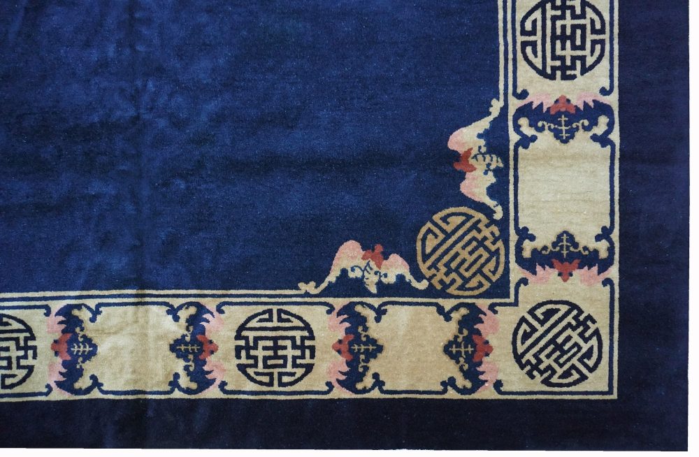 Pochi disegni sono stati scelti a decorare il campo aperto del centro, tra cui un medaglione composto da fiori e motivi “shou” e pipistrelli nelle zone angolari. Questi due motivi, simboli di buona fortuna e di buon auspicio, il simbolo “shou” ed i pipistrelli stilizzati, decorano anche la bordura principale a fondo beige.