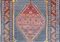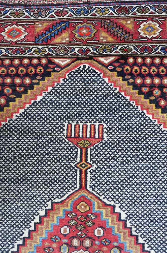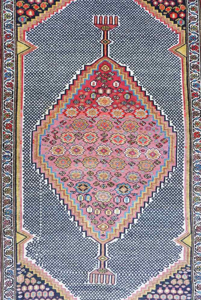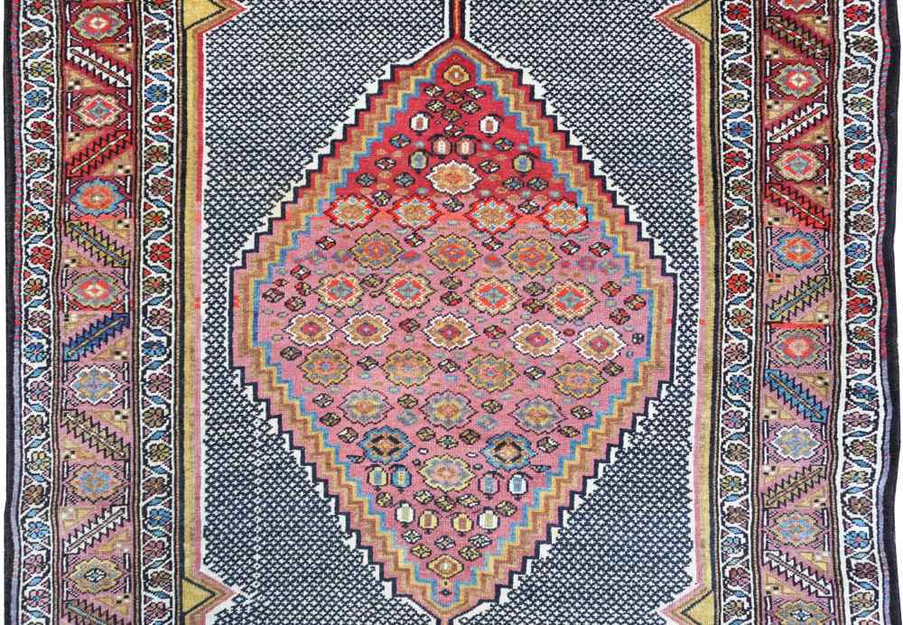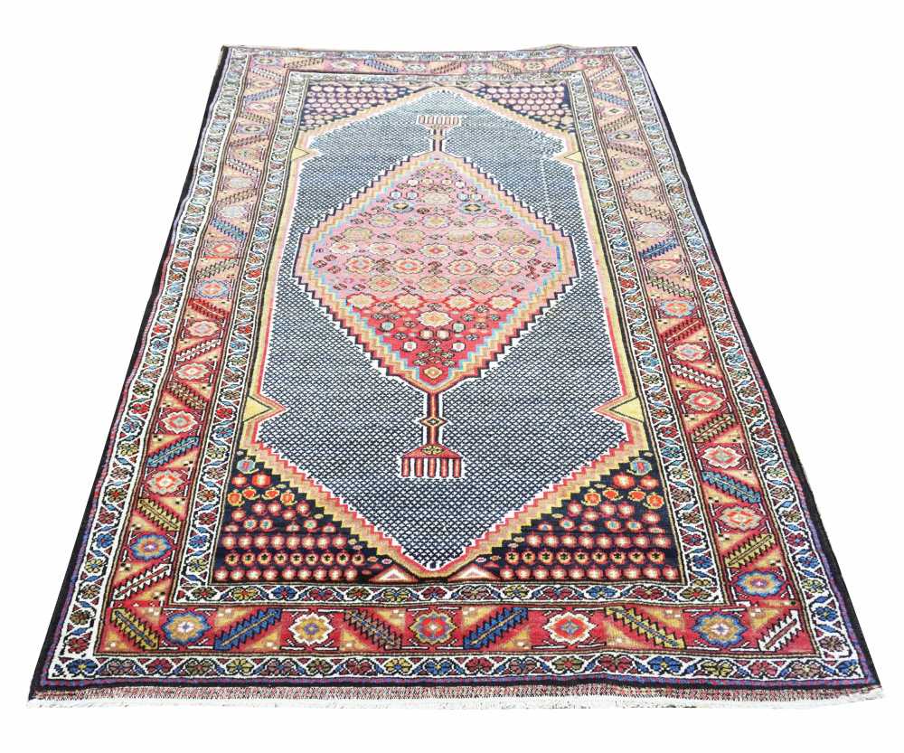 Un maestoso medaglione centrale a forma di rombo domina il campo interno. I due pendenti sono disegnati a forma di motivi amuleti oppure mano geometrizzata. Un minuscolo disegno in bianco e nero crea un gradevole contrasto. Il tappeto è caratterizzato da motivi floreali geometrizzati.