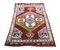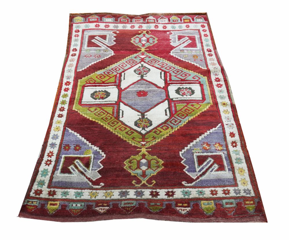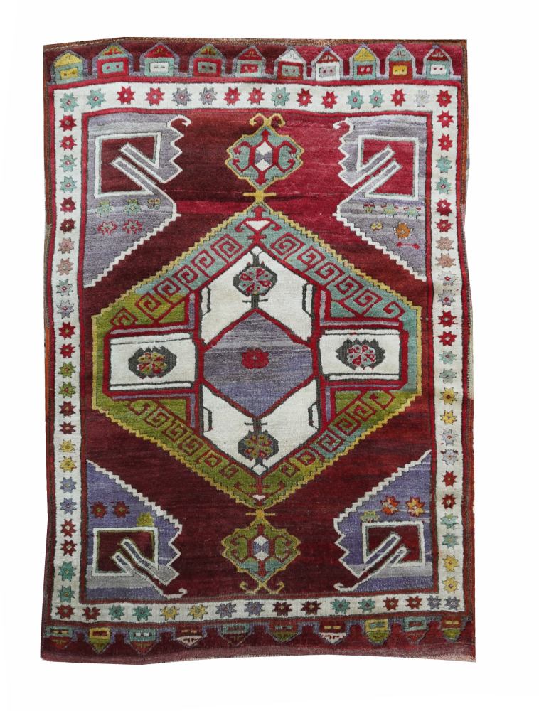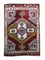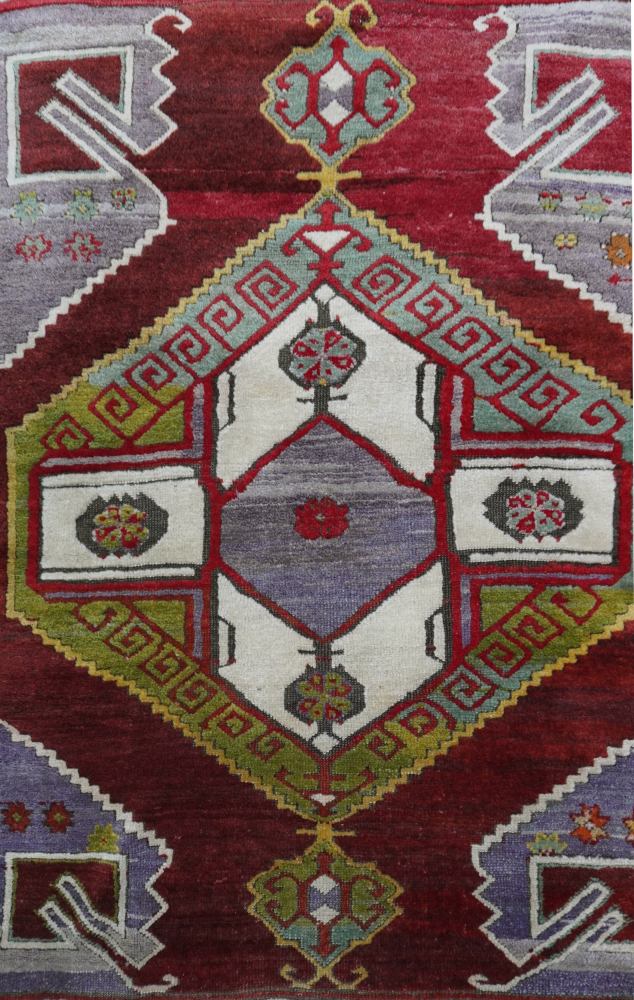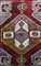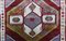 Un arcaico medaglione centrale domina il fondo rosso bordeaux con colori vivaci come bianco, melanzana, verde e turchese. Angolari geometrizzati, di espressione arcaica. Bordura a fondo bianco con motivi a stelle.