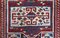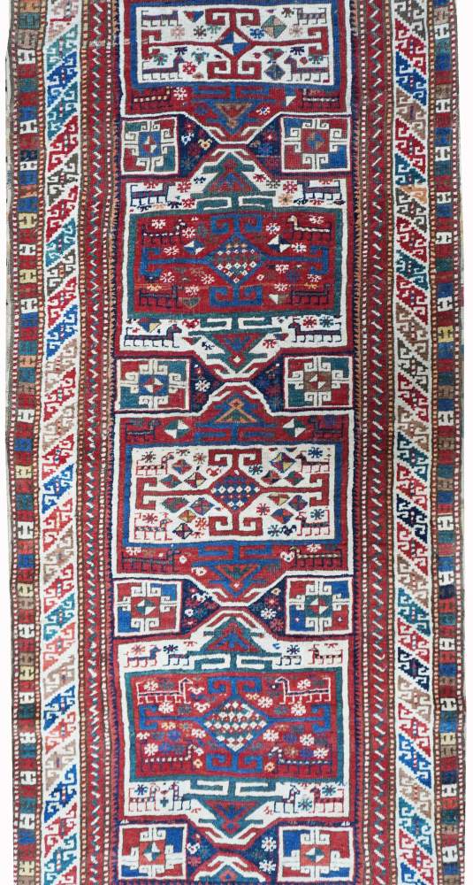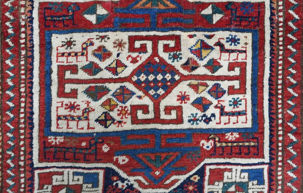 Quattro medaglioni, rettangolari ed allineati, posizionati uno sull’altro, accompagnati da rettagnoli con disegno kufico riempiono quasi interamente il fondo. Tra i motivi di riempimento numerose raffigurazioni di animali stilizzati. Bella colorazione antica, messa in risalto da grande quantità di bianco.