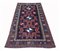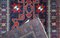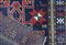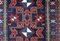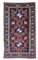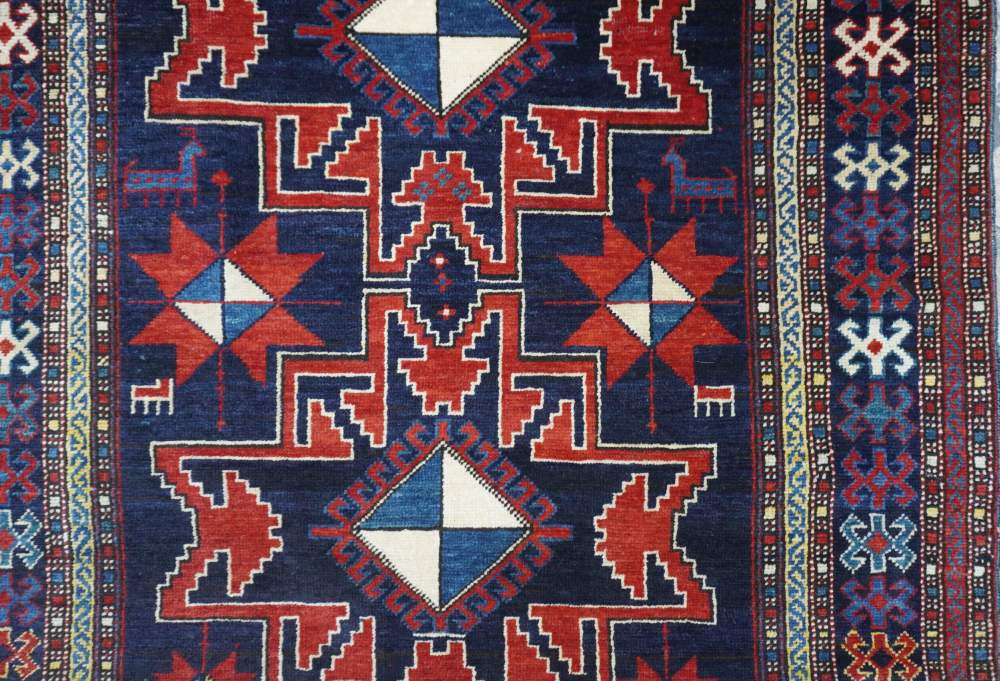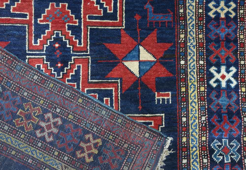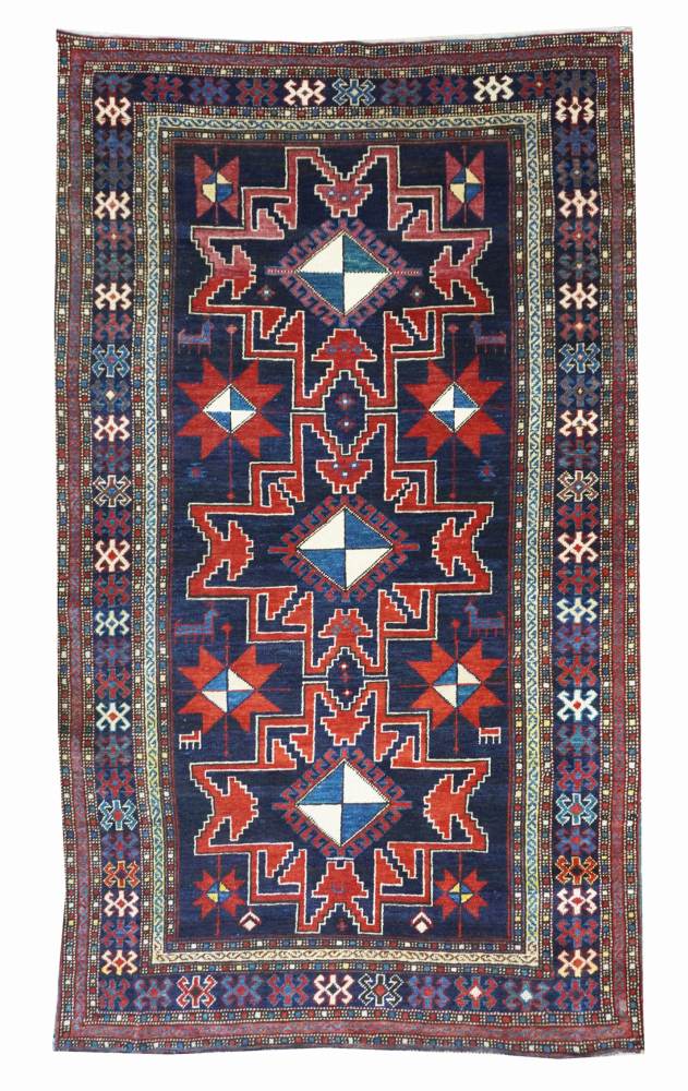 Tre stelle Lesghi geometrizzati spiccano in rosso con delineamenti in bianco dal fondo blu scuro. Bordura con disegni geometrizzati, uncinati. Vello alto.