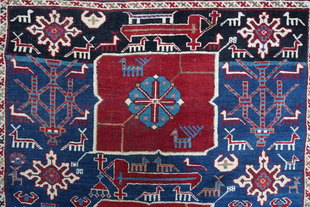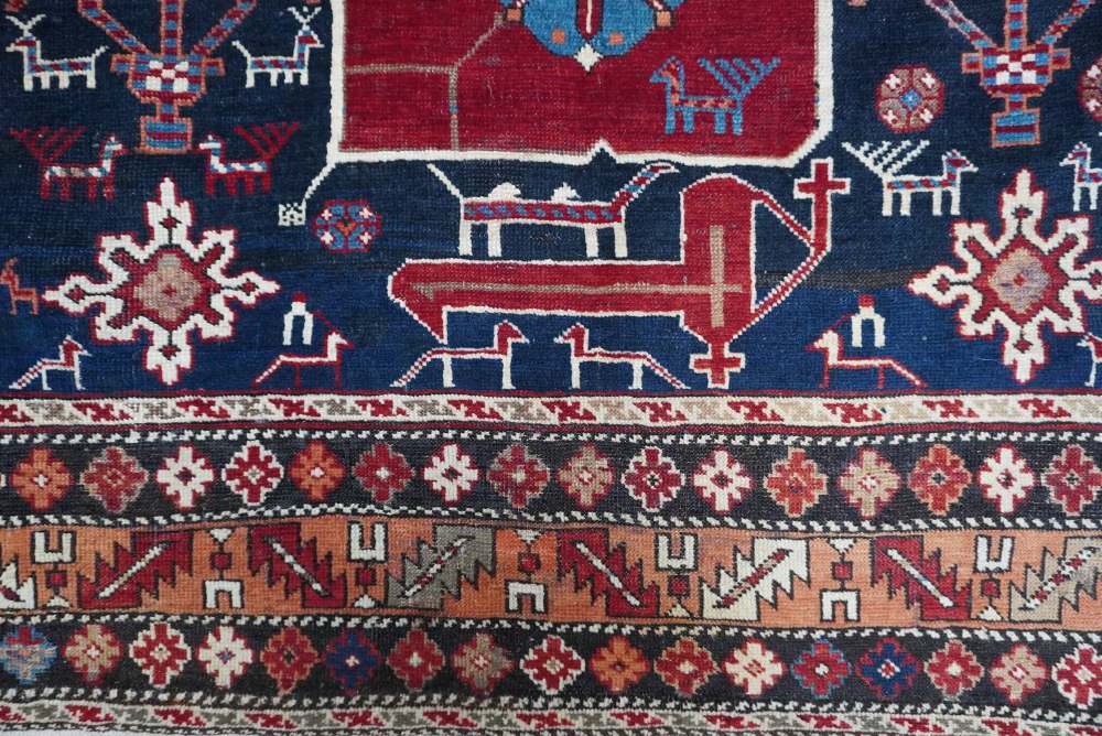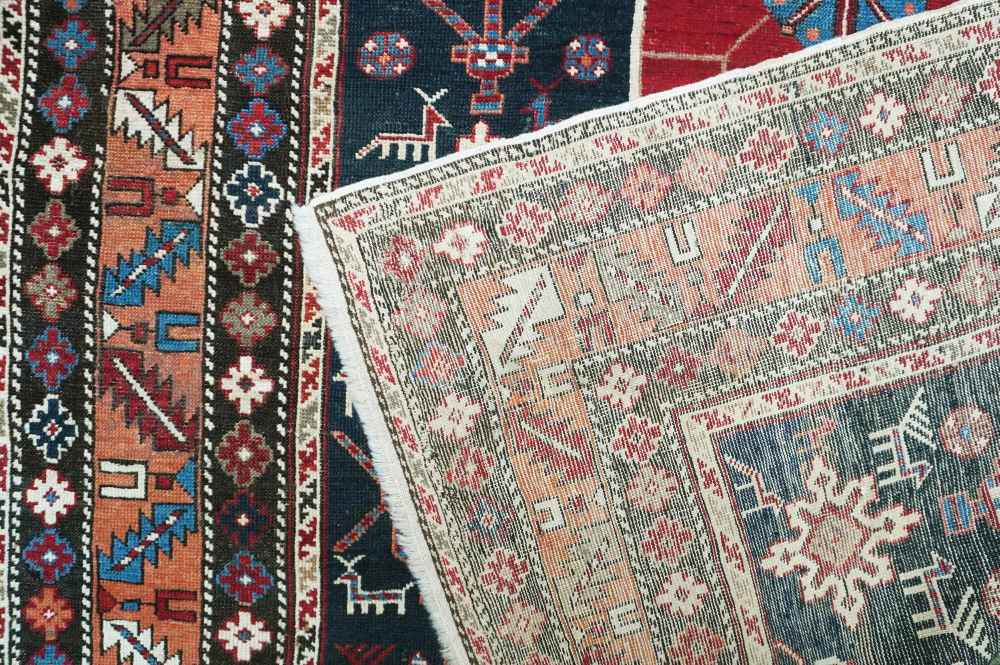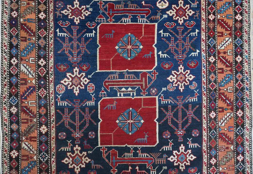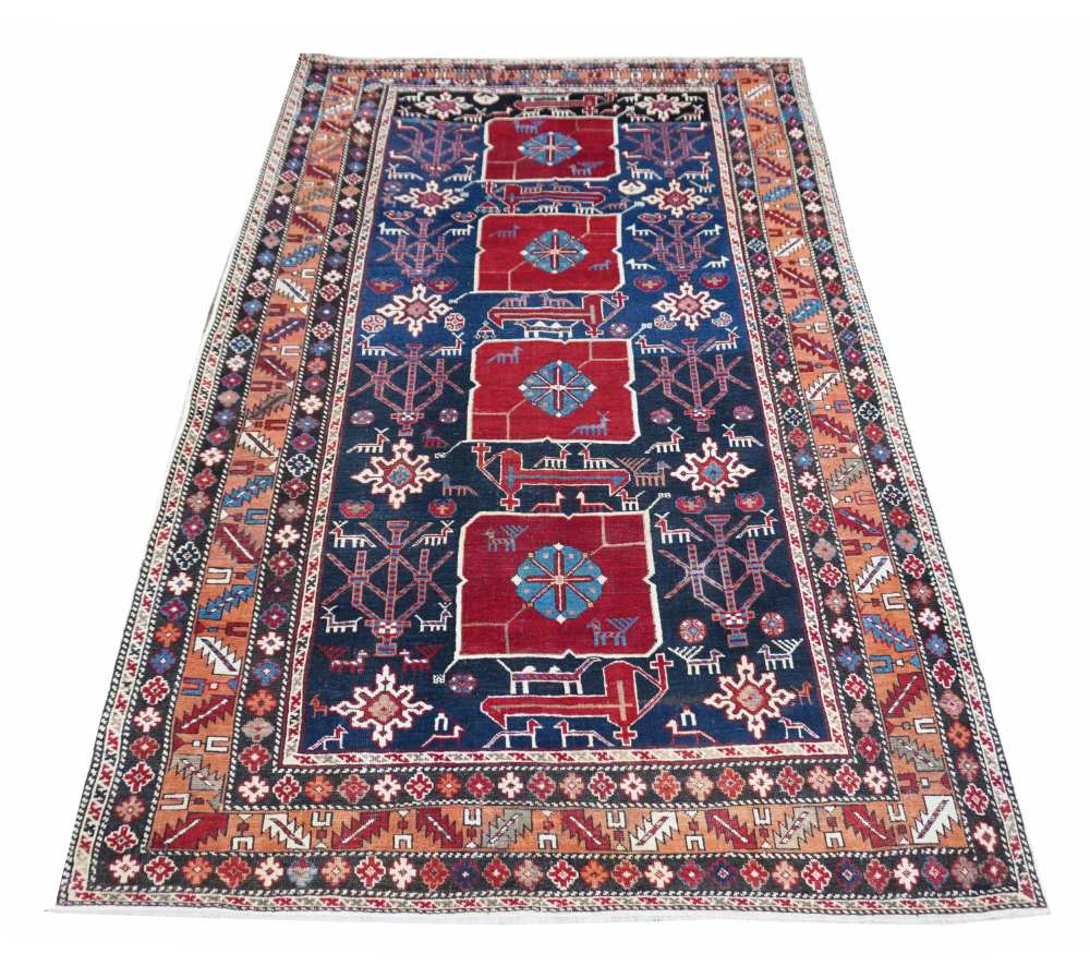 Tappeto Karagashli antico con colorazioni particolarmente belli ed annodatura fine. Quattro fogli “Karagashli” decorano il fondo blu, accompagnati da alberi stilizzati, fiori ed animali geometrizzati. Bordura principale a fondo color albicocca.