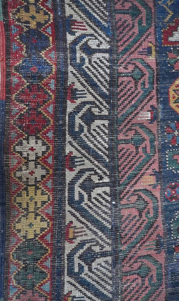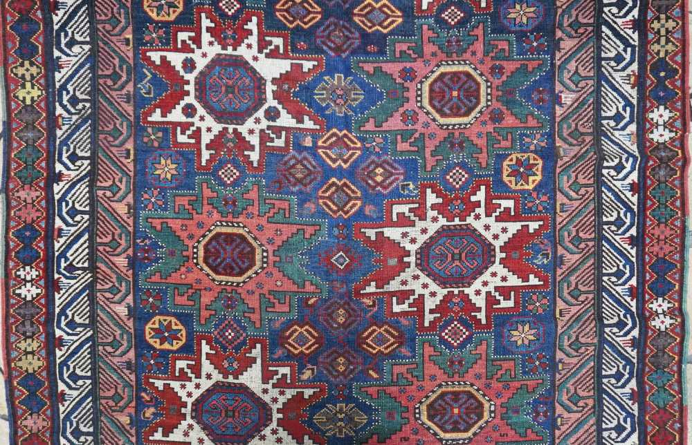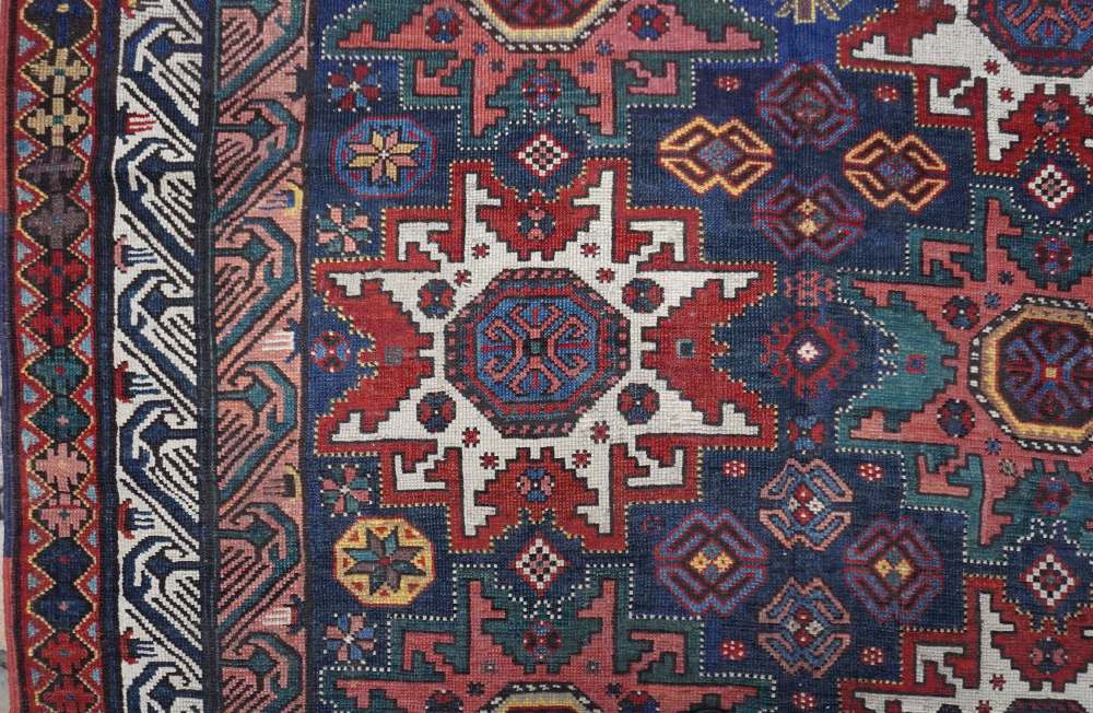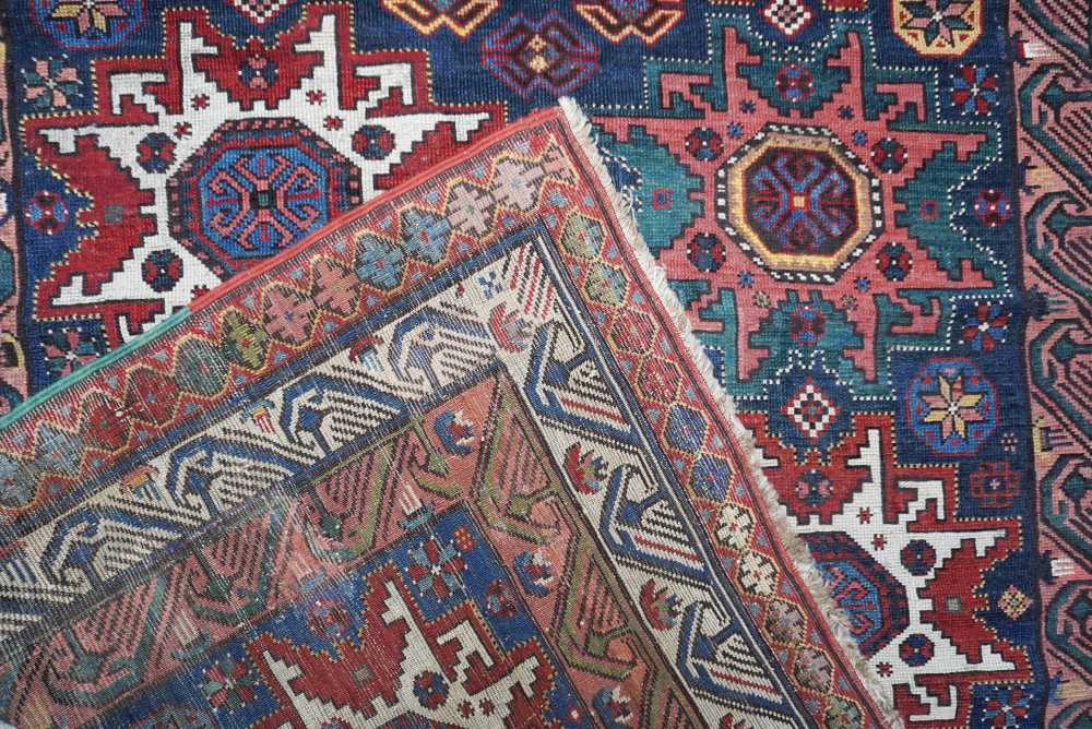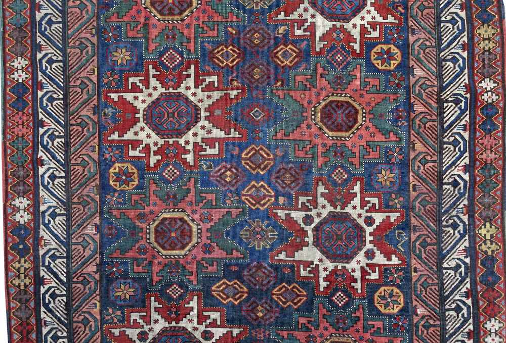 Due file di stelle “Lesghi”, allineati uno sull’altro decorano in colorazioni alternanti il fondo azzurro del campo interno. Le ornamentazioni della bordura consistono da due bordi “Georgiani”, tipica ornamentazione dei tappeti della zona di Seikhur. Colorazioni attraenti ed antichi, tra cui il color melanzana.