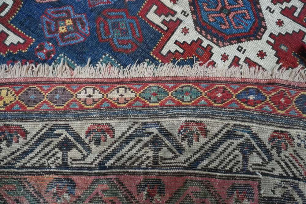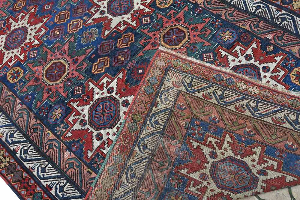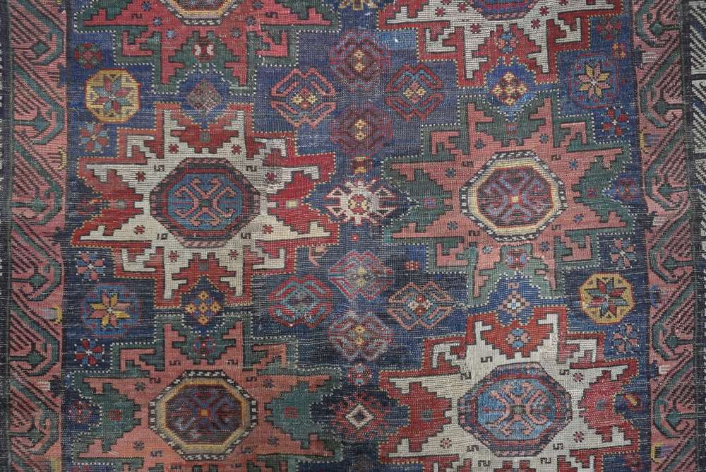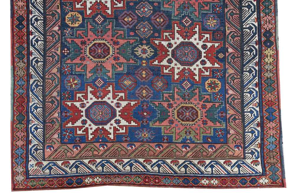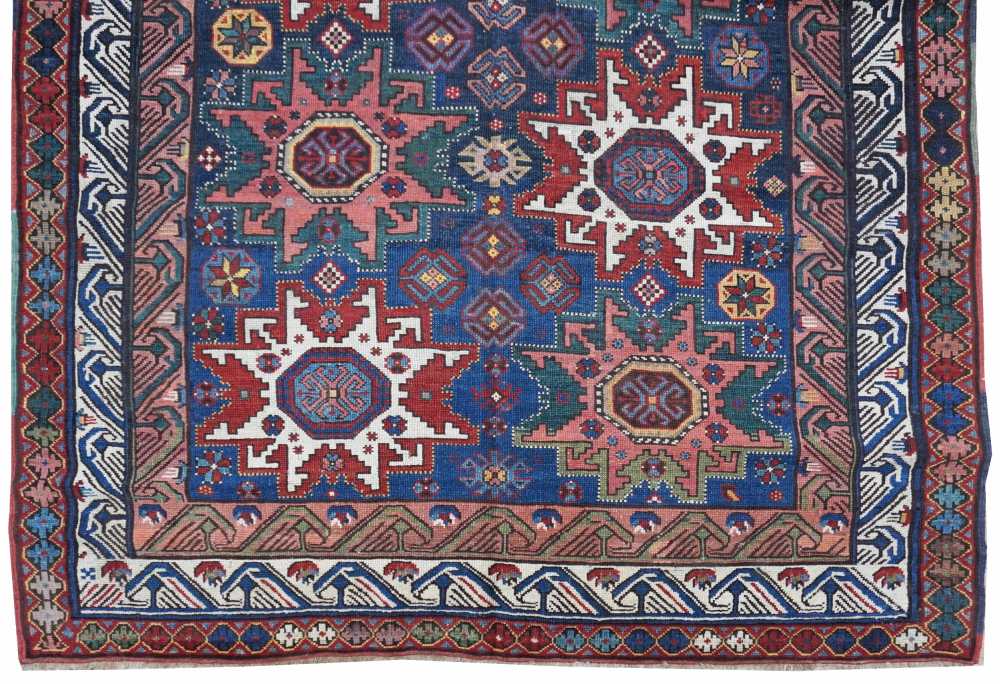 Due file di stelle “Lesghi”, allineati uno sull’altro decorano in colorazioni alternanti il fondo azzurro del campo interno. Le ornamentazioni della bordura consistono da due bordi “Georgiani”, tipica ornamentazione dei tappeti della zona di Seikhur. Colorazioni attraenti ed antichi, tra cui il color melanzana.