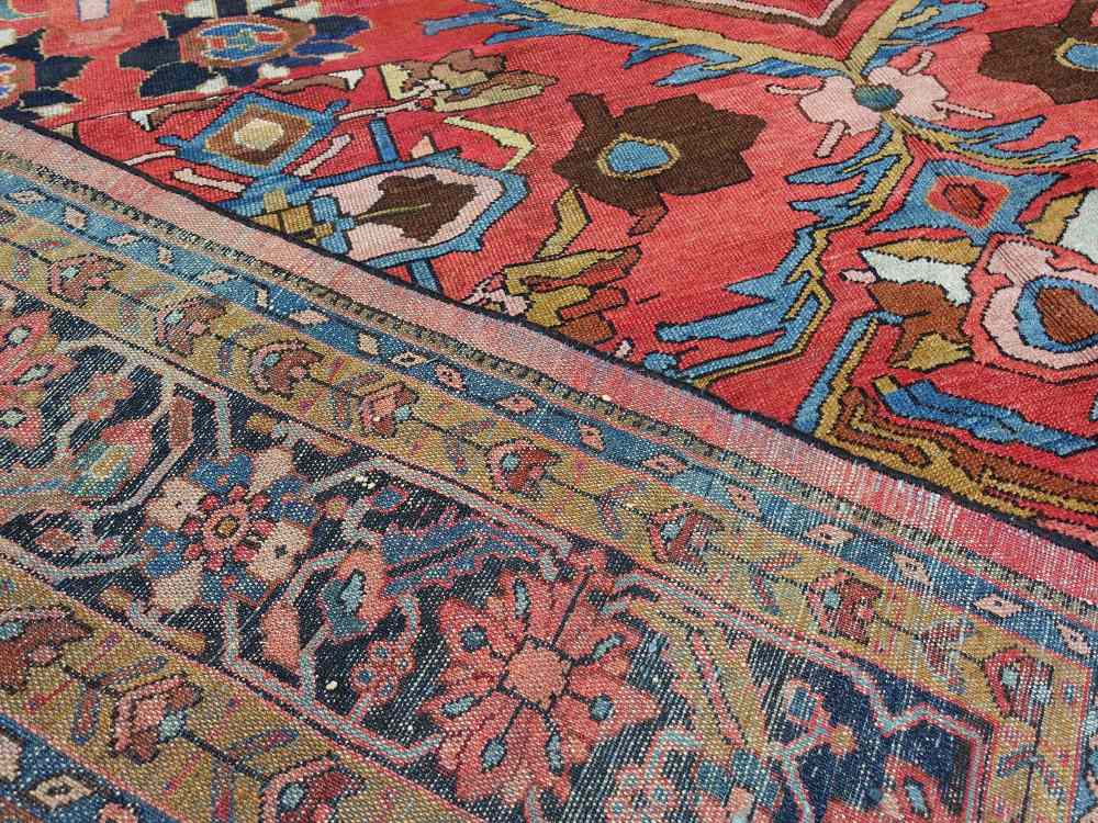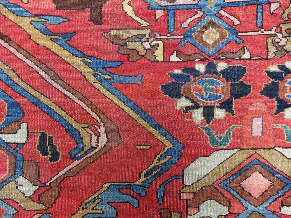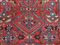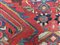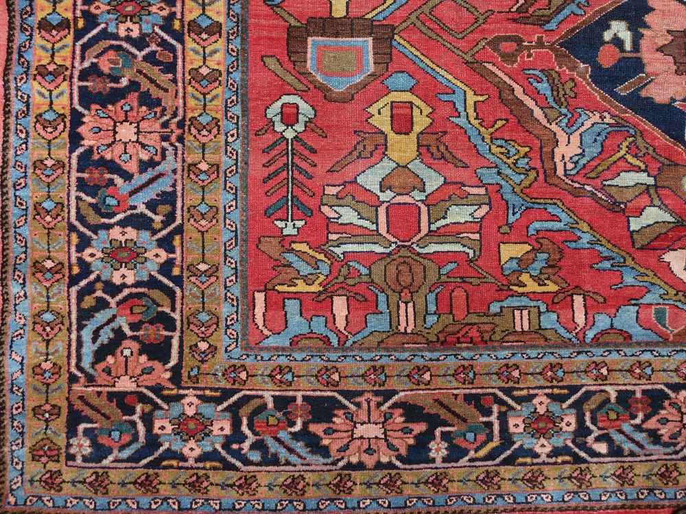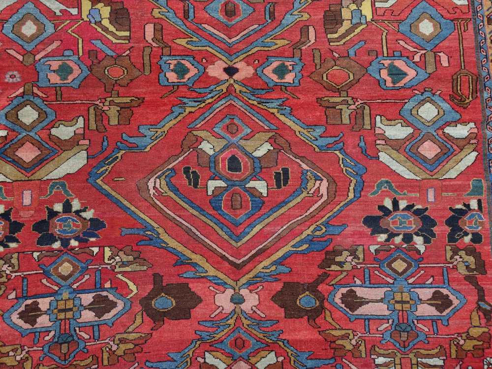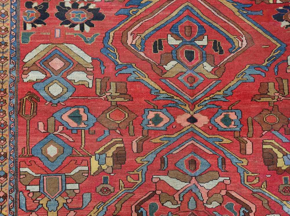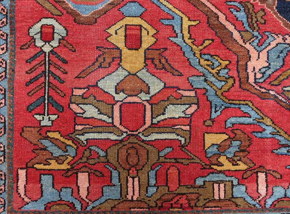 Il tappeto a fondo rosso si presenta con un impianto grafico assai inusuale. Le ornamentazioni che derivano da motivi floreali si presentano altamente stilizzati e geometrizzati, creando forme di espressione astratta ed espressiva. La bordura a fondo blu è stata decorata con fiori e foglie geometrizzate.