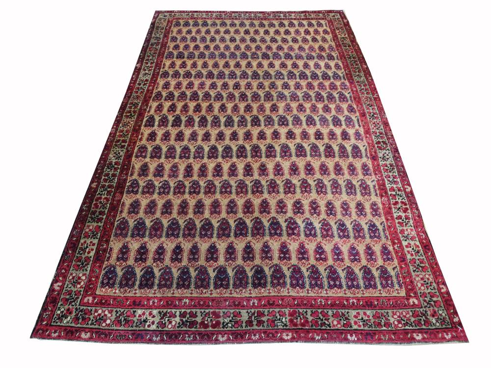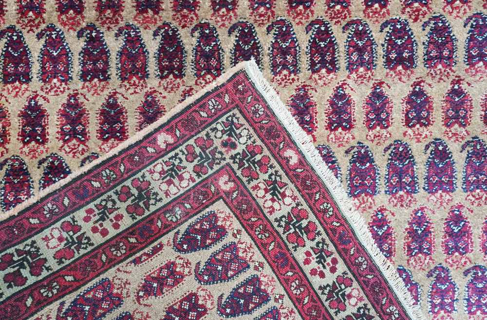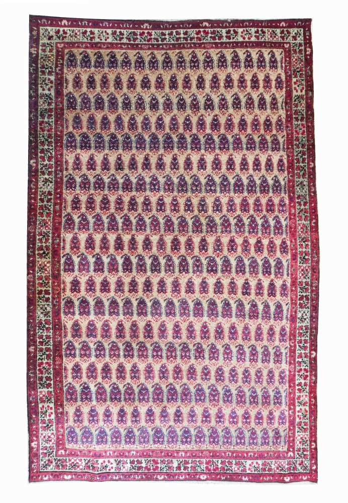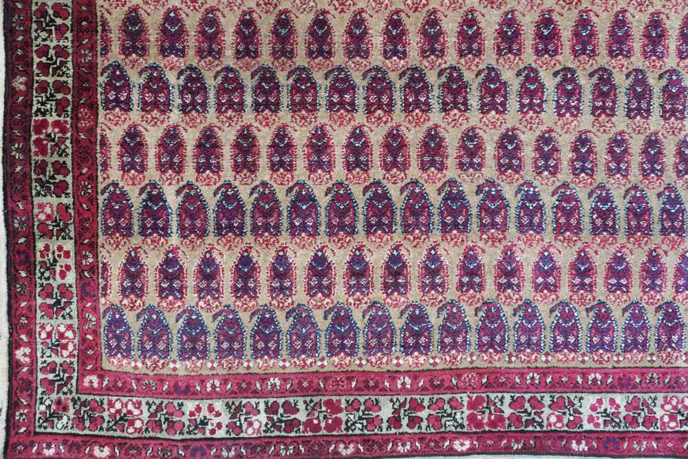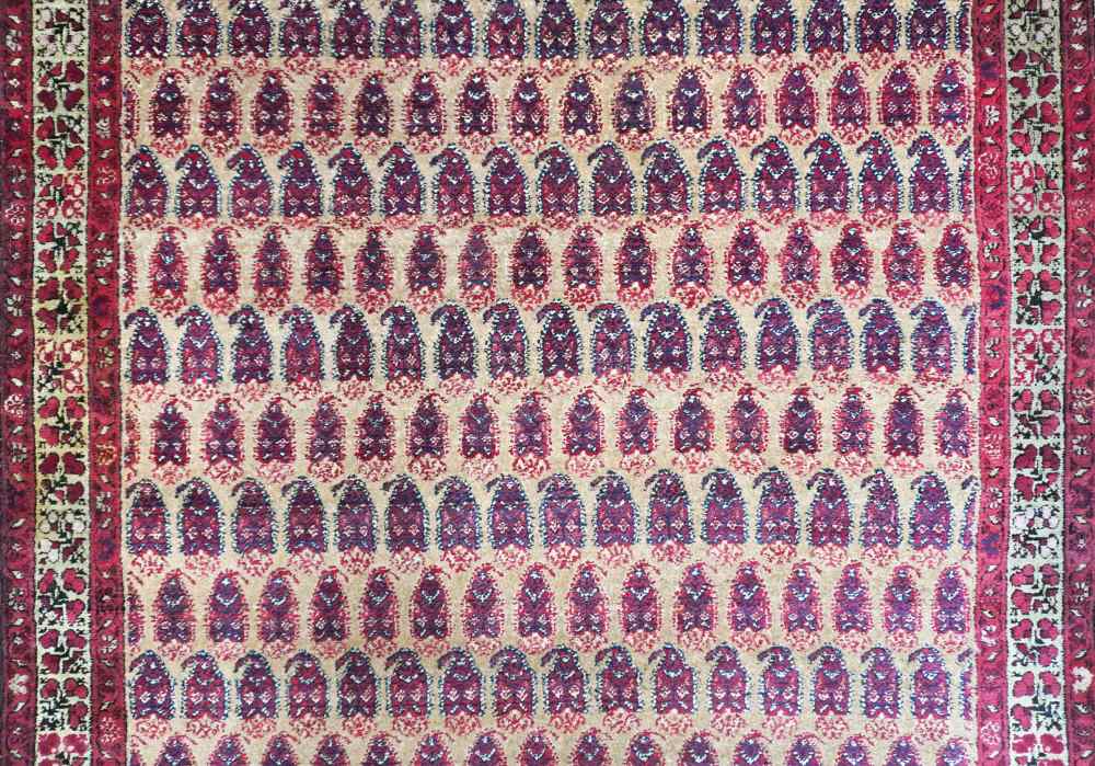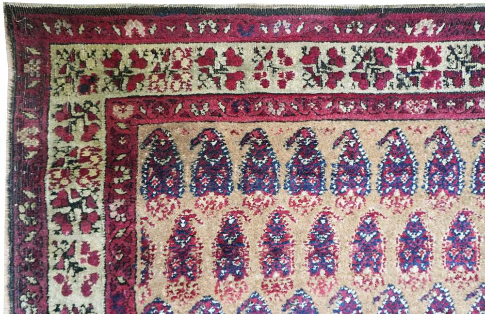 Il fondo color cammello è decorato con file di “Boteh” allineati. Tipico per la provenienza è il color rosso bluastro nella gamma dei colori.