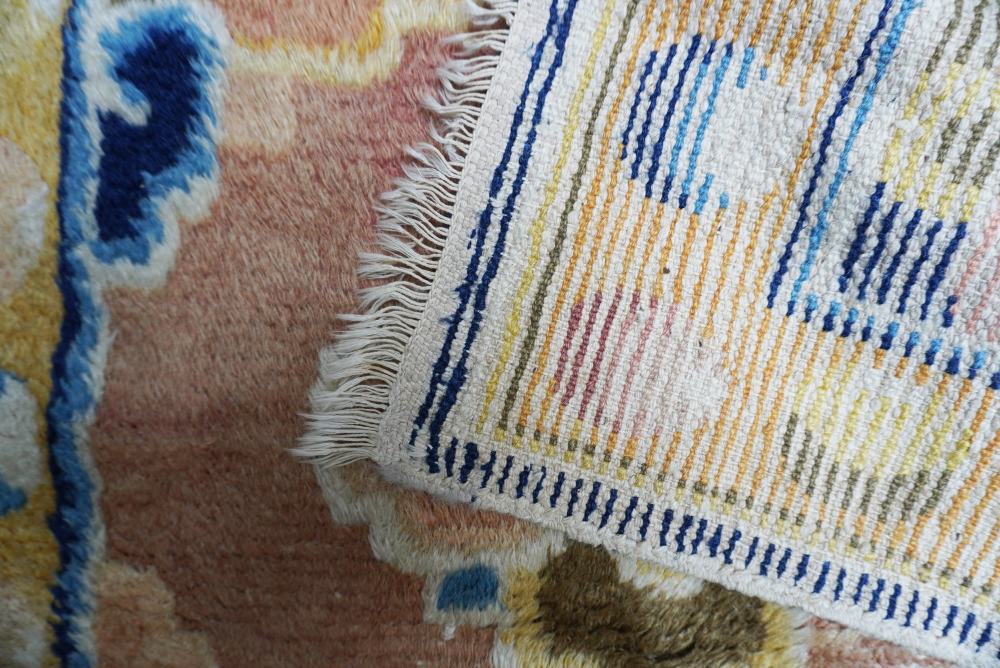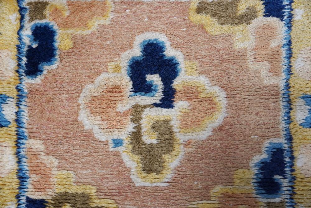 Composto da tre pannelli tendenti al quadrato che rappresentano sezioni di sedute, usati nei monasteri. I centri sono decorati con un arcaico motivo a nodo di nuvole stilizzate. Vello lungo e morbido. Antico esemplare da collezione.