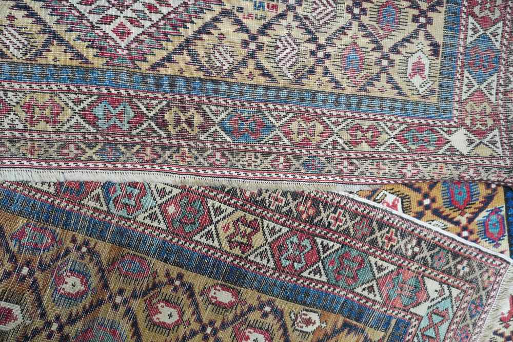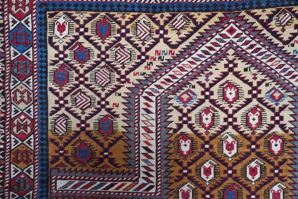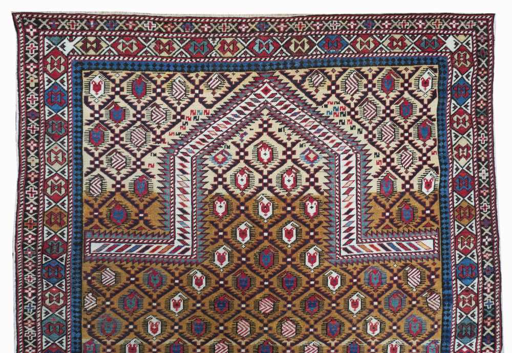 Antico tappeto Marasali da preghiera con annodatura fine e colorazioni antiche. Il “mihrab” e ricoperto da motivi “Boteh” in orientamento alternato con interni variegati. La colorazione dei motivi principali crea una raffinata struttura a disegno romboidale. La bordura principale è ornata con cartigli in fila con colorazioni alternanti.