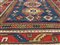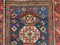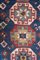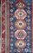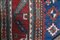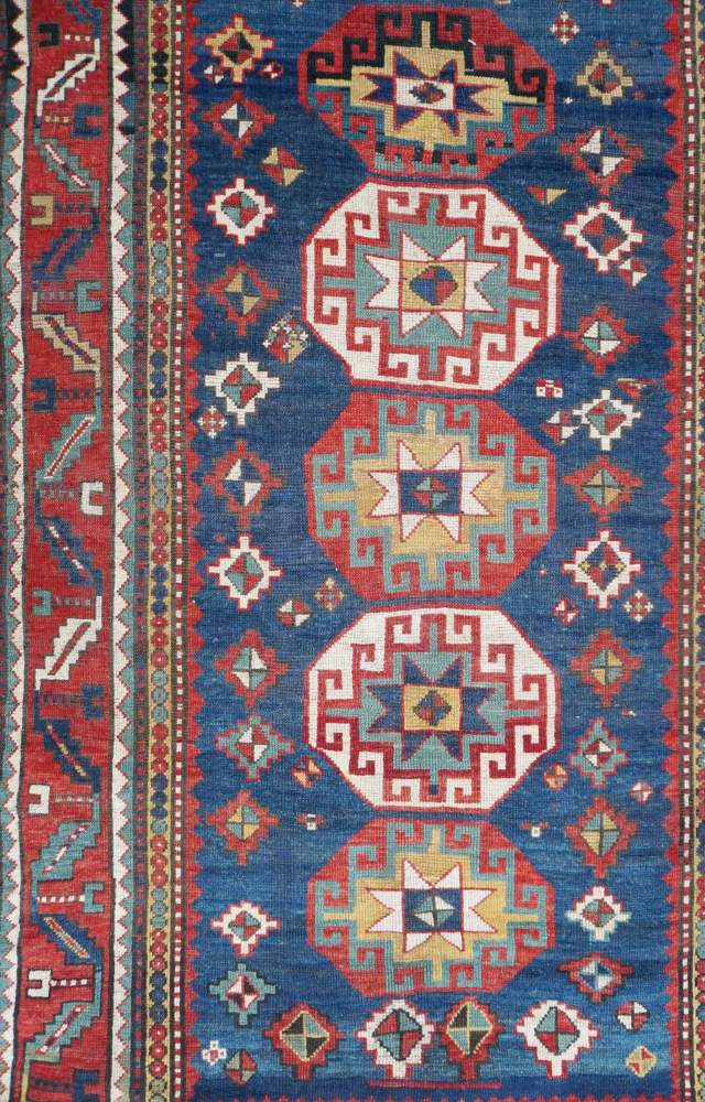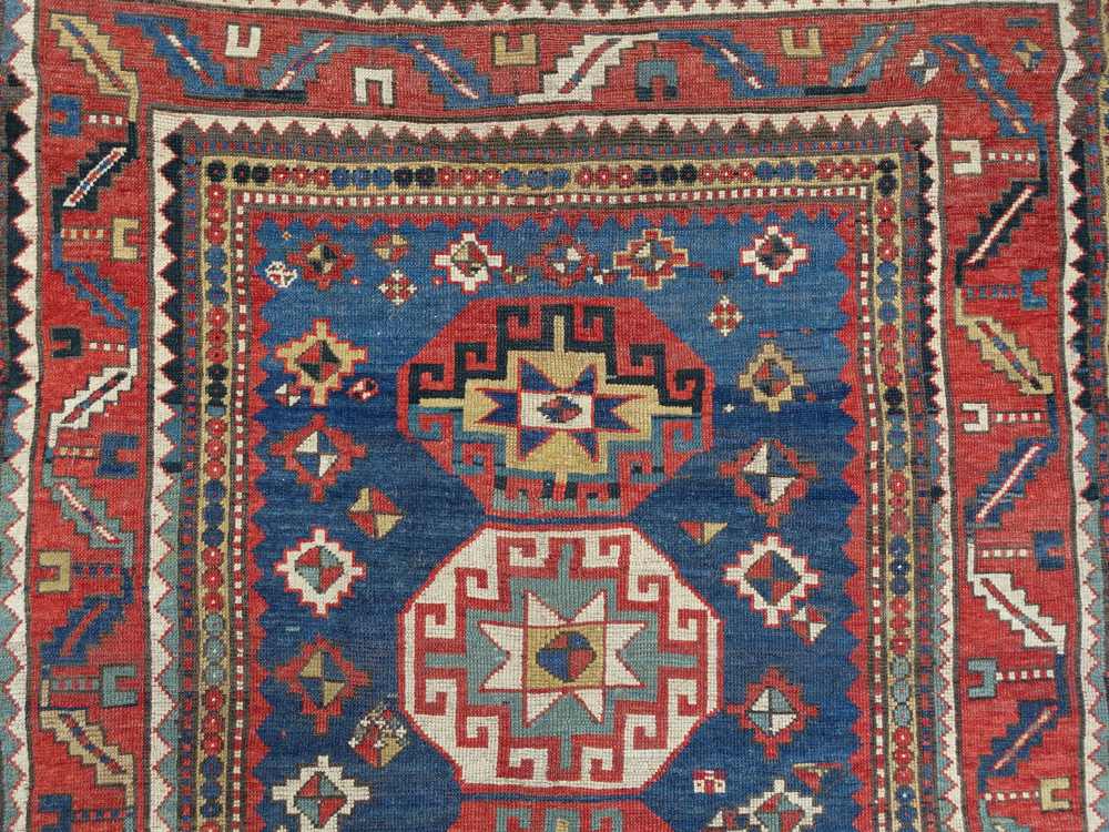 Cinque dei cosiddetti “Memling-Gul” in colorazioni alternati, spiccano sull’asse centrale del tappeto a fondo azzurro. Poligoni scalettati fungono come motivi di riempimento. Bordura principale a fondo rosso con ornamentazione ondeggiante, altamente geometrizzata.