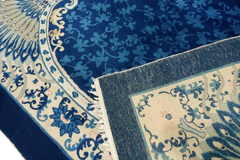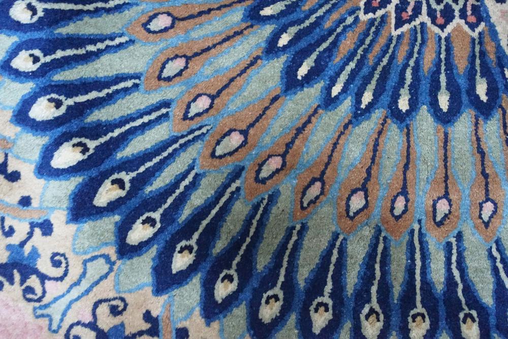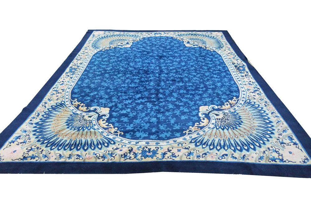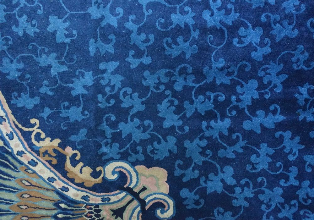 Il campo interno è interamente disegnato tono su tono con dei ramage floreali è circondato da monumentali decorazioni in maniere di coda di pavone. Tappeto molto decorativo in ottimo stato di conservazione.