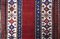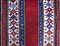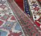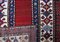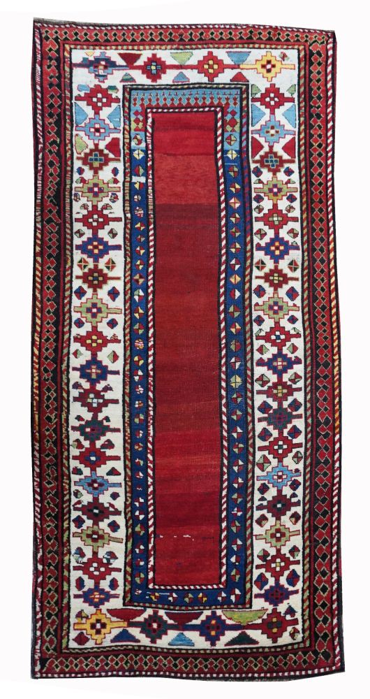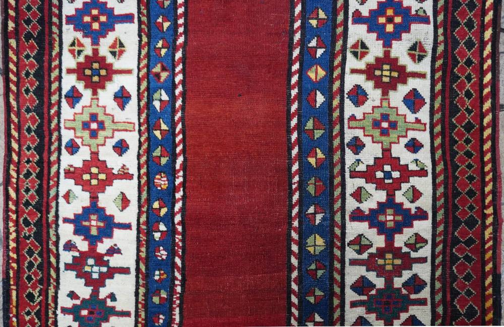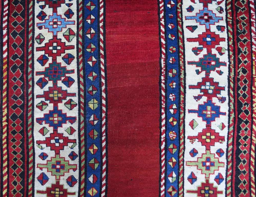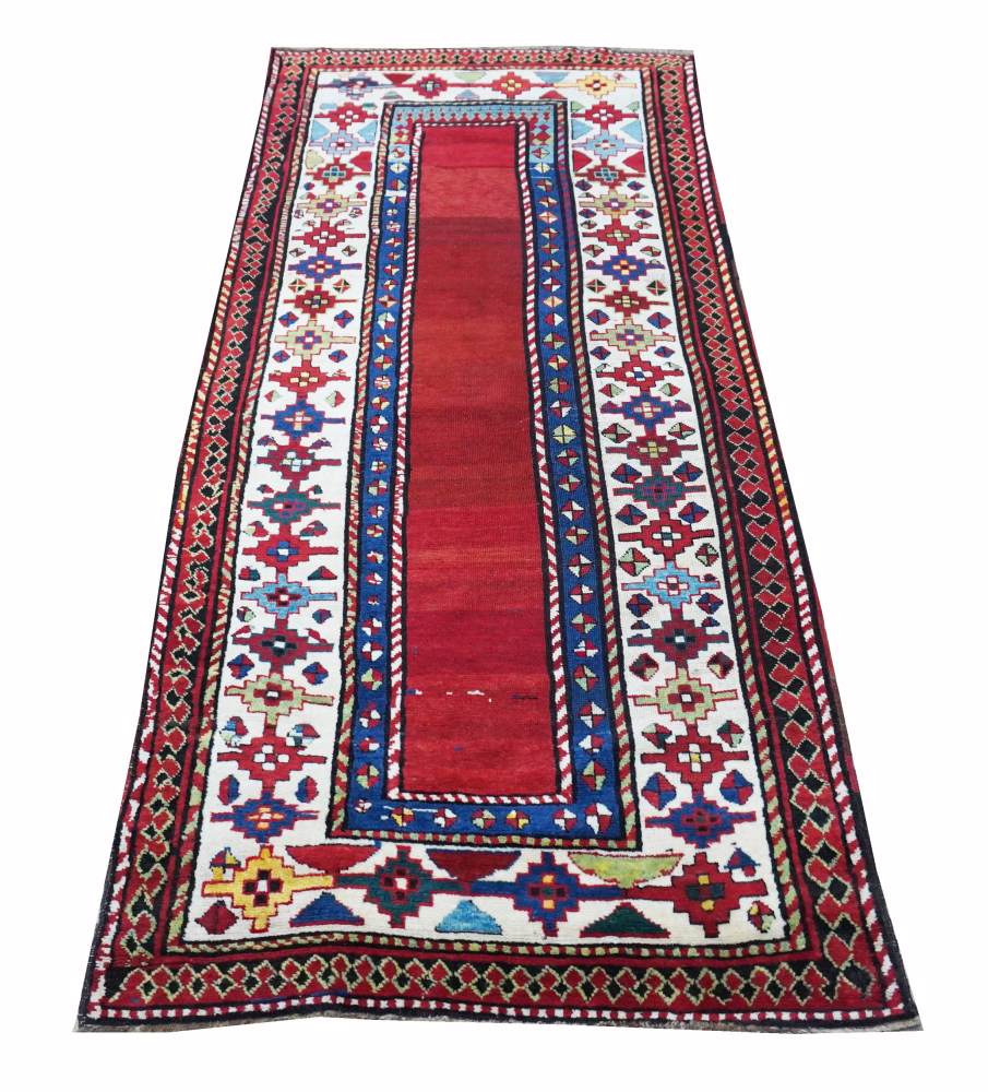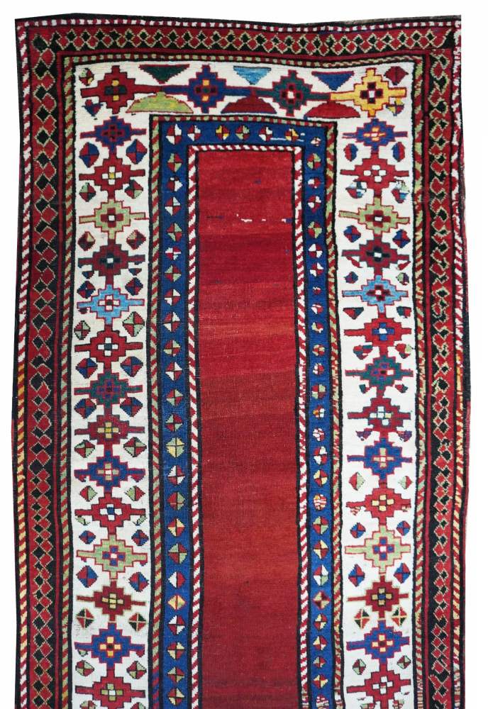 Tappeto Kazak con disegno Talish. Il campo interno “met-haneh” colorato in sfumature di rosso è circondato da una bordura principale a fondo bianco che mette in risalto poligoni scalettati allineati multicolori. La bordura esterna è ornata con il disegno “medachyl”. Grafica di impatto contemporanea e moderna.