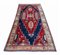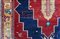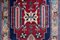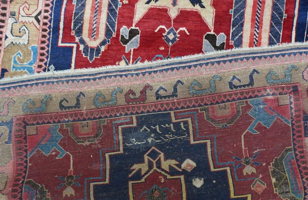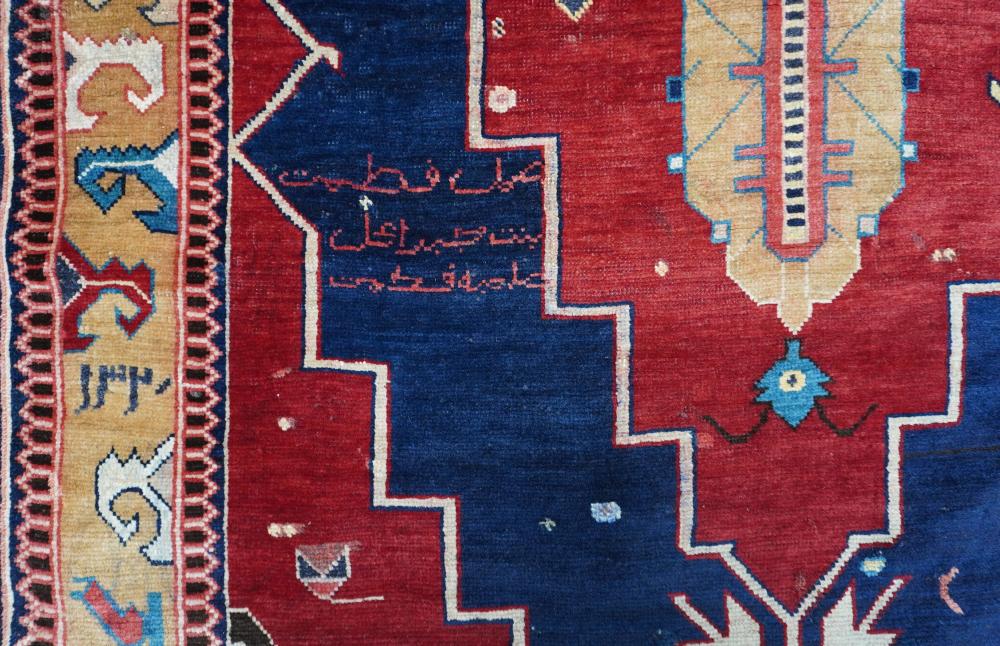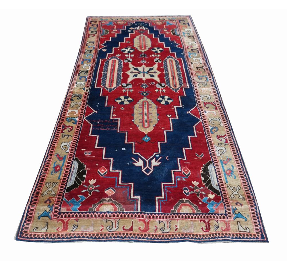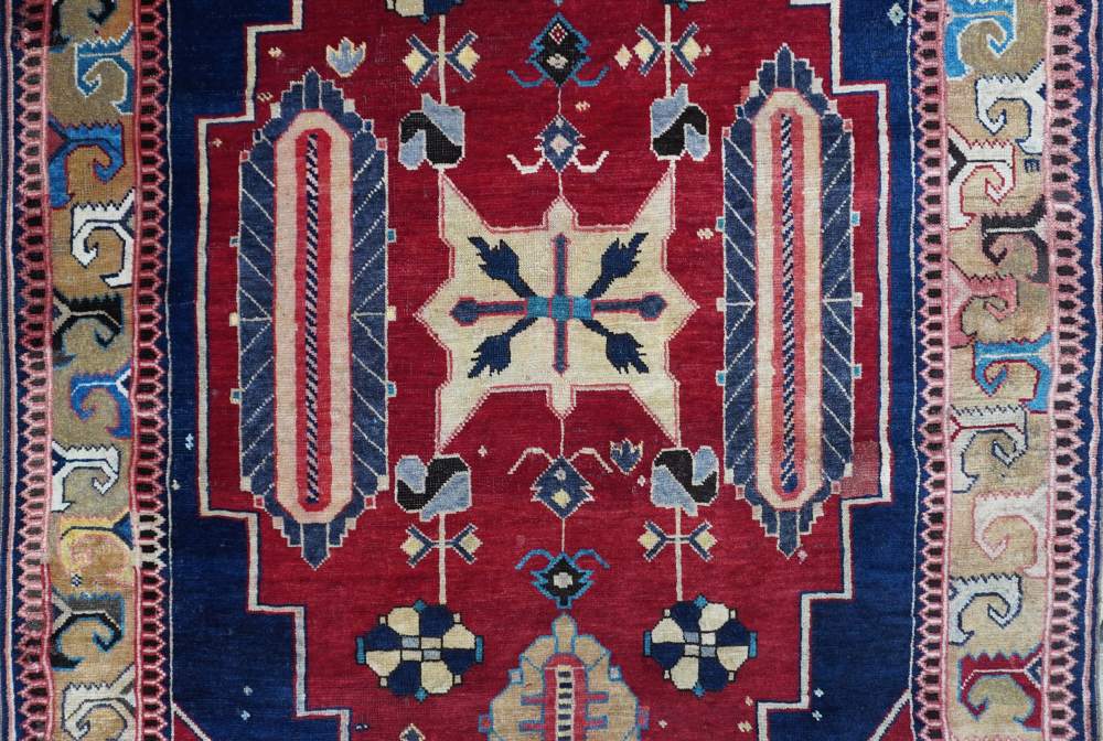 Un imponente medaglione con contorni scalettati domina in rosso la cartuccia di fondo color blu scuro. Sia il campo che gli angolari a fondo rosso sono decorati con grandi motivi geometrizzati. Bordura di espressione arcaica che ricorda i tappeti della zona di Avar. Il tappeto presenta diverse iscrizioni, tra cui la data 1328 che corrisponde alla data di 1910.