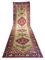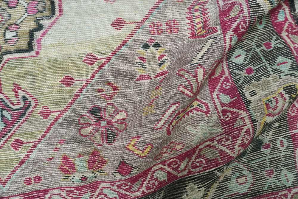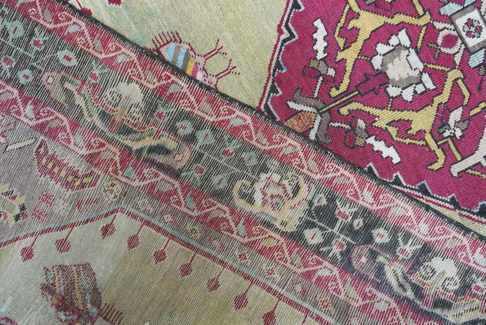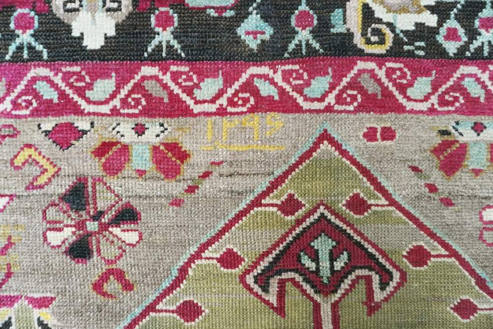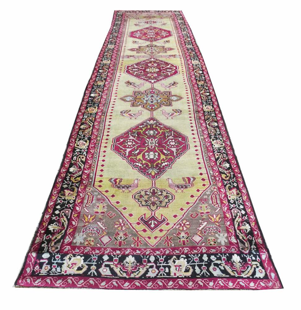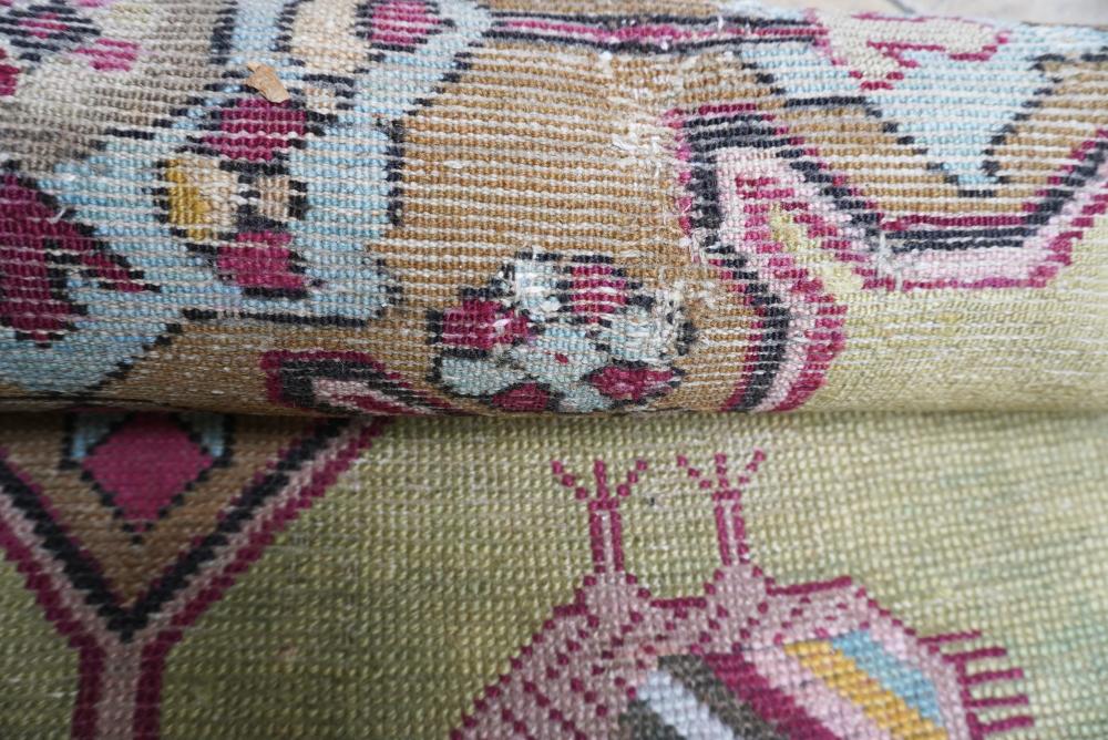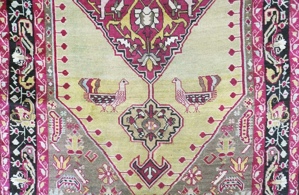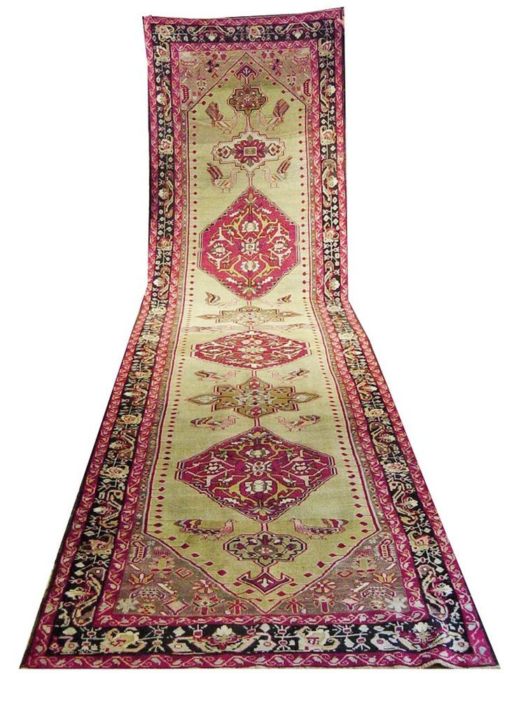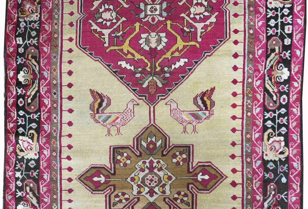 Passatoia che dispone di un raro fondo verde chiaro che metti in risalto i diversi medaglioni allineati sull’asse, affiancati da raffigurazioni di uccelli. Bordura principale a fondo nero decorata con ornamentazioni floreali geometrizzati.