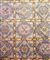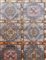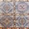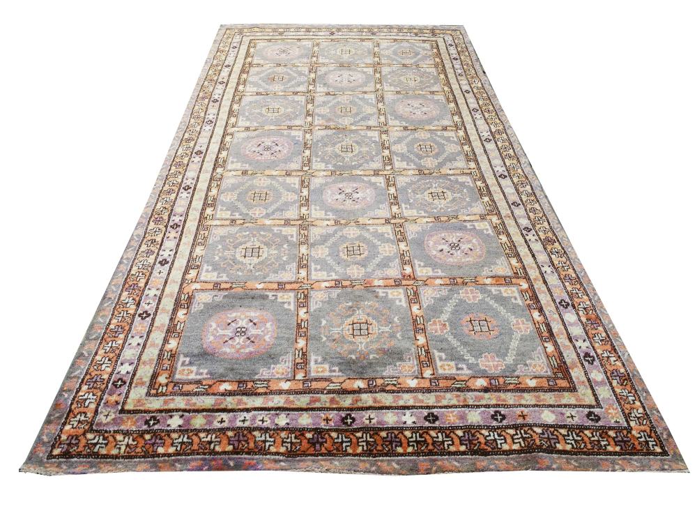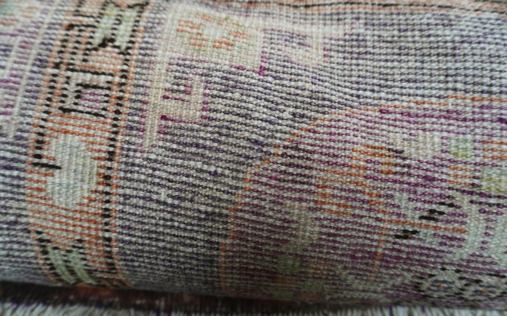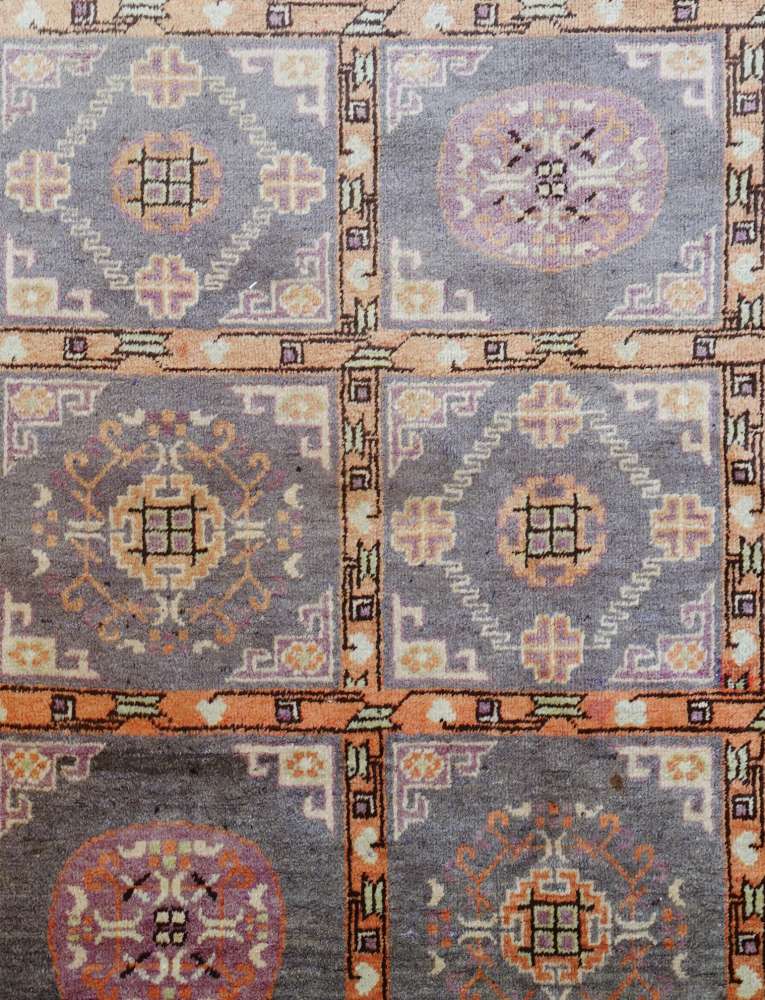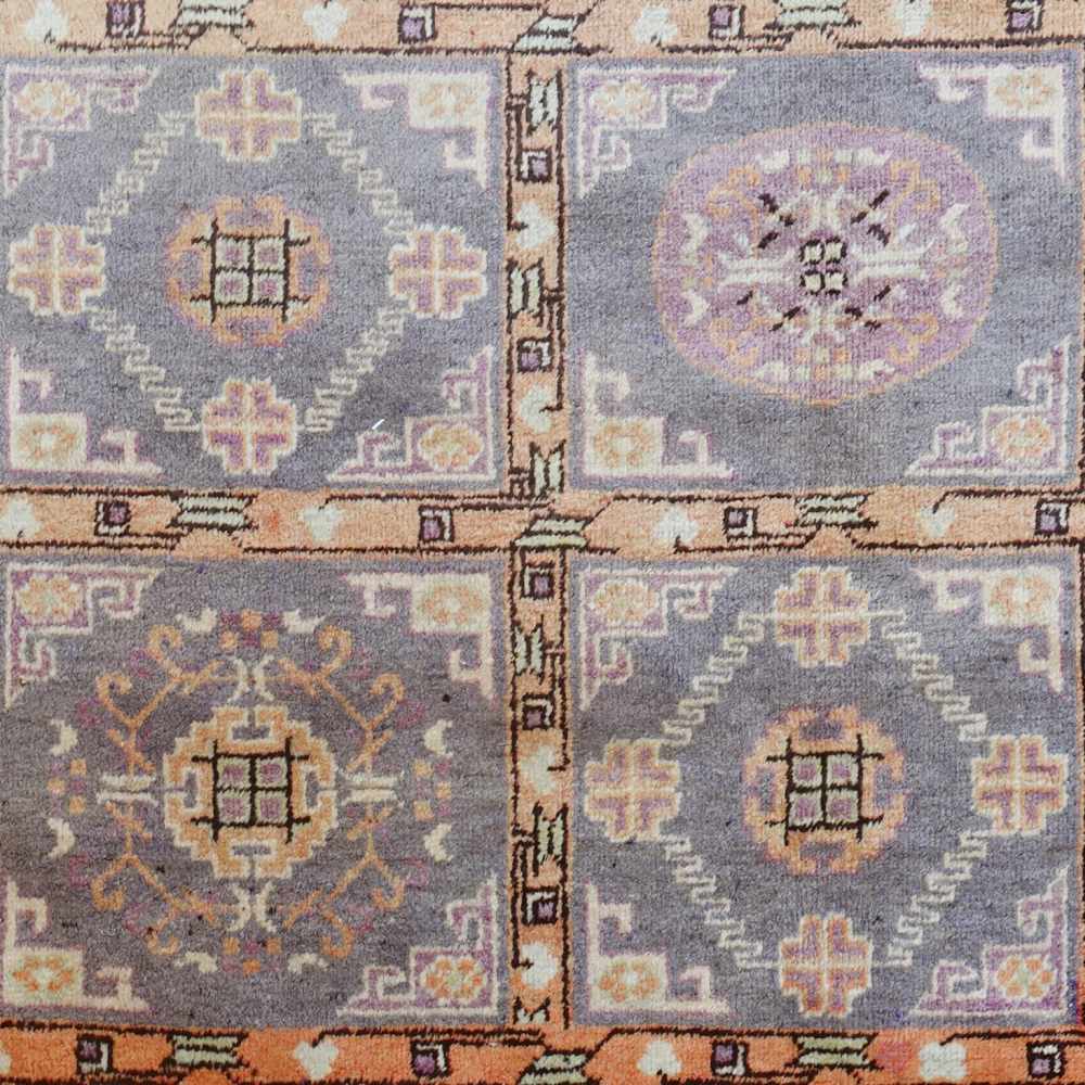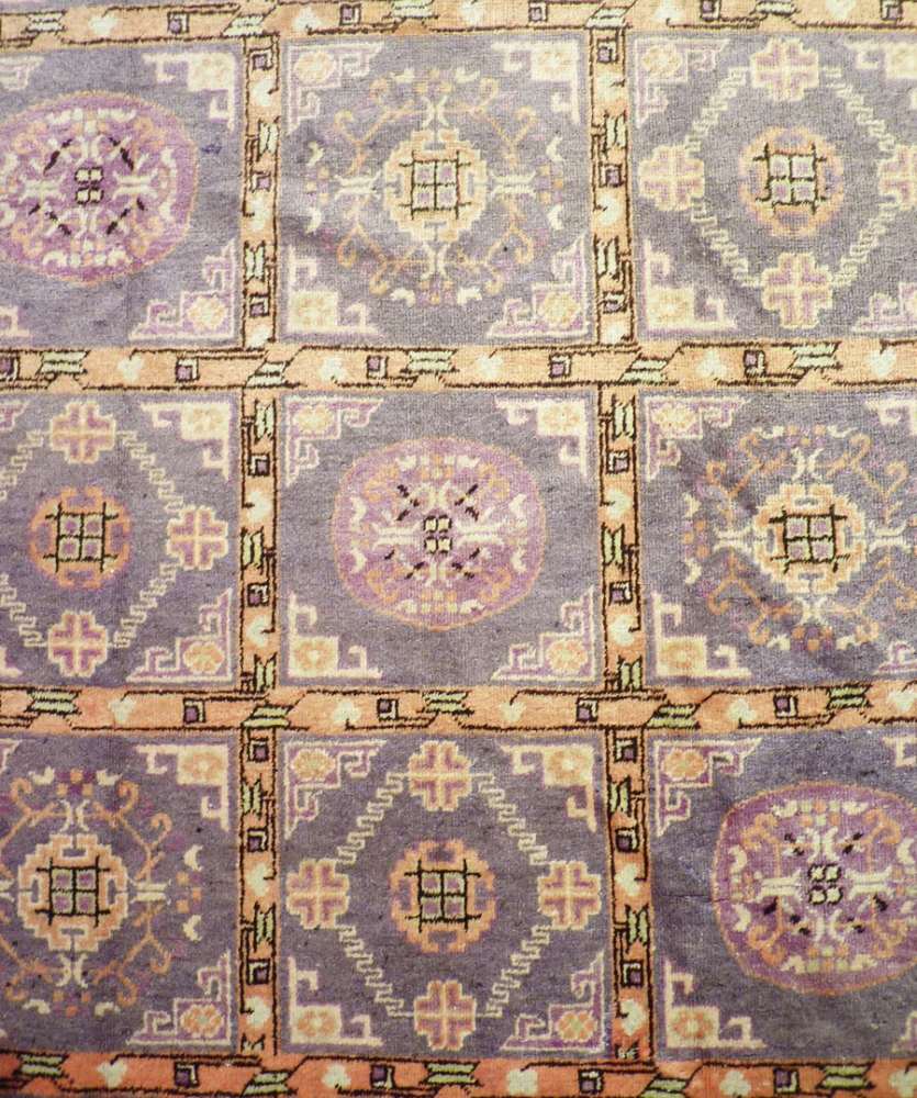 Tappeto molto decorativo con un campo suddiviso in cartigli rettangolari, decorati con vari medaglioni stilizzati. Colorazione tenue basata su sfumature di grigio, viola chiaro, bianco ed albicocca chiaro.