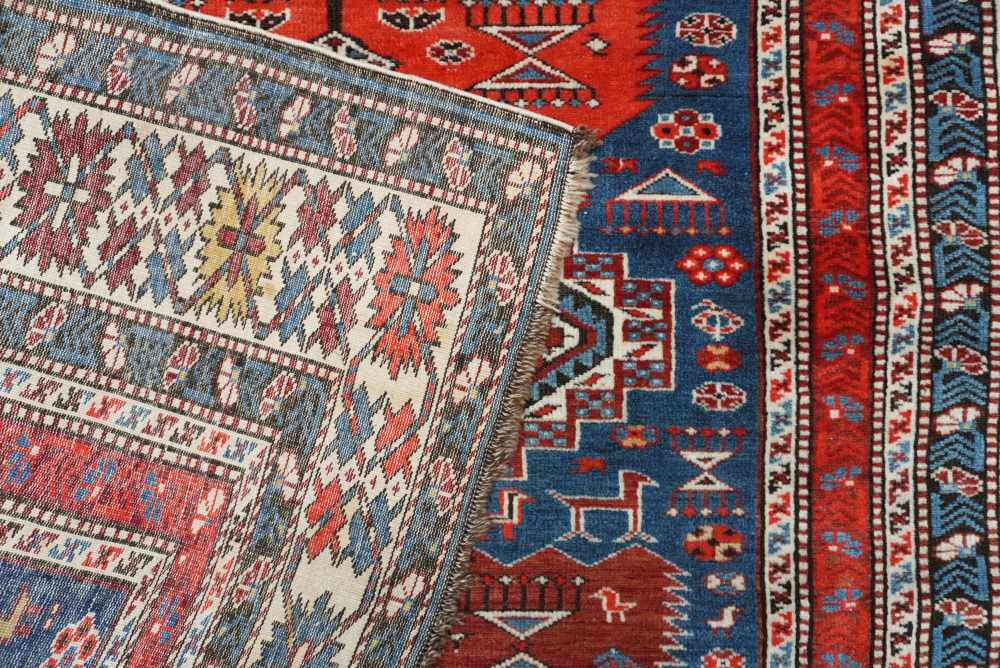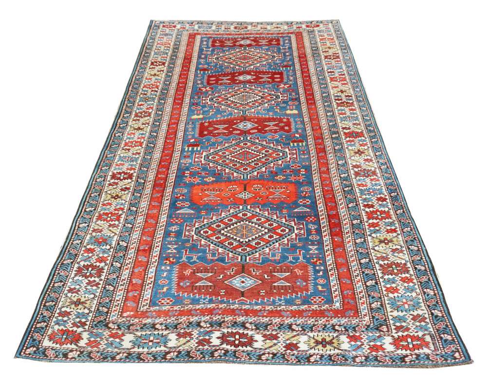 Tappeto Shirvan di considerevoli dimensioni, decorato in alternanza sul fondo azzurro con rombi scalettati e forme di foglie seghettate. Tra i motivi di riempimento alcune raffigurazioni di cammelli. Bordura principale con disegni geometrizzati e bordini a garofani stilizzati.