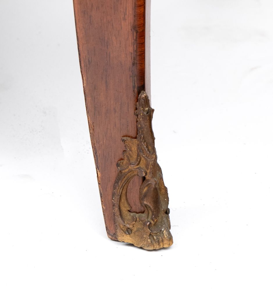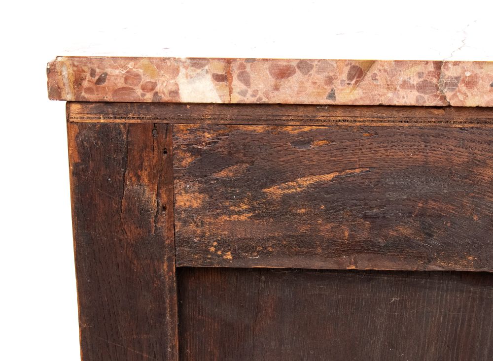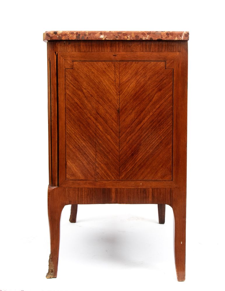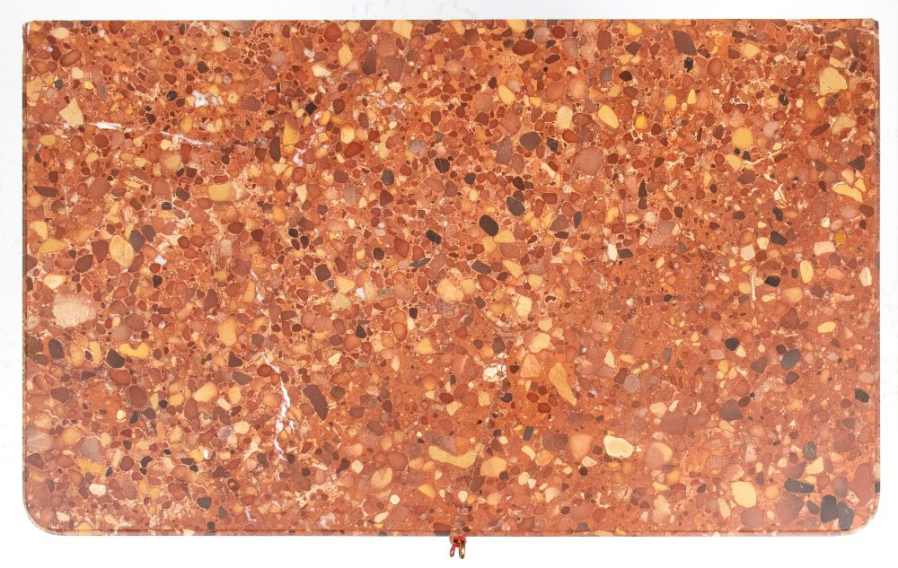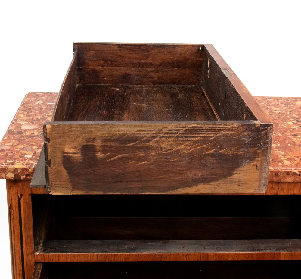 con marmo brecciato di tonalità rosso/arancio, fronte decorato da motivo a scanalature verticali e riserve geometriche. Gambe leggermente cabriolet con applicazioni in bronzo dorato.