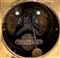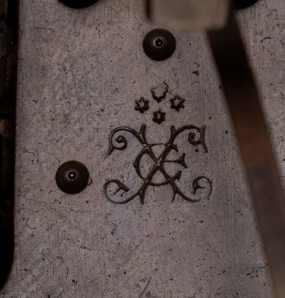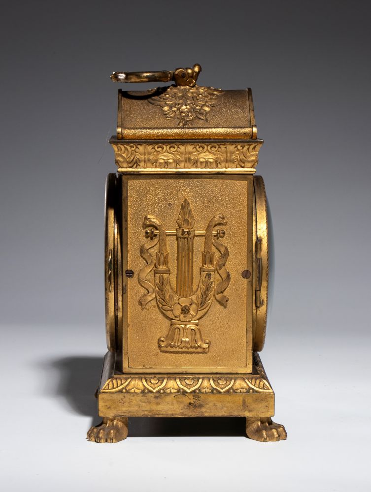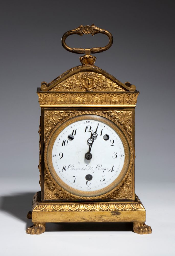 di forma architettonica con sommità arcuata sormontata da presa a maniglia finemente cesellata. Decorata con motivi classici di gusto Impero, tra cui la testa femminile entro le ghirlande, fregi vegetali e applicazioni laterali a trofeo musicale con lira. Quadrante circolare in smalto bianco, con numerazione araba e minuteria "chemin de fer", firmato Courvoisier & Compagnie. Lancette in acciaio brunito traforato.