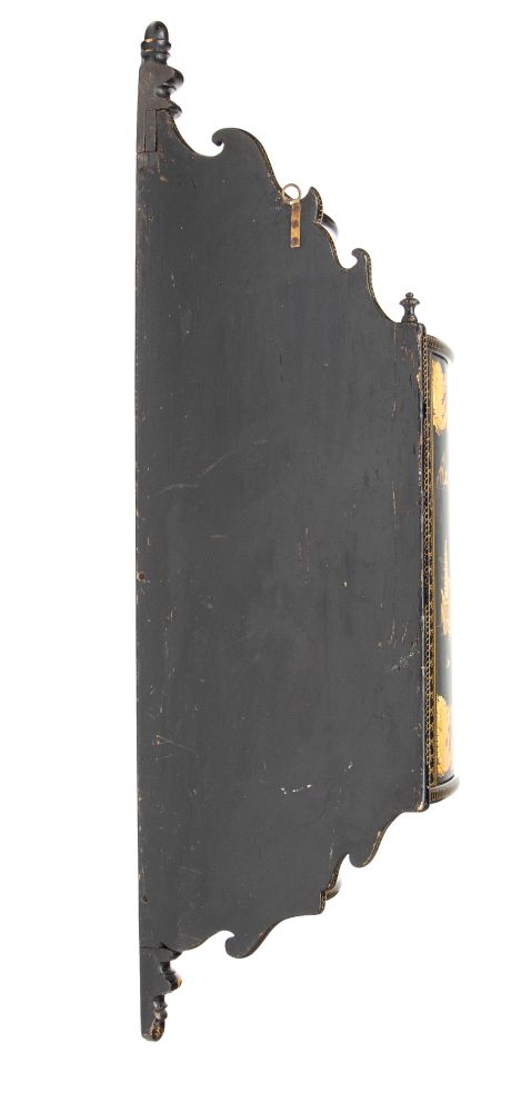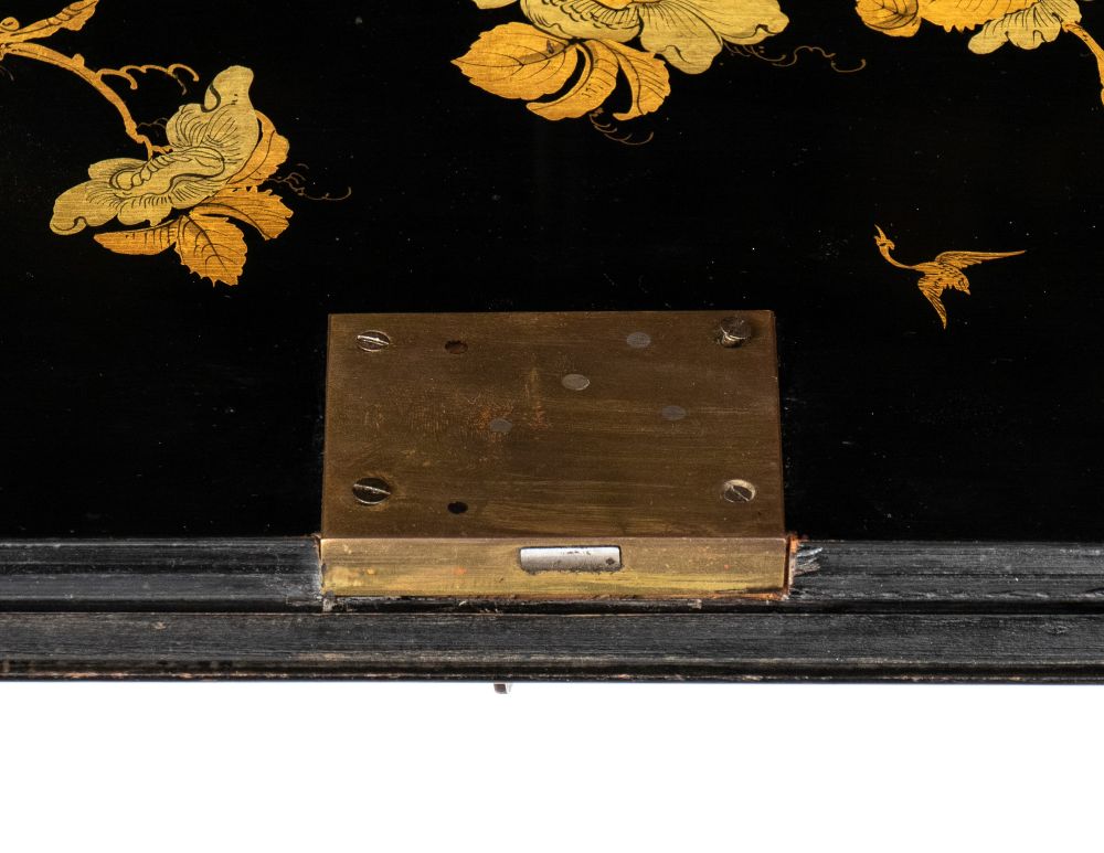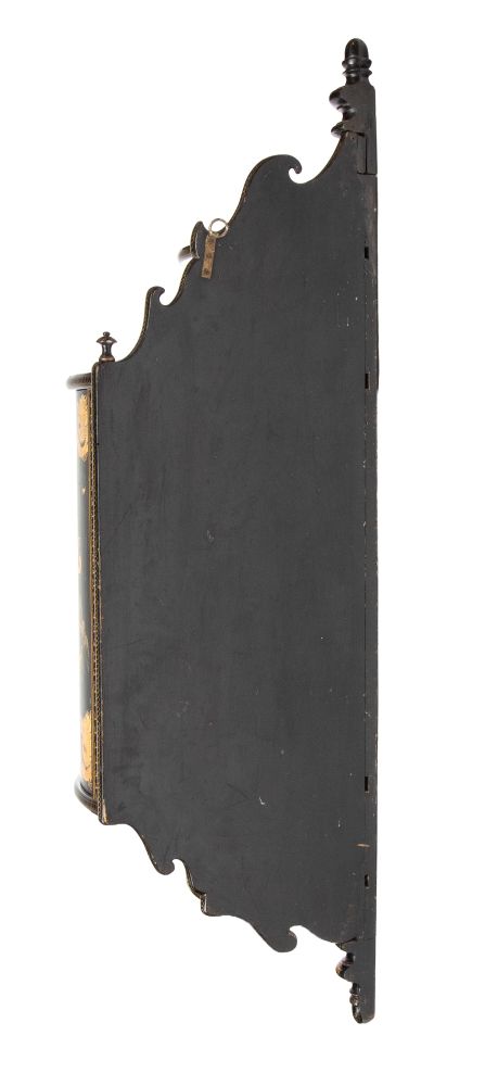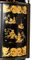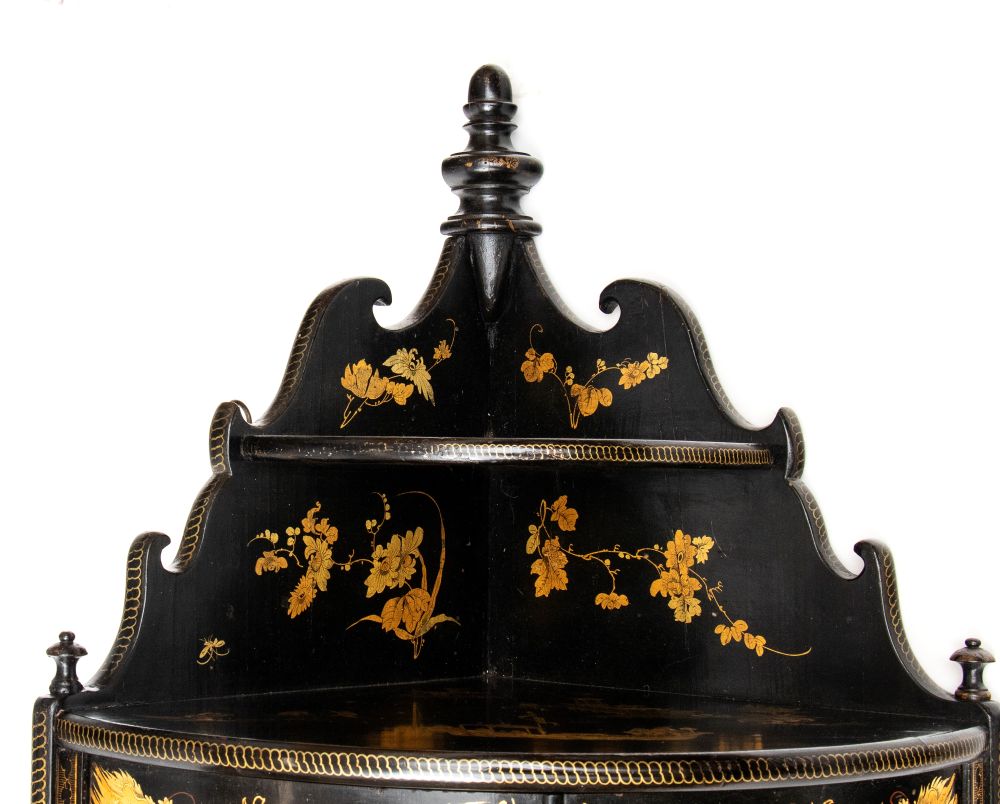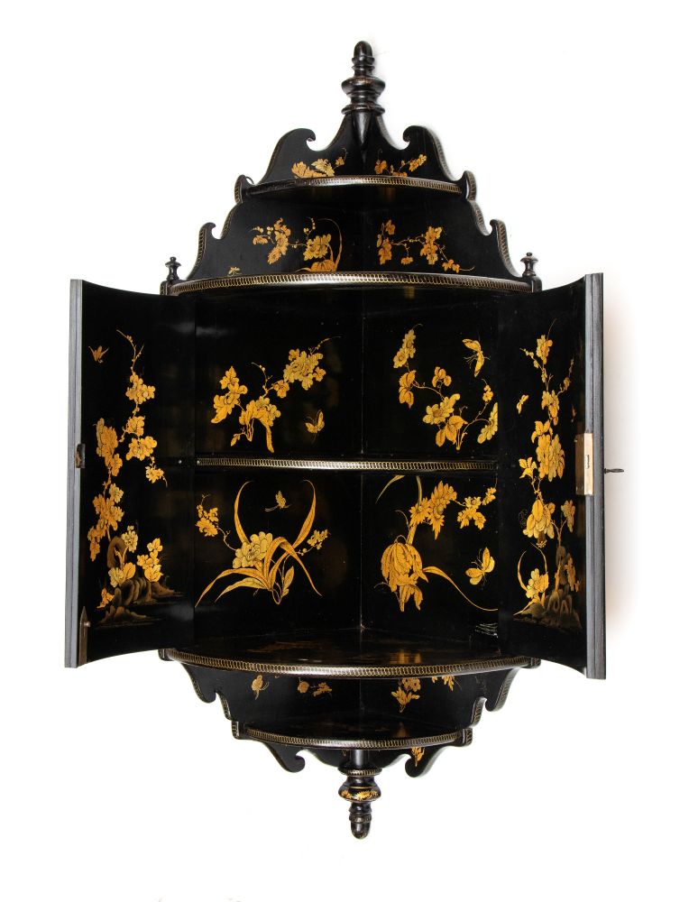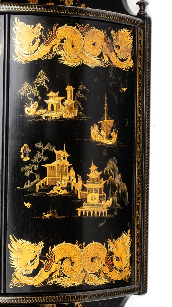 in legno laccato nero, riccamente decorata con motivi dorati in stile Chinoiserie, raffiguranti paesaggi orientali con pagode, figure, imbarcazioni e draghi stilizzati. Il mobile presenta fronte bombato a due ante, con profili sagomati e cimasa superiore mossa, arricchita da elementi ornamentali torniti. Interno laccato e decorato en suite con motivi floreali dorati, completo di ripiano centrale.