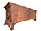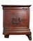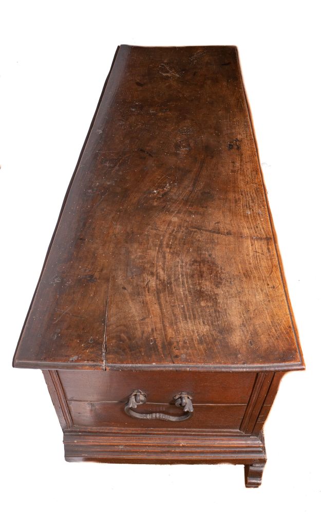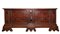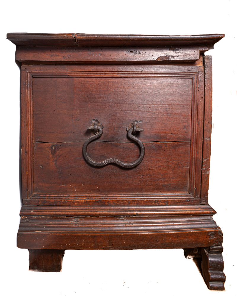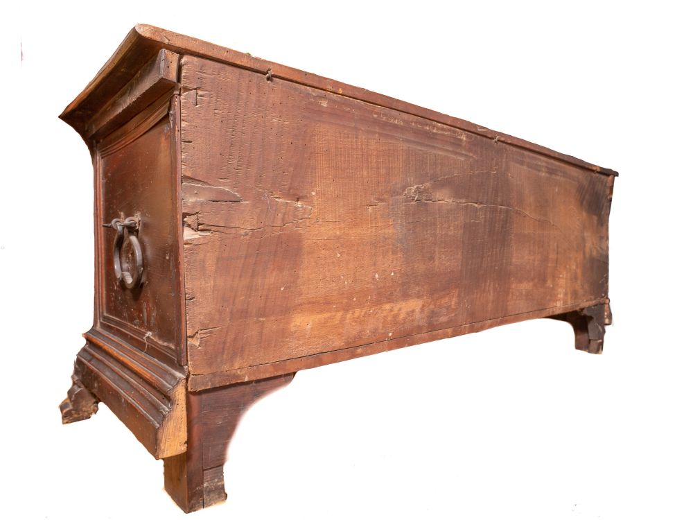 in legno di noce con ricca decorazione a tarsia geometrica e motivi fitomorfi. Sul fronte tre pannelli riquadrati, con intarsi a fogliami stilizzati. Base con piedi a volute intagliate con elementi vegetali.