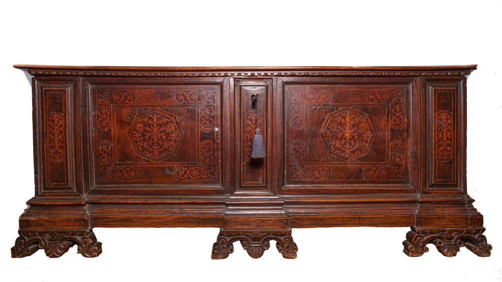 Cassapanca rinascimentale intarsiata - Italia settentrionale, XVII secolo