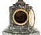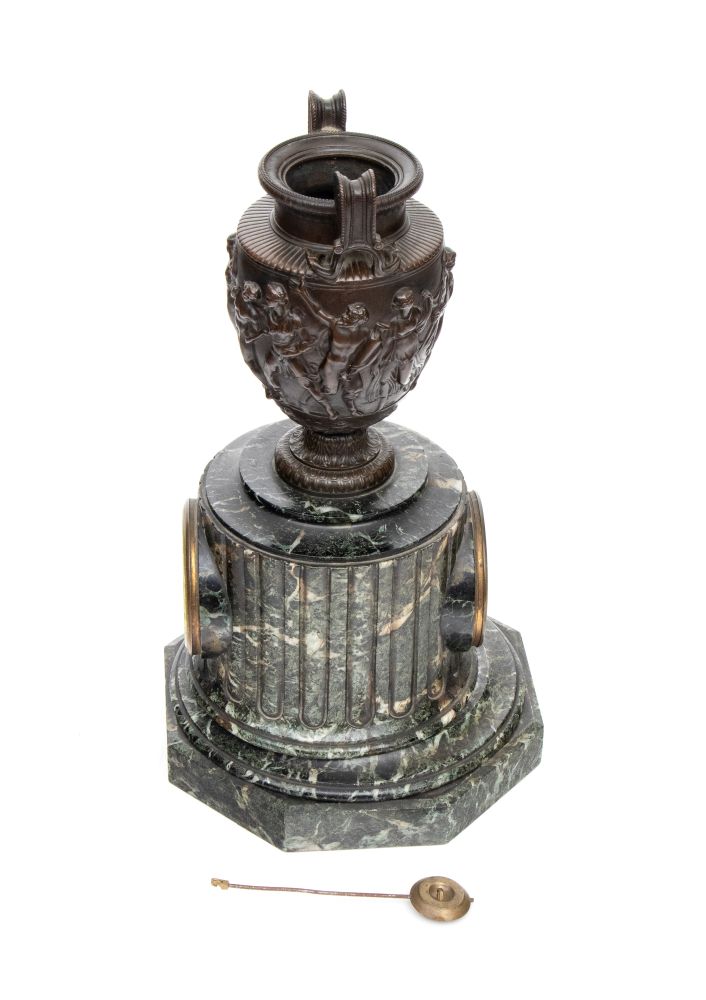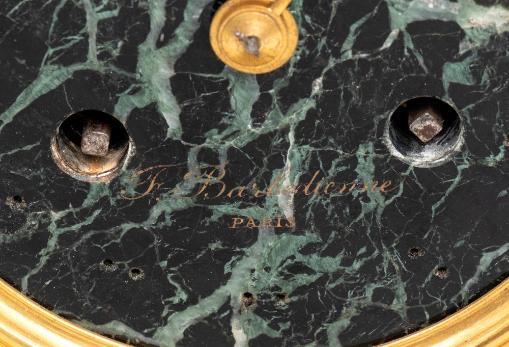 orologio da camino in stile neoclassico con corpo in marmo verde, arricchito da cassa in bronzo patinato a forma di cratere ornato da figure danzanti in altorilievo, ispirate al celebre vaso Borghese. Quadrante circolare in marmo con numeri romani, ghiera in bronzo dorato e firmato al centro del quadrante "F. Barbedienne".