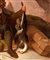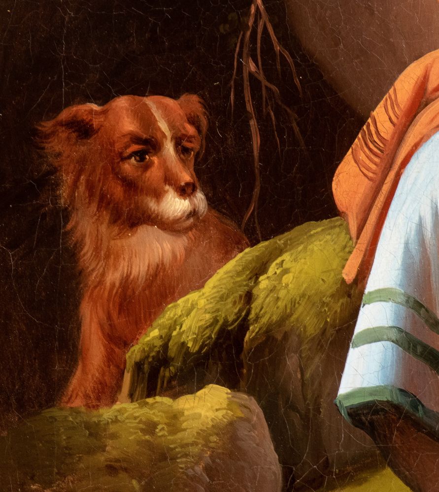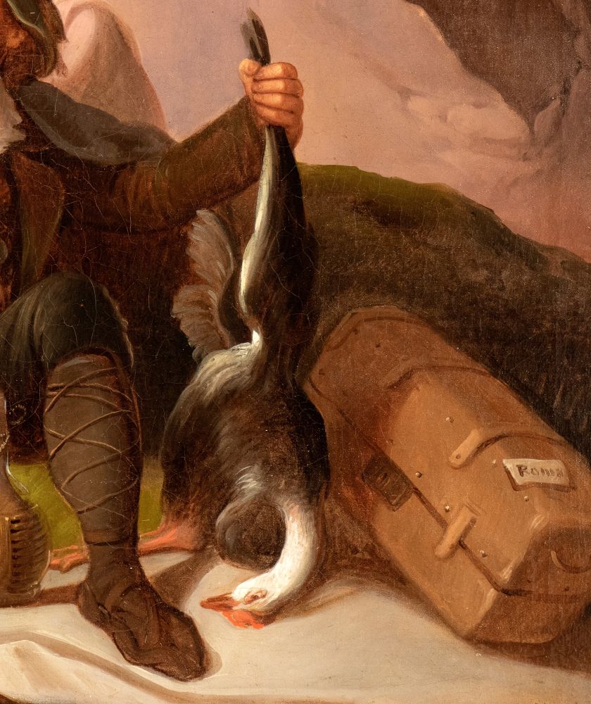 Quest’opera di raffinata esecuzione, attribuibile alla cerchia o alla maniera di Georg Waldmüller, raffigura una scena familiare ambientata in un paesaggio roccioso, con un cacciatore che mostra orgogliosamente una preda — una grossa oca selvatica — alla moglie e ai figli. La composizione è caratterizzata da una resa luministica calda e naturalistica, tipica del Biedermeier viennese, e da una cura quasi fotografica nel descrivere i dettagli del vestiario, delle espressioni e degli oggetti quotidiani.