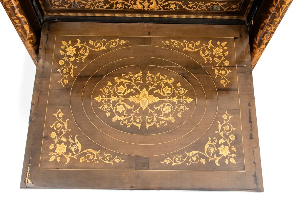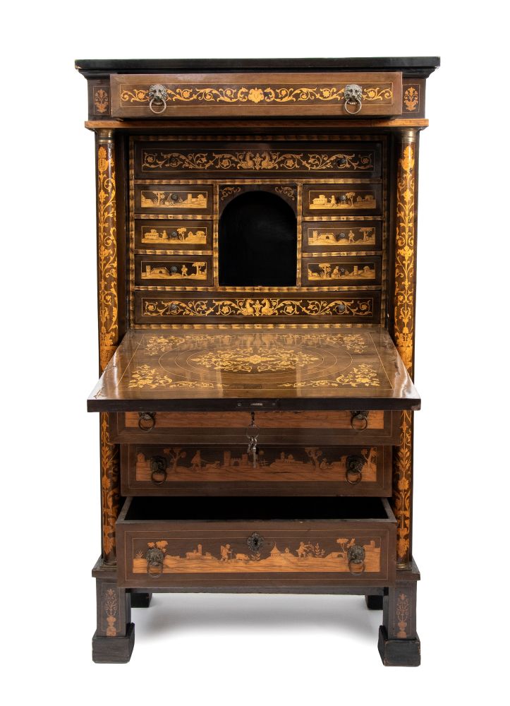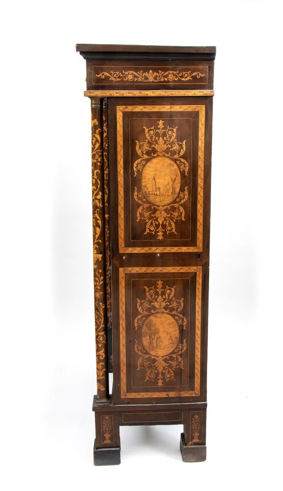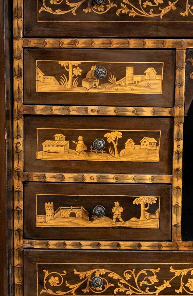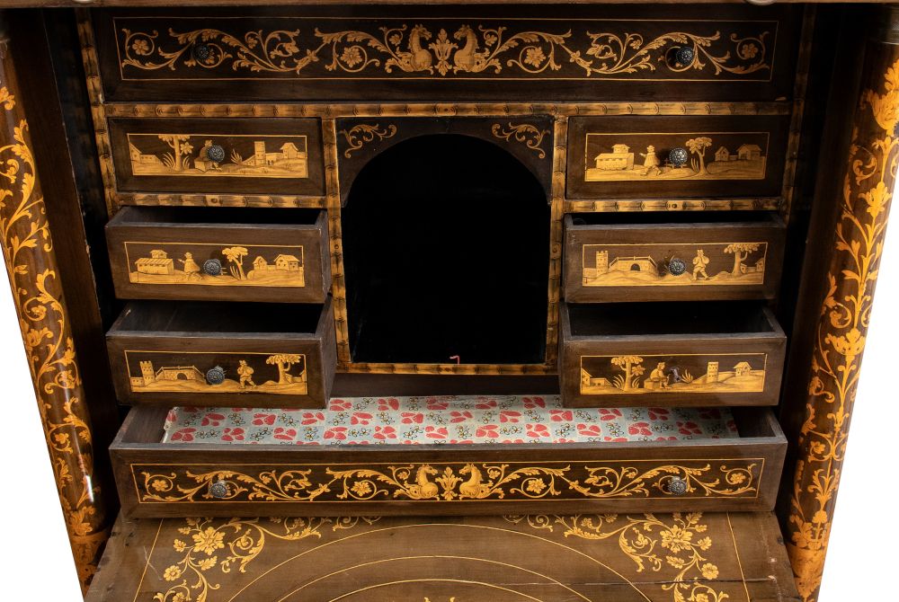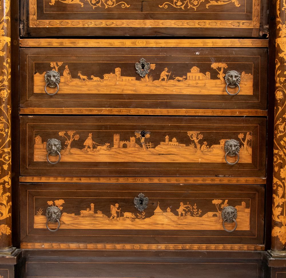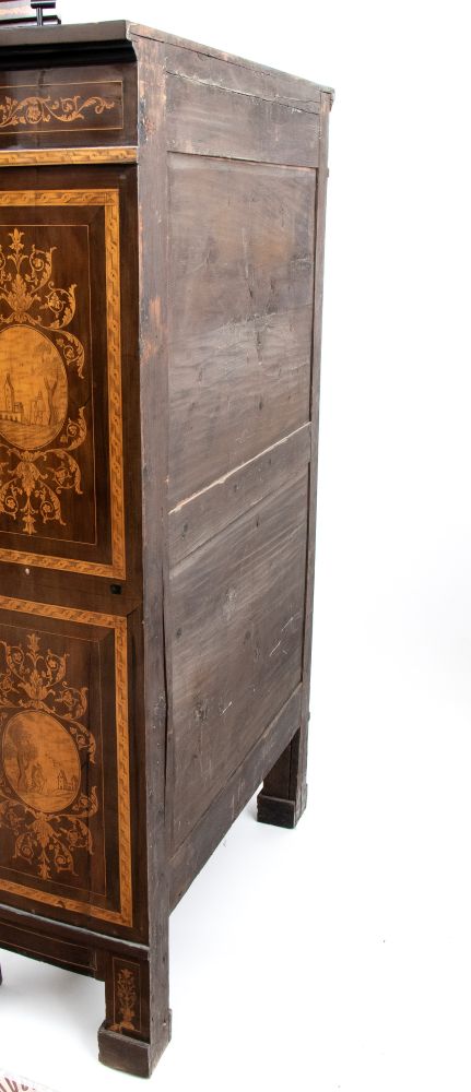 elegante secretaire finemente intarsiato, di produzione lombarda, caratterizzato da ricca decorazione a motivi vegetali, architettonici e figurati in legni chiari su fondo scuro.Fronte scandito da tre cassetti più uno superiore sotto piano e da una ribalta centrale decorata da una scena classicheggiante entro medaglione ovale.