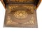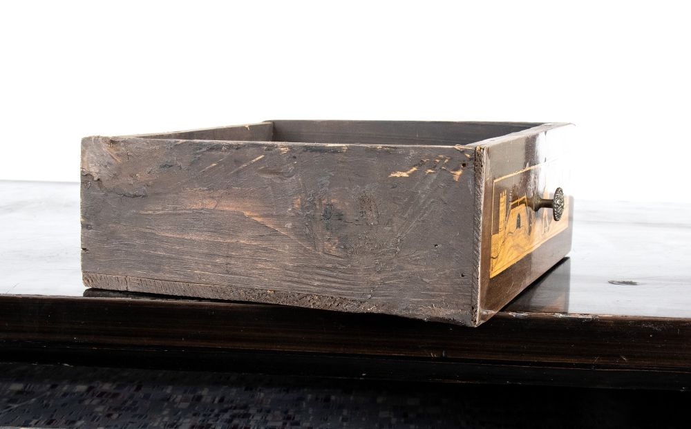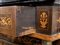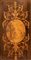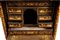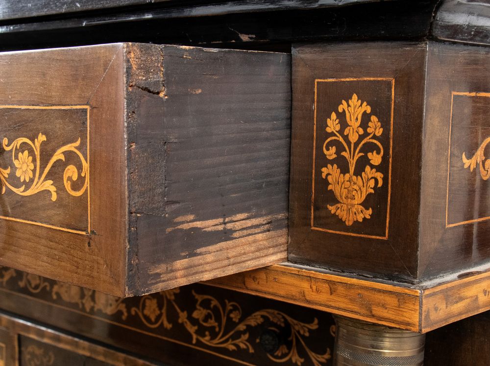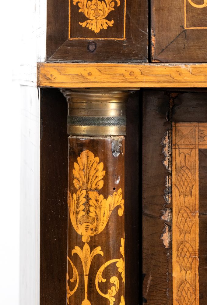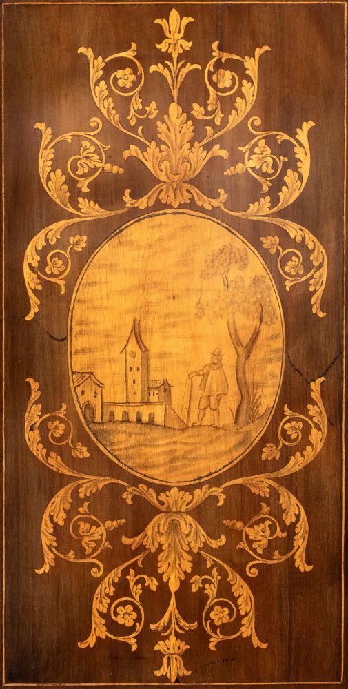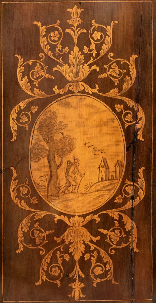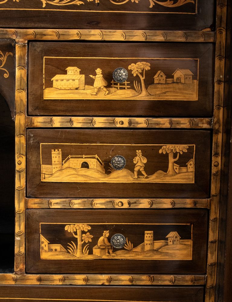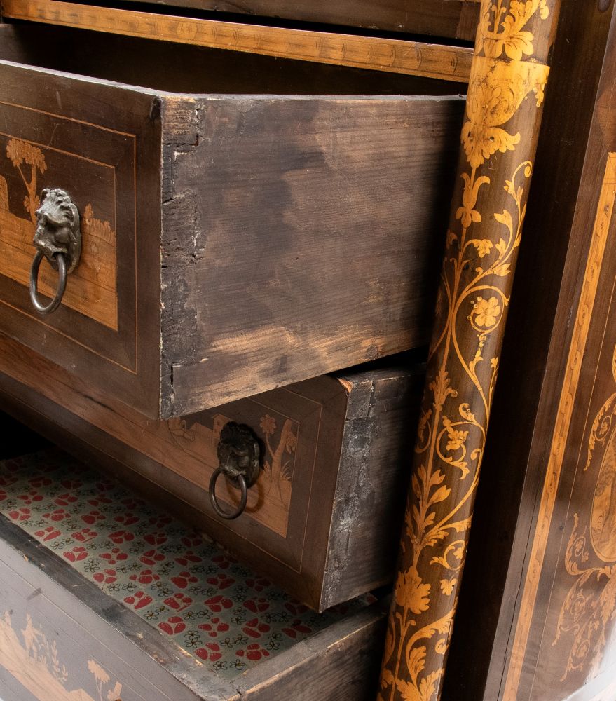 elegante secretaire finemente intarsiato, di produzione lombarda, caratterizzato da ricca decorazione a motivi vegetali, architettonici e figurati in legni chiari su fondo scuro.Fronte scandito da tre cassetti più uno superiore sotto piano e da una ribalta centrale decorata da una scena classicheggiante entro medaglione ovale.