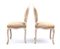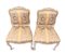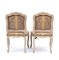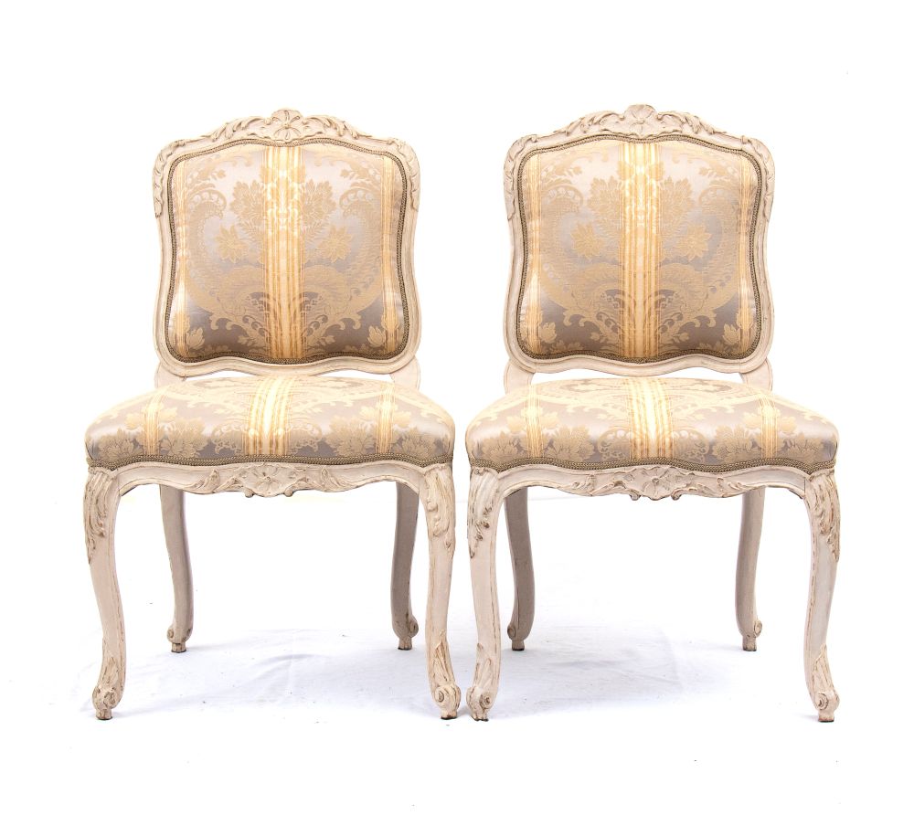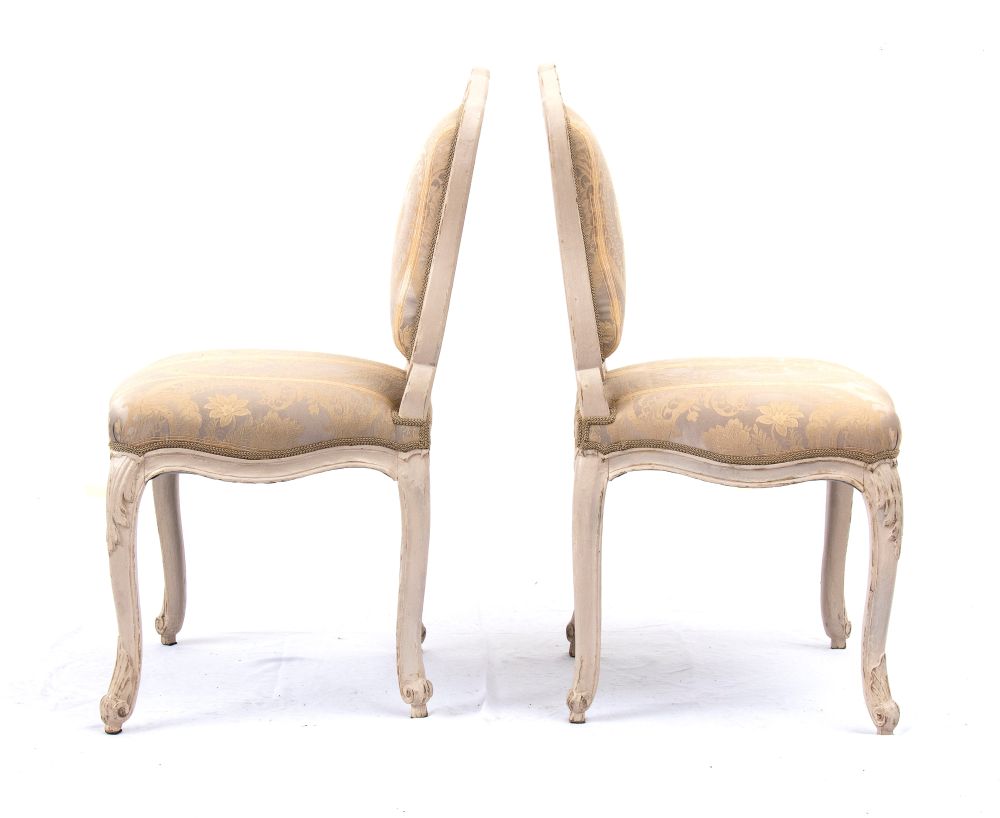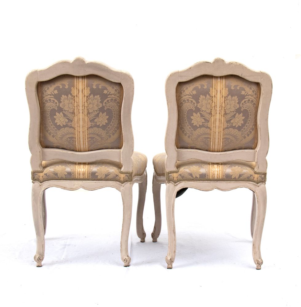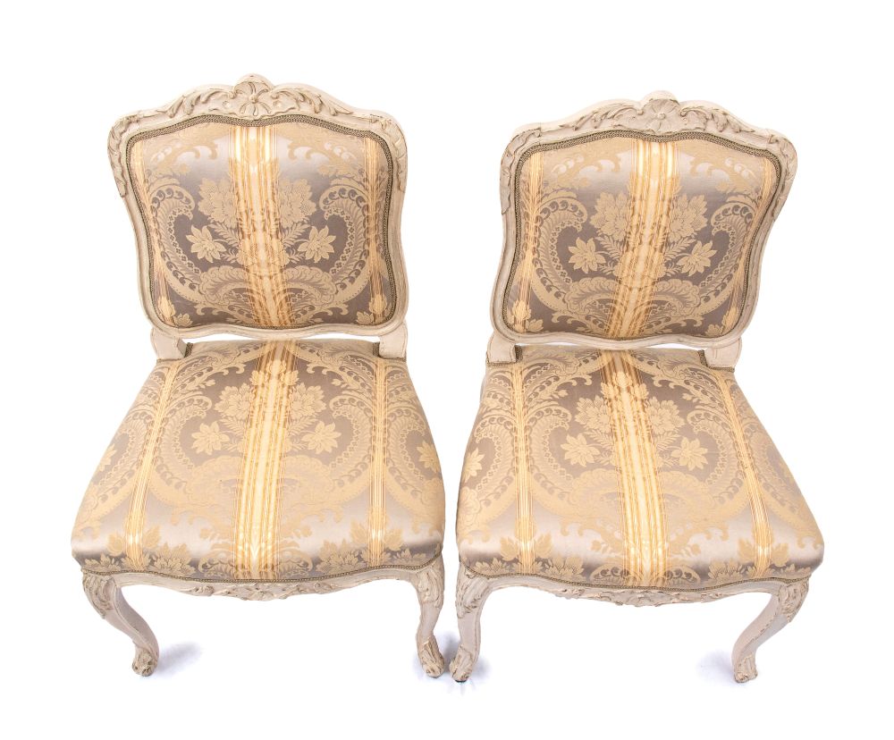 Questa elegante coppia di poltrone à la reine del periodo Luigi XV, marchiate LEDUC, provengono dalla bottega parigina "la Providence" di Pierre Leduc , in rue de Cléry, dedicata alla produzione di sedute di lusso. Presentano rivestimento color crema con seta damascata su fondo grigio.