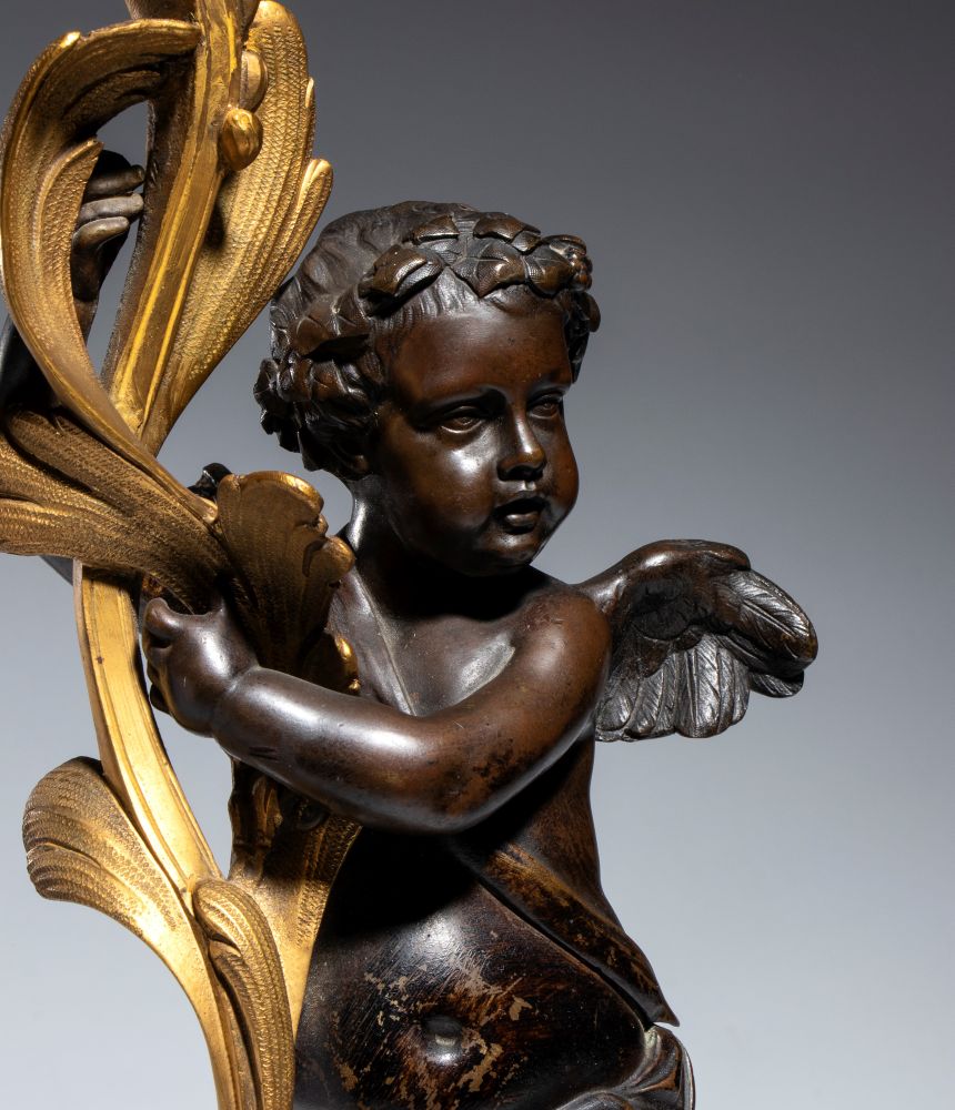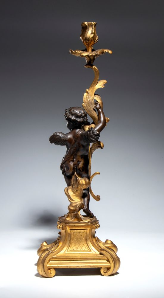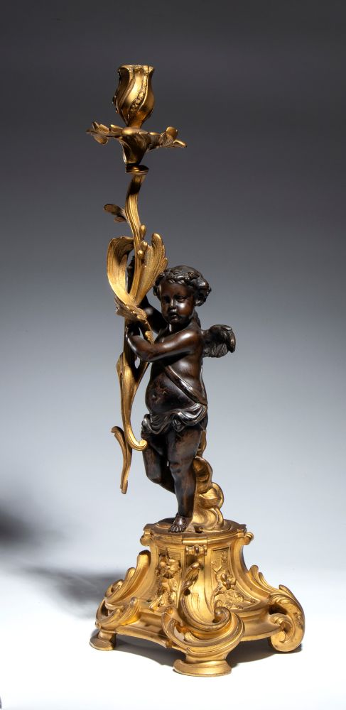 in bronzo dorato e patinato, raffinato candeliere con putto a tutto tondo che, in posizione dinamica, sostiene un elemento vegetale stilizzato culminante in portacandela a forma di bocciolo. Fusione a cera persa, cesellatura di alto livello e doratura al mercurio.
