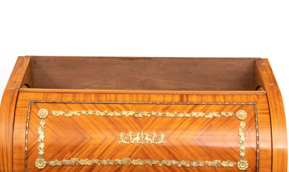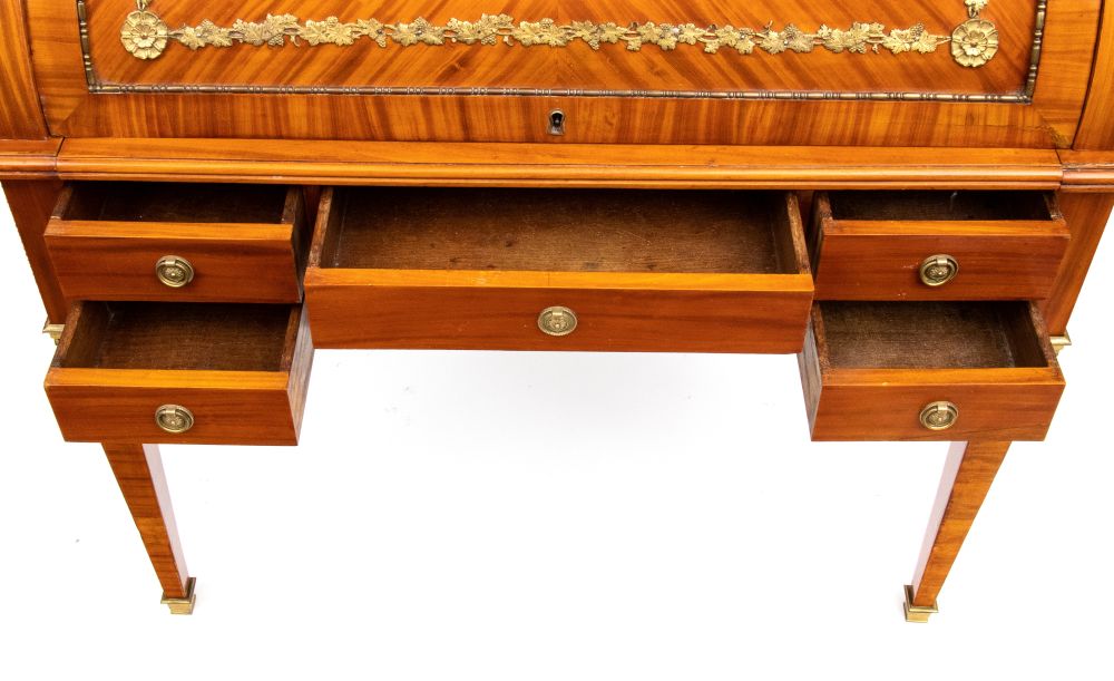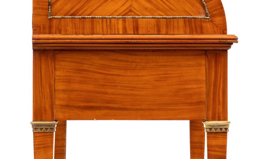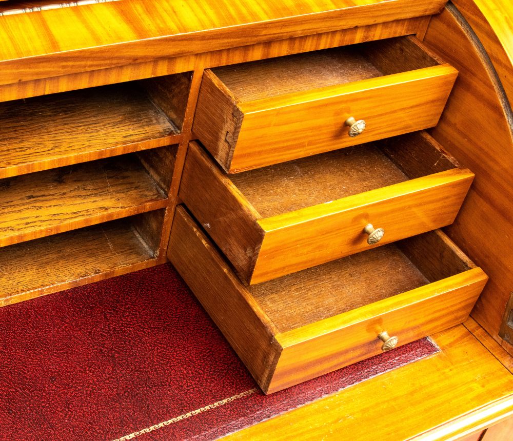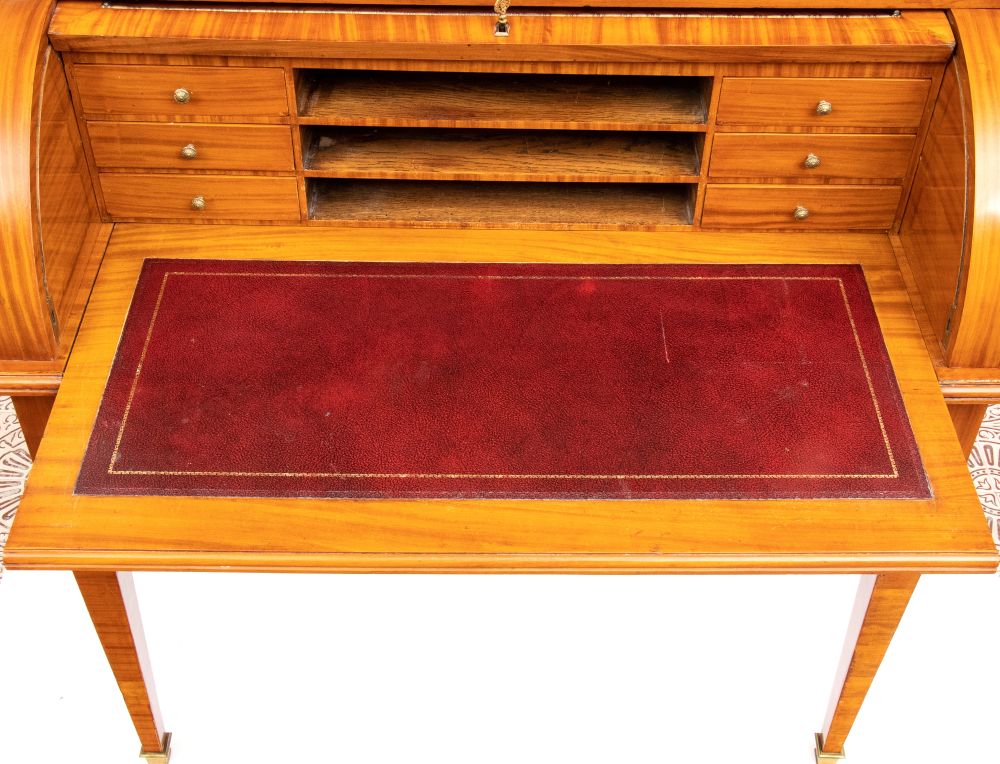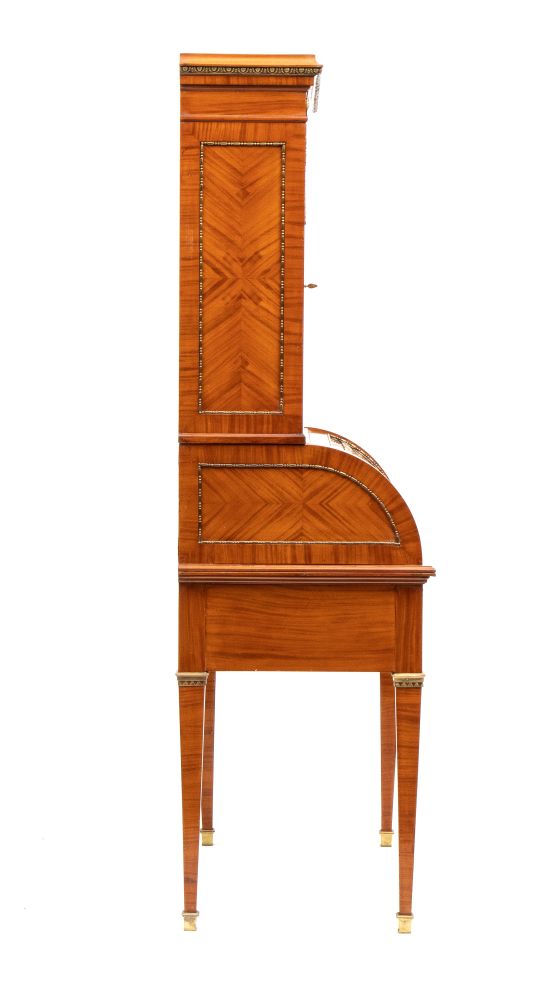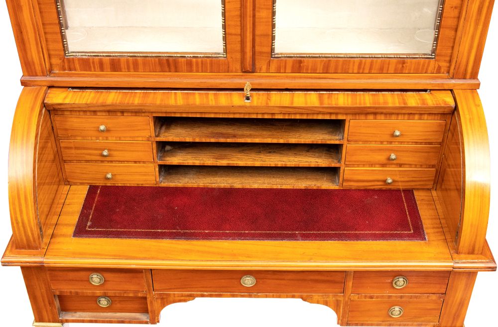 secretaire a rullo con alzata a vetrina, con applicazioni in bronzo dorato di gusto neoclassico. La parte superiore presenta due ante vetrate con profili smussati e interni con ripiani, coronata da cornice modanata e fregi dorati. La parte inferiore è composta da un piano scrittoio celato da serrandina a rullo, decorata con motivi floreali e greche in bronzo dorato. Nella parte sottostante ordine di 5 cassetti con pomelli di ottone. Il cassetto centrale si apre con pulsante segreto posto sotto il montante inferiore del cassetto centrale. Gambe tronco piramidali scanalate con terminali e capitelli in bronzo dorato. Firmato Maple&Co con etichetta originale "Maple's Depositary" applicata sul retro della fodera.