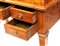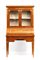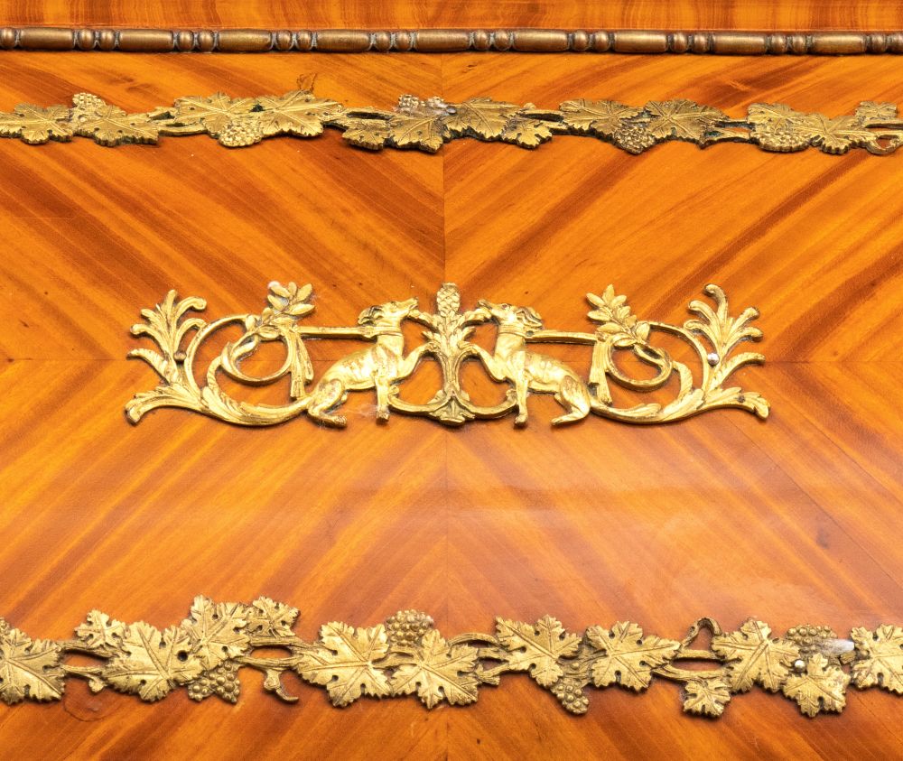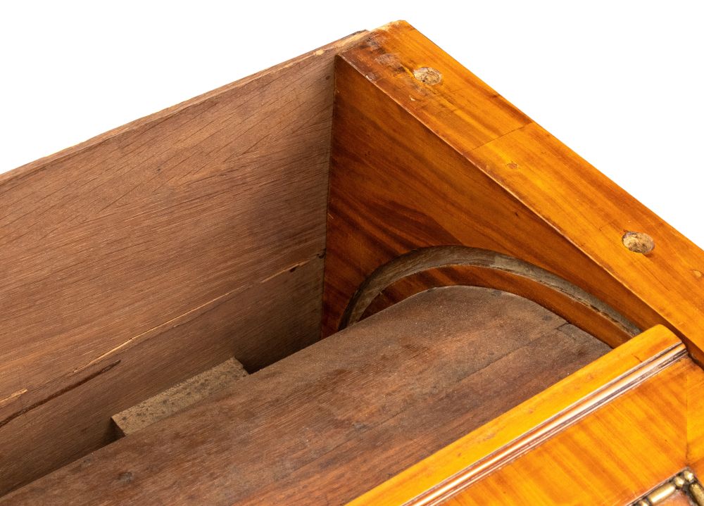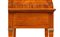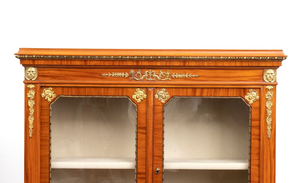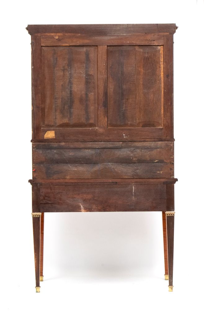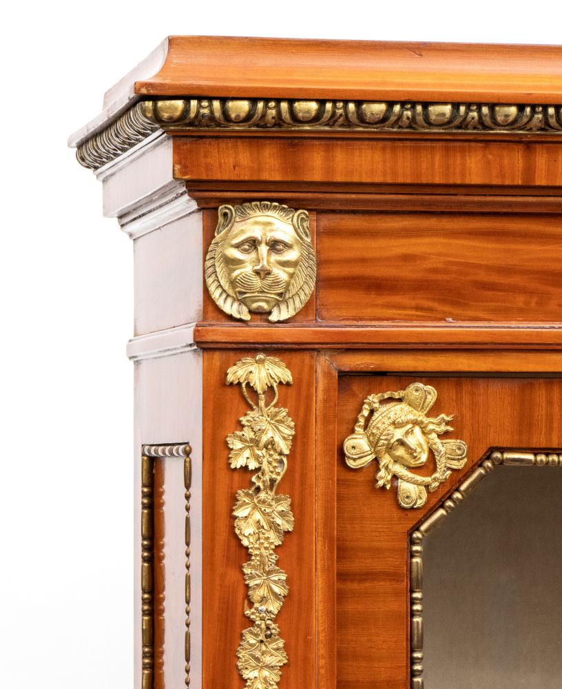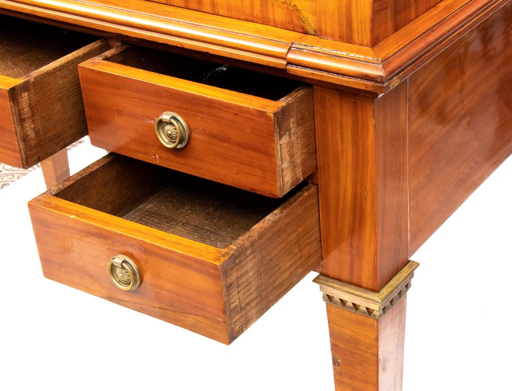 secretaire a rullo con alzata a vetrina, con applicazioni in bronzo dorato di gusto neoclassico. La parte superiore presenta due ante vetrate con profili smussati e interni con ripiani, coronata da cornice modanata e fregi dorati. La parte inferiore è composta da un piano scrittoio celato da serrandina a rullo, decorata con motivi floreali e greche in bronzo dorato. Nella parte sottostante ordine di 5 cassetti con pomelli di ottone. Il cassetto centrale si apre con pulsante segreto posto sotto il montante inferiore del cassetto centrale. Gambe tronco piramidali scanalate con terminali e capitelli in bronzo dorato. Firmato Maple&Co con etichetta originale "Maple's Depositary" applicata sul retro della fodera.