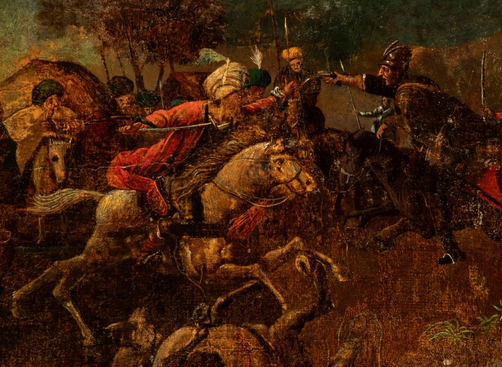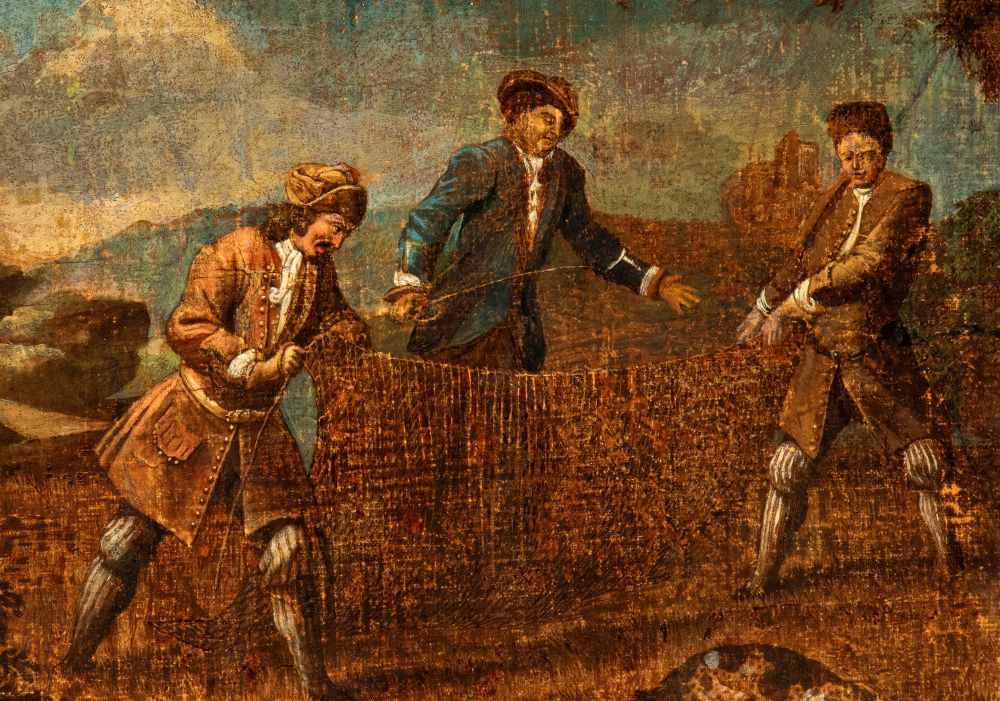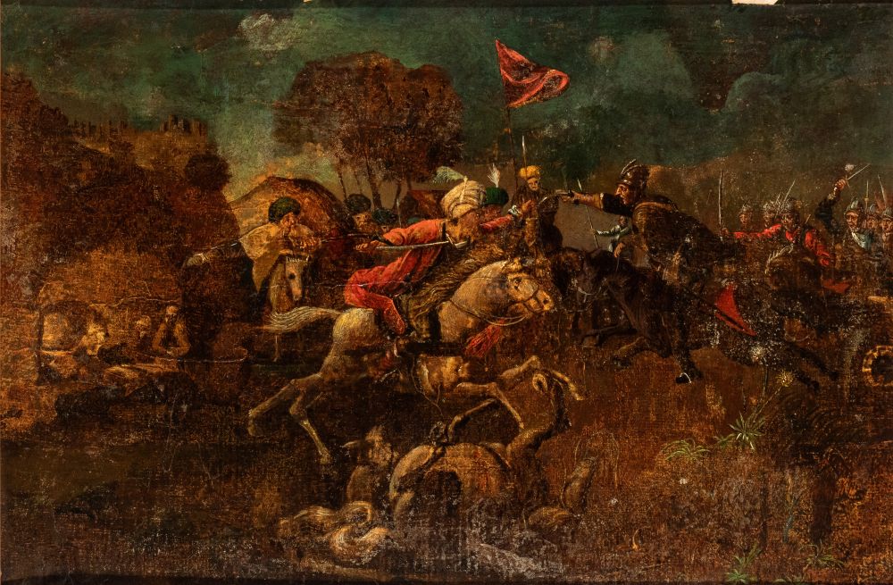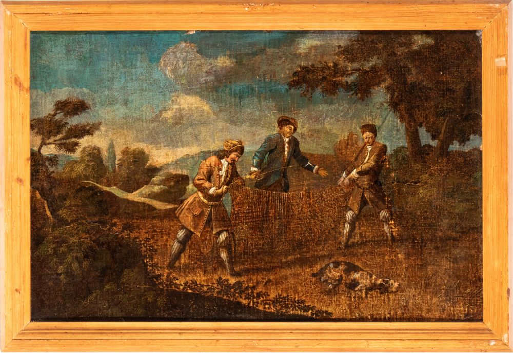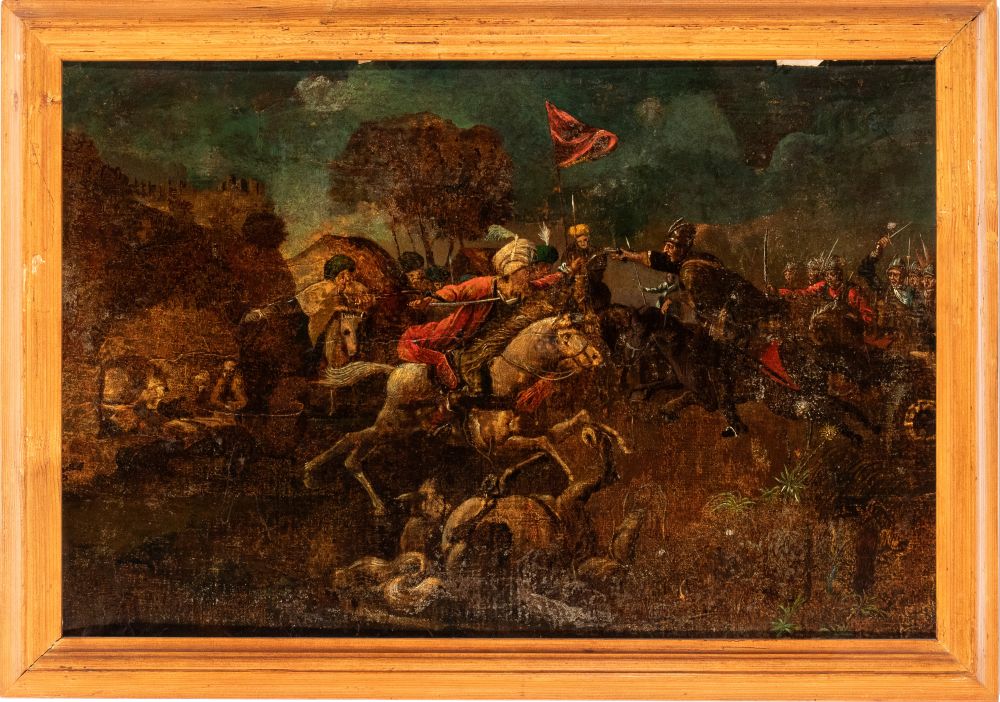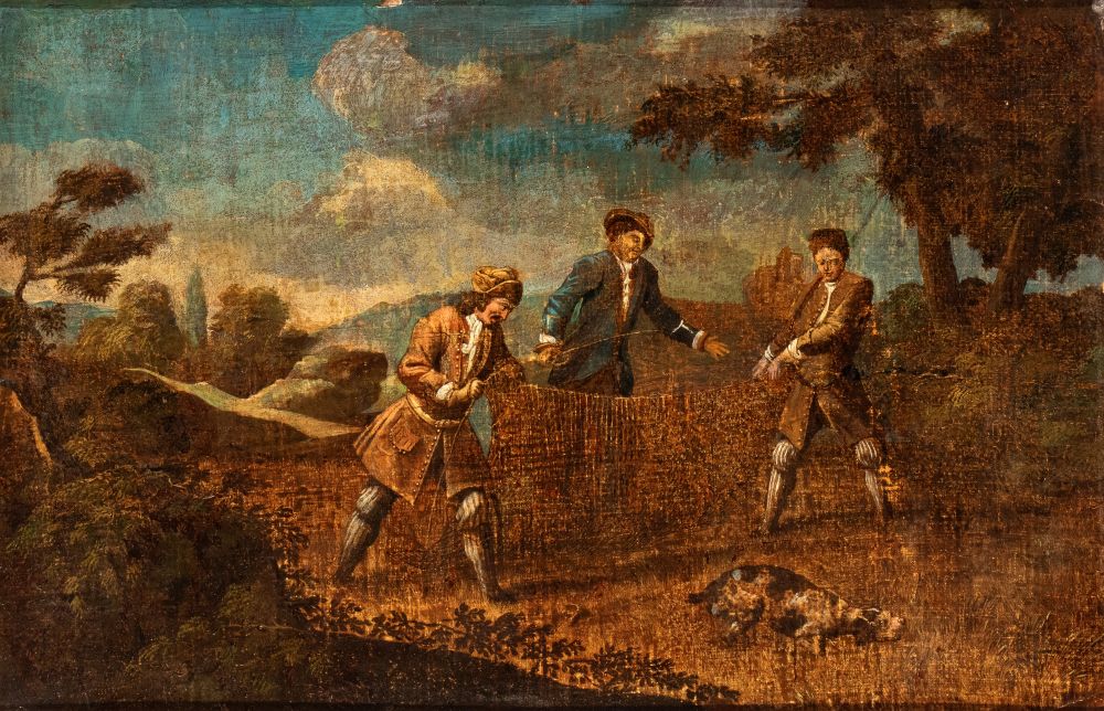 Il primo dipinto raffigura una concitata scena di battaglia: in primo piano, un cavaliere con un vistoso turbante bianco, identificabile come un soldato ottomano, cavalca un destriero grigio in un momento di scontro frontale. Il secondo dipinto, in netto contrasto tematico, presenta una scena bucolica di genere: tre figure maschili in abiti settecenteschi sono ritratte mentre manovrano una rete da uccellagione in un paesaggio campestre. Presentare dipinti di soggetti diversi, una battaglia e una scena bucolica, o di caccia, come pendant era una pratica comune, creando un contrasto tra il combattimento e la tranquillità della vita rurale. Cornice lignea non coeva.