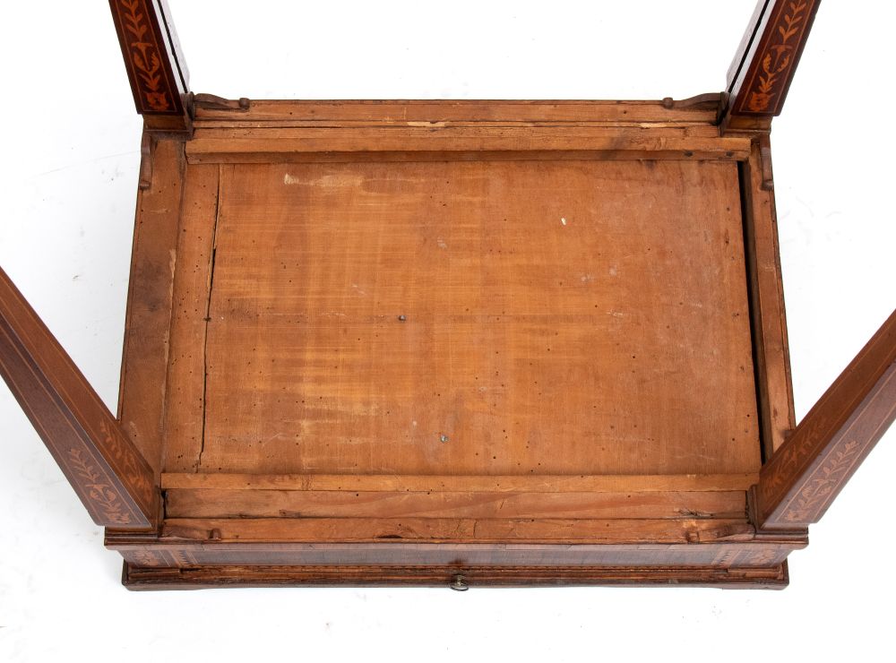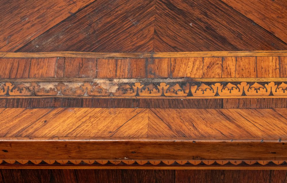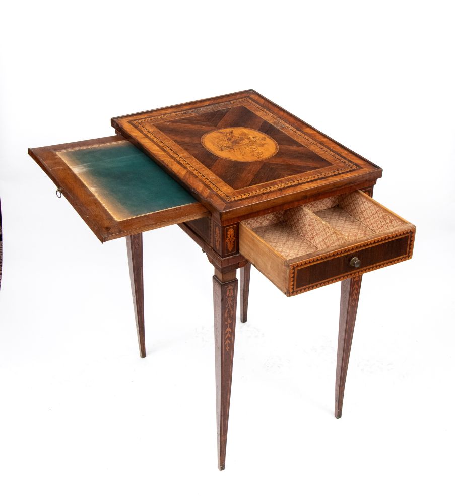in noce e legni esotici, finemente intarsiato alla maniera di Giuseppe Maggiolini in legni di frutto. Piano estraibile dal sotto piano e cassetto laterale, gambe tronco piramidali intarsiate a motivi floreali.