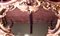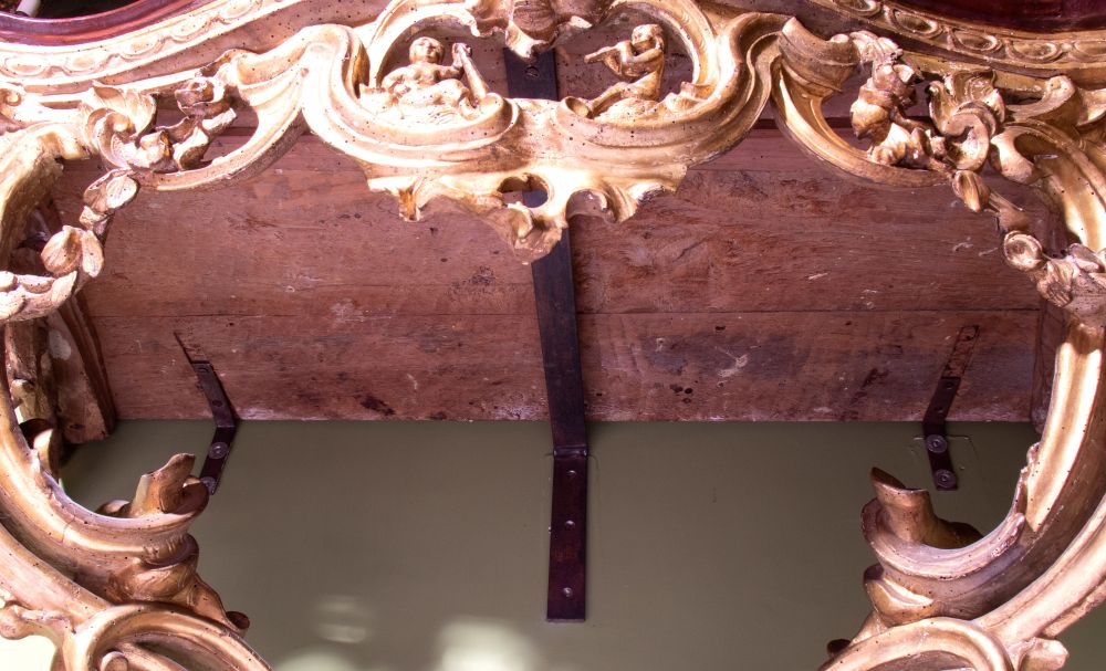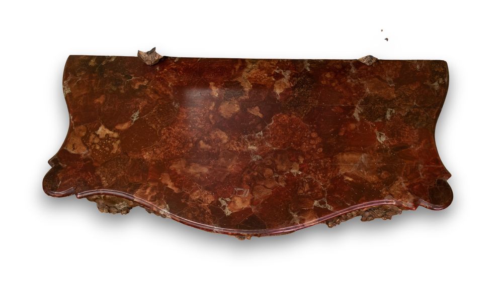 di gusto rococò veneziano, la specchiera presenta cornice sagomata arricchita da decori floreali, tralci fioriti e motivi a rocailles, con cimasa intagliata. Consolle con fascia frontale e gambe mosse, intagliata con volute. Motivi vegetali e putti, piano a finto marmo rosso.