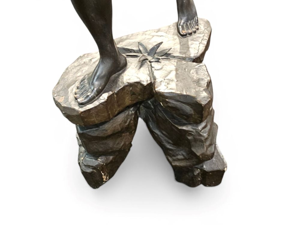 caratterizzato da ricca policromia con incarnato scuro lucido e veste finemente incisa e dorata.