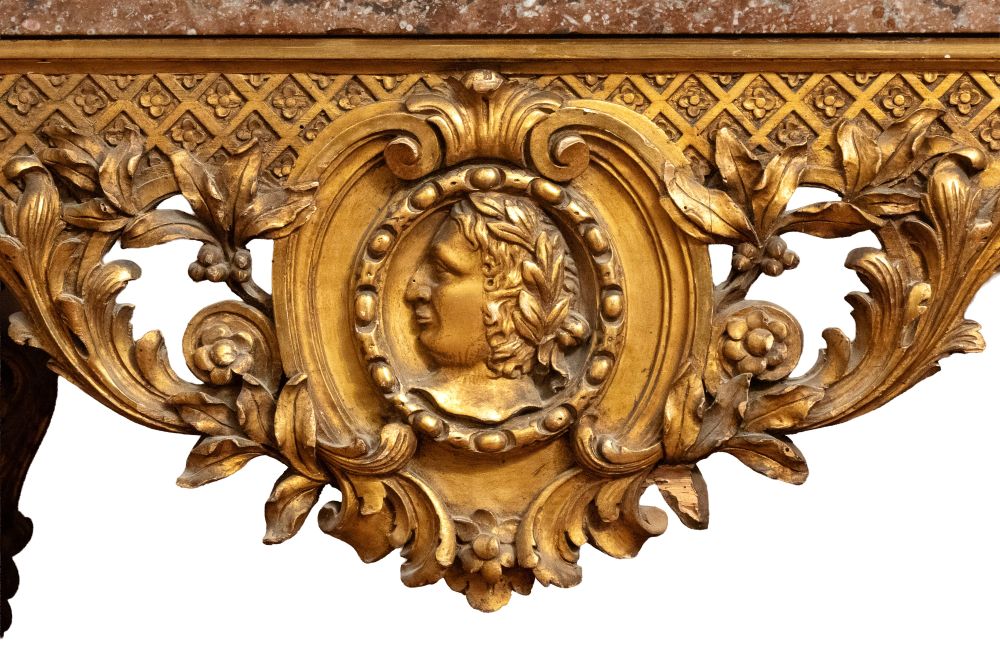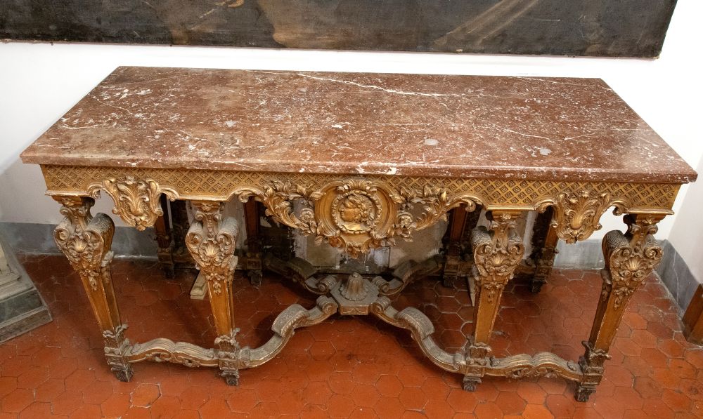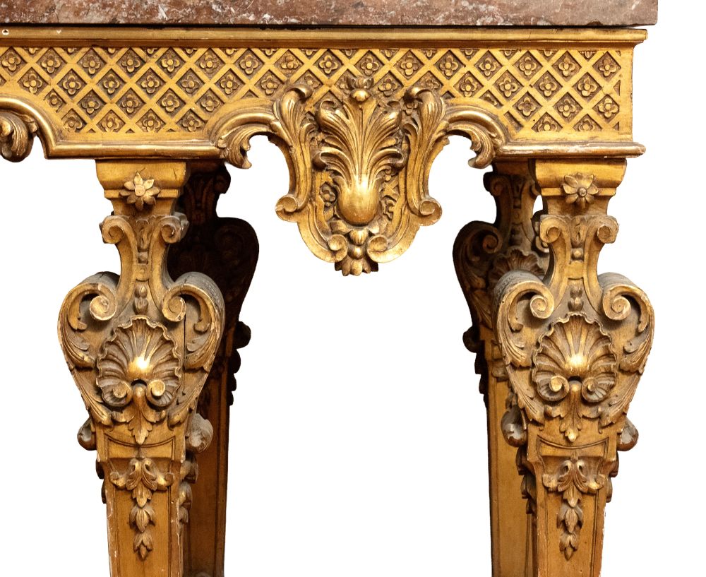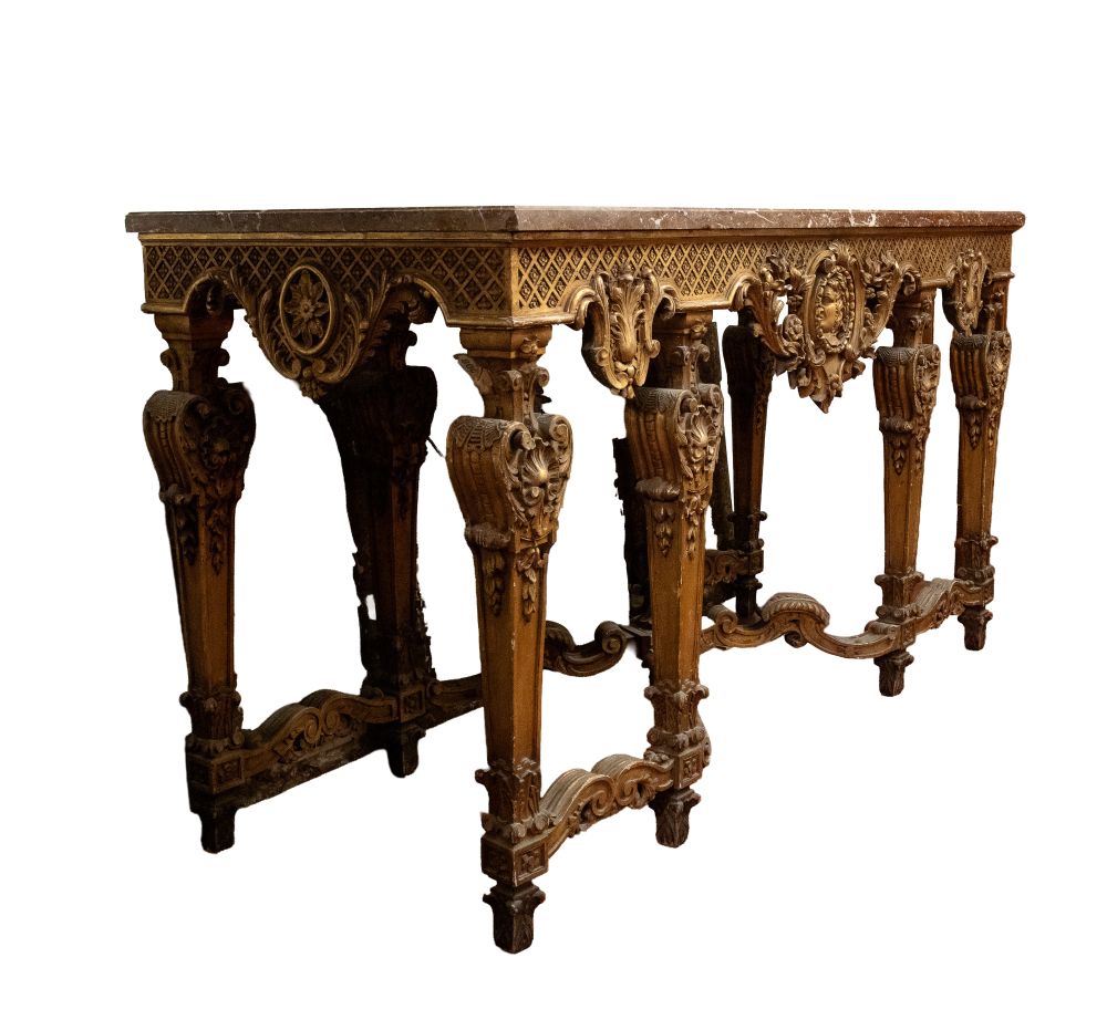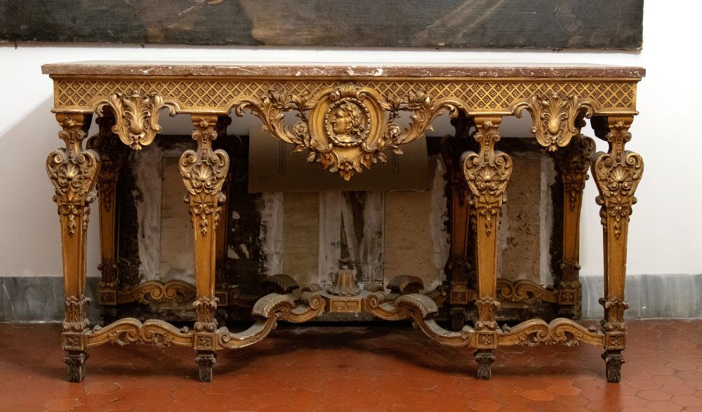 importante coppia di console a parete, caratterizzate da struttura architettonica con sei gambe anteriori e posteriori, riccamente scolpite con motivi fogliacei, volute e cartigli. Fascia sottopiano decorata con motivo a losanghe e medaglioni centrali con profilo classico di testa maschile. Piano superiore in marmo sagomato.